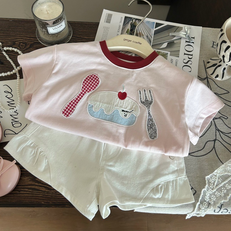 한국 아동복 2025 신설 여름 여아 수놓은 반팔 티셔츠 어린이 올매치 화이트 반바지 투피스 패셔너블 세트