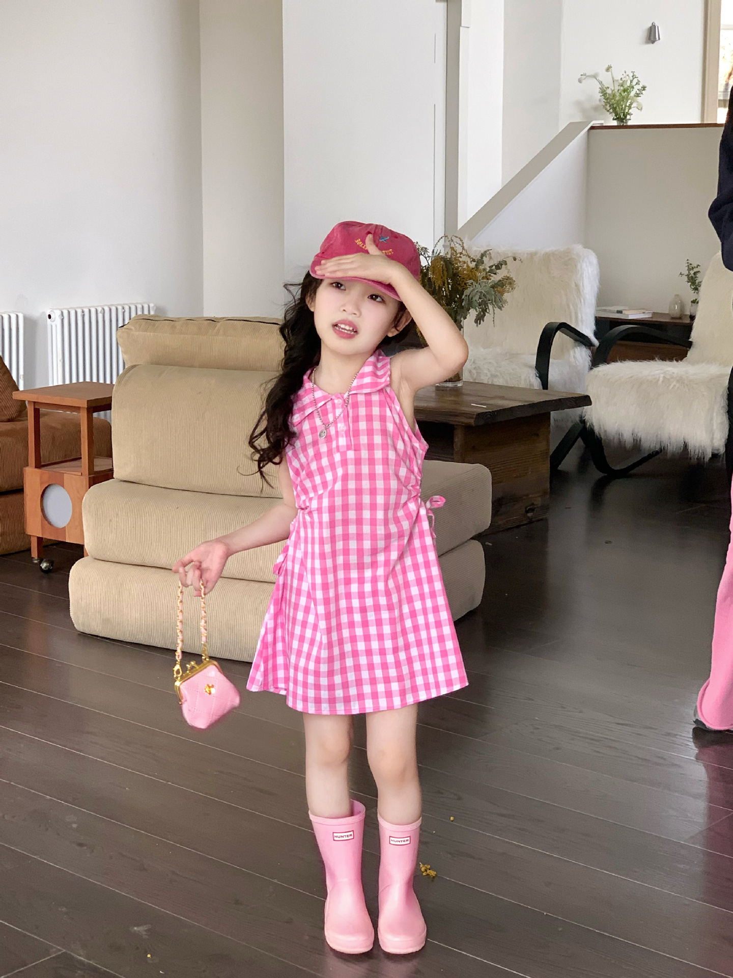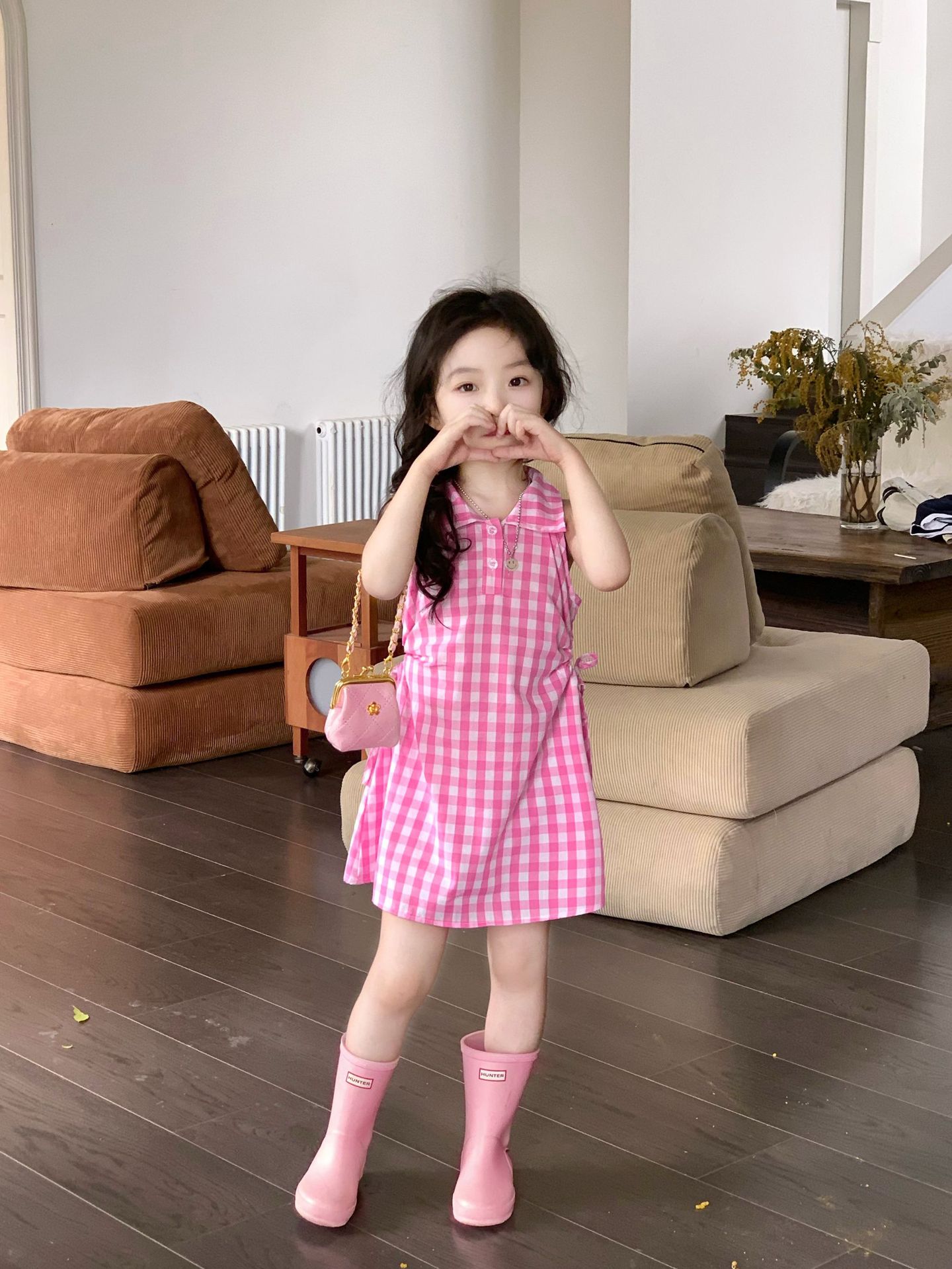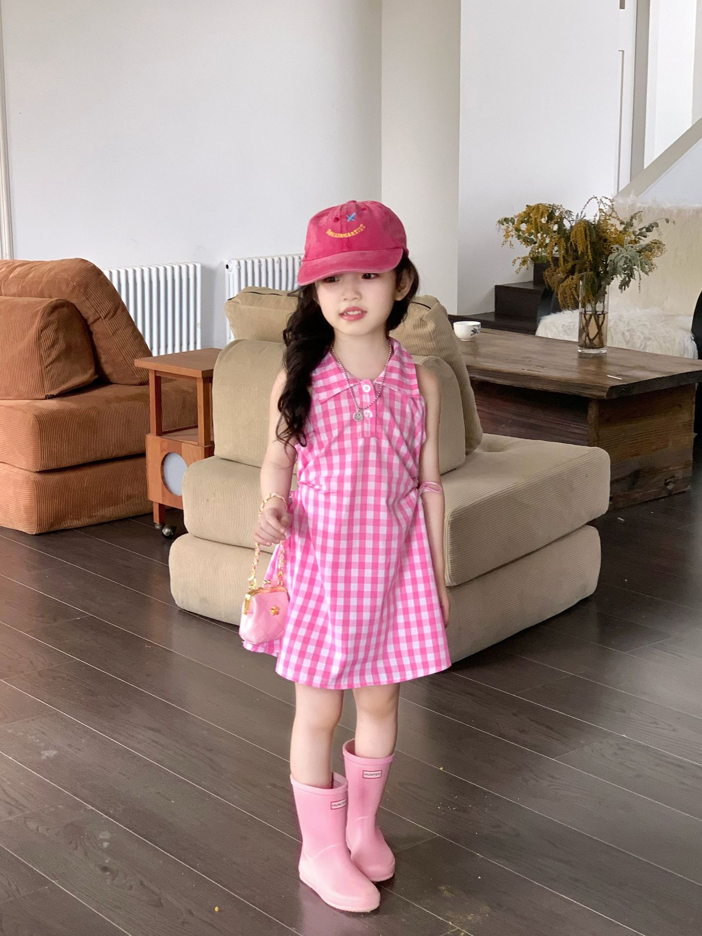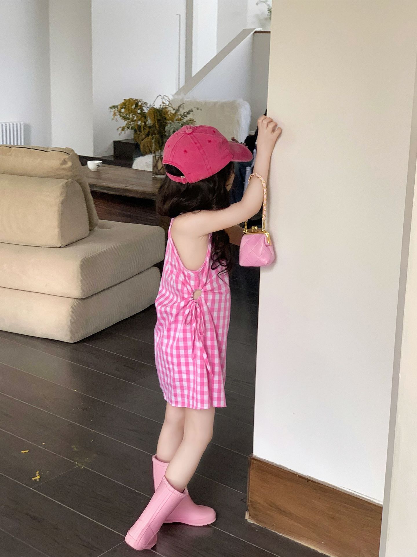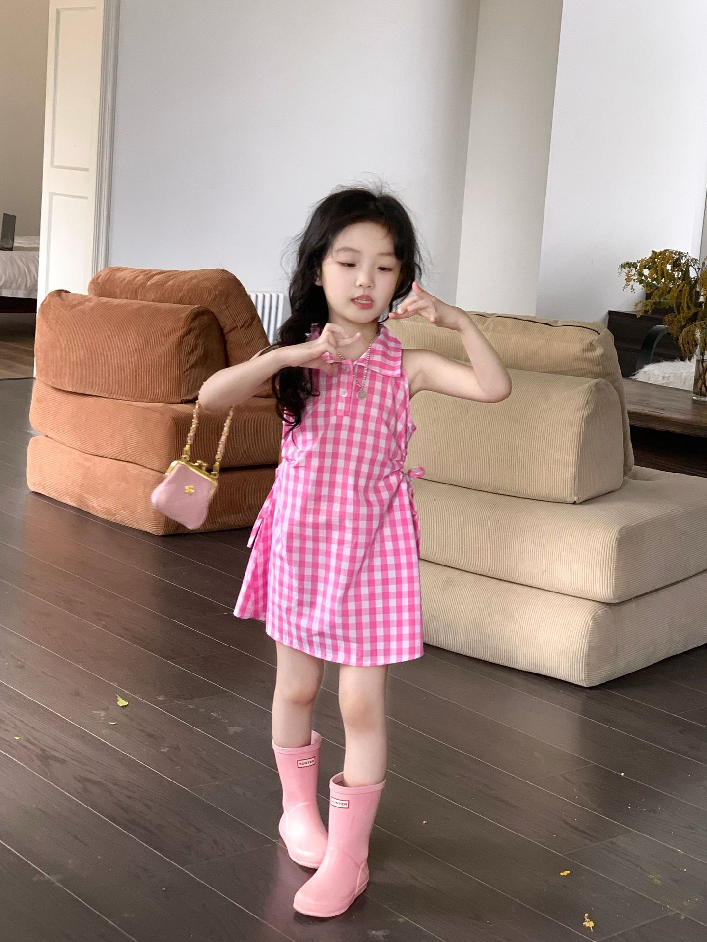여아 원피스 여름 한국 스타일 세련된 디자인 여자 아기 핑크색 칼라 체크무늬스토어 가기