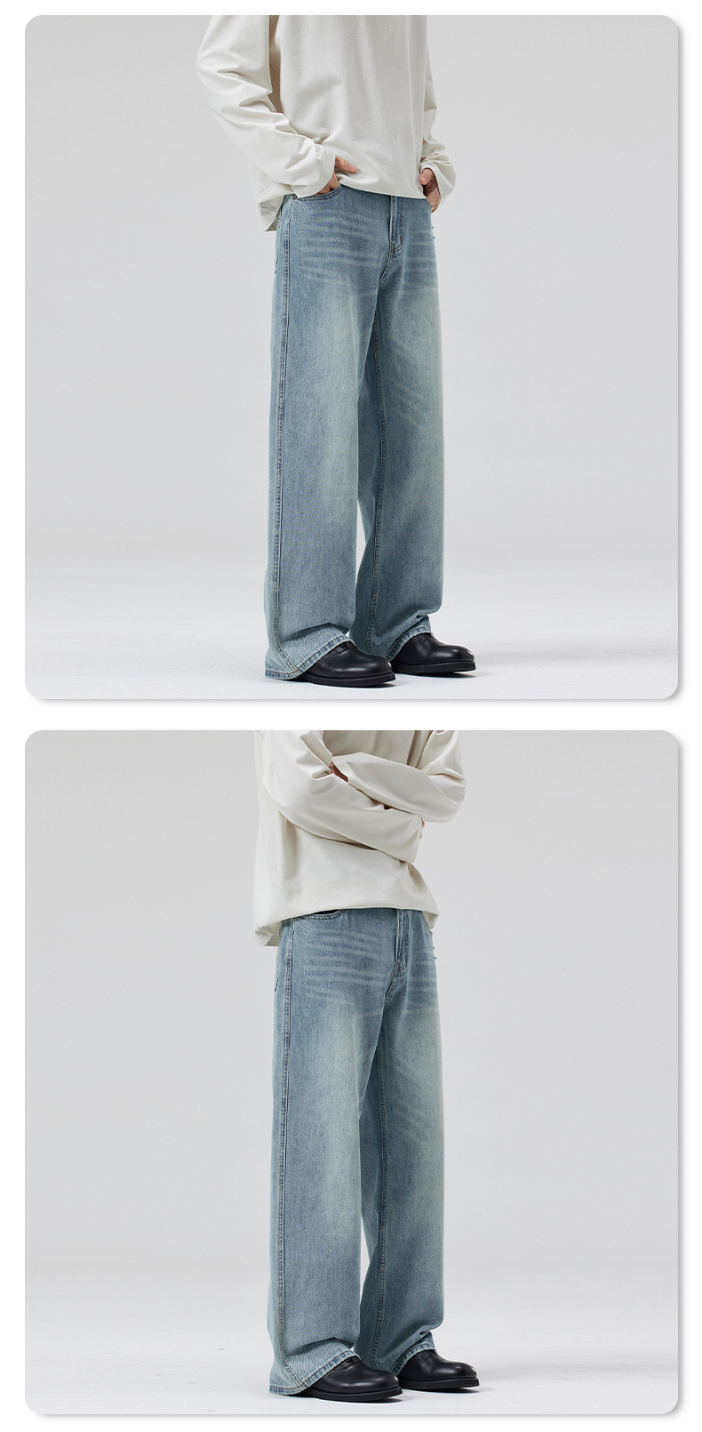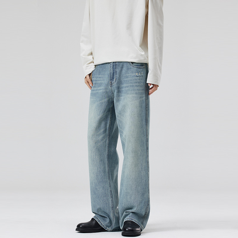 LKTM 남자 # 봄과 여름 라이트 블루 씻은 고양이 수염 청바지 남녀 트렌디 올매치 루즈 스트레이트 바지