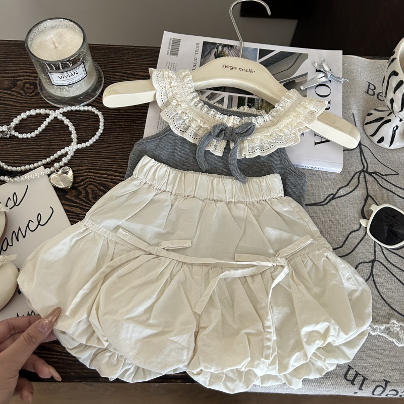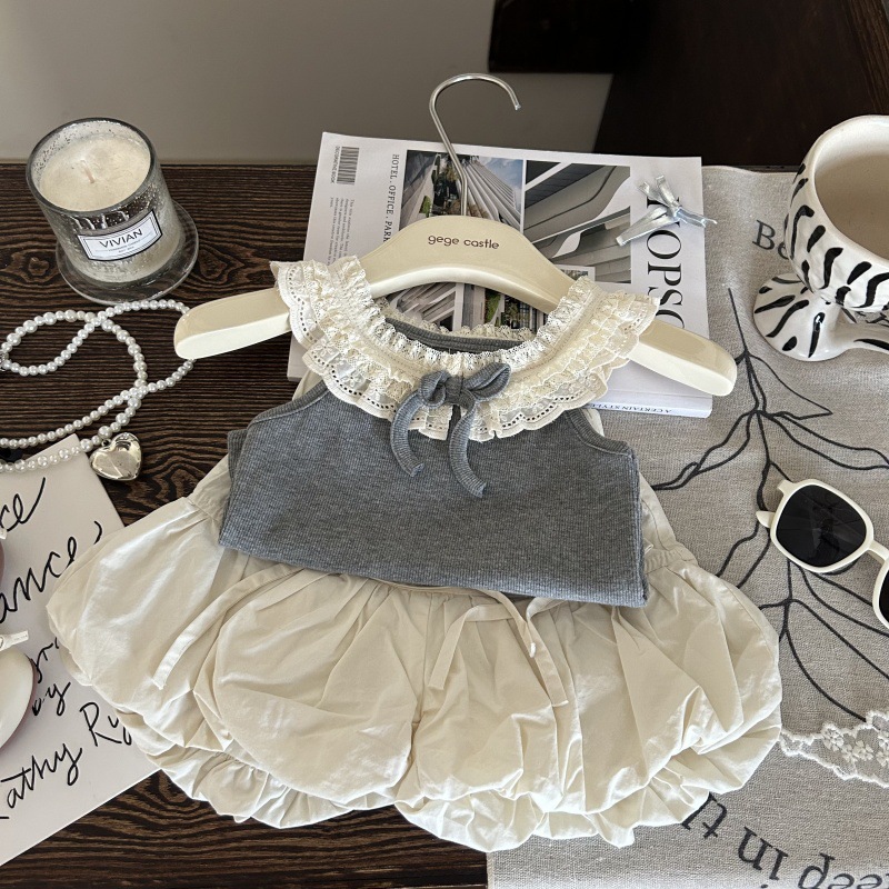 정리 세일, 환불 및 교환 불가 [합리적인 주문] 여아 레이스 칼라 레이스 조끼 + 리본 버튼 반바지스토어 가기