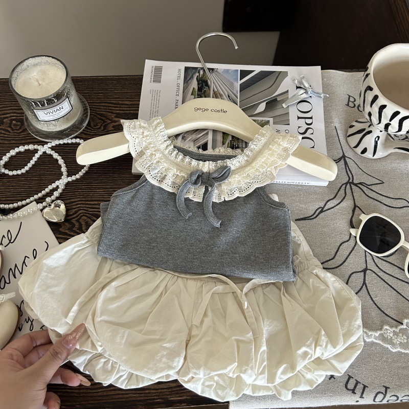 정리 세일, 환불 및 교환 불가 [합리적인 주문] 여아 레이스 칼라 레이스 조끼 + 리본 버튼 반바지