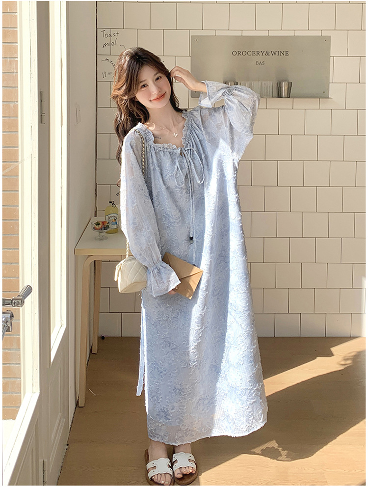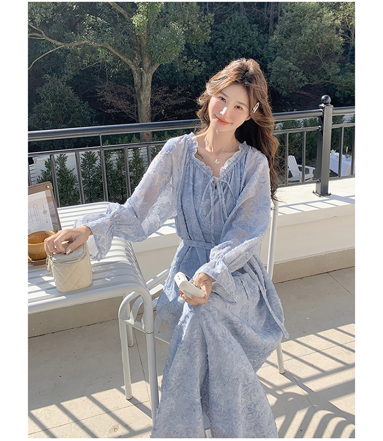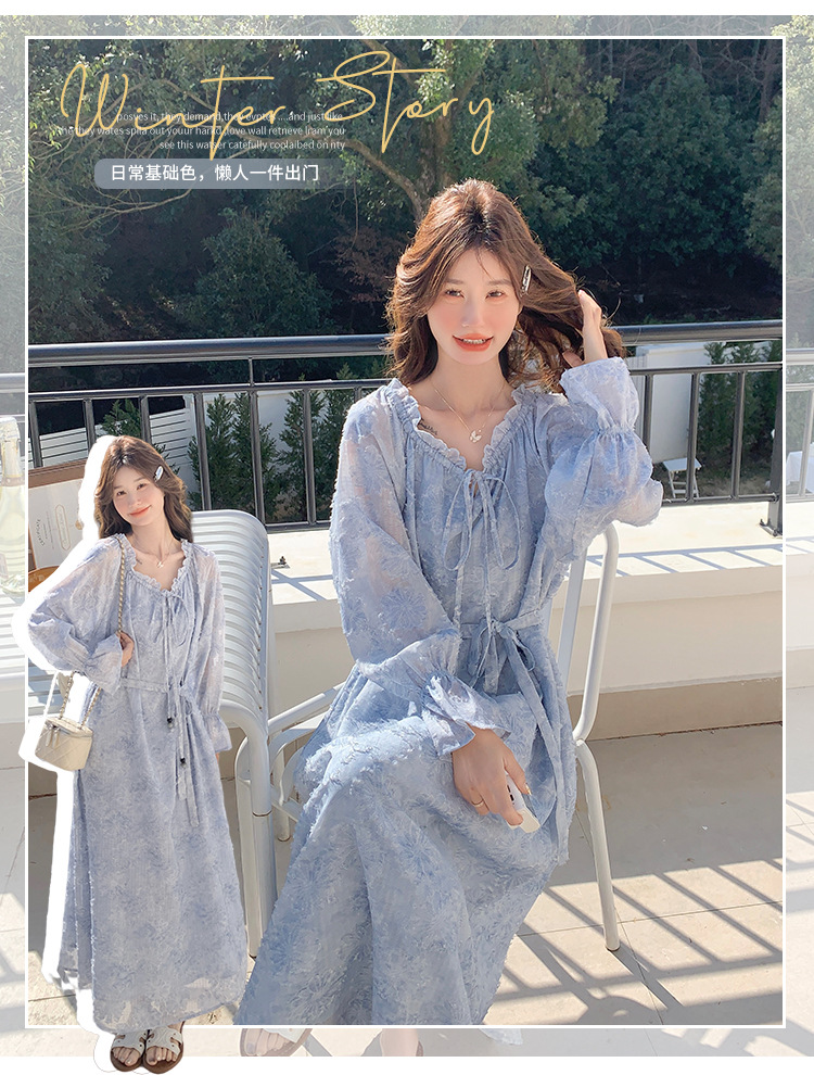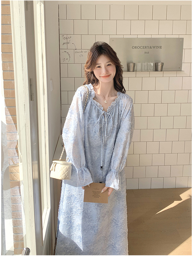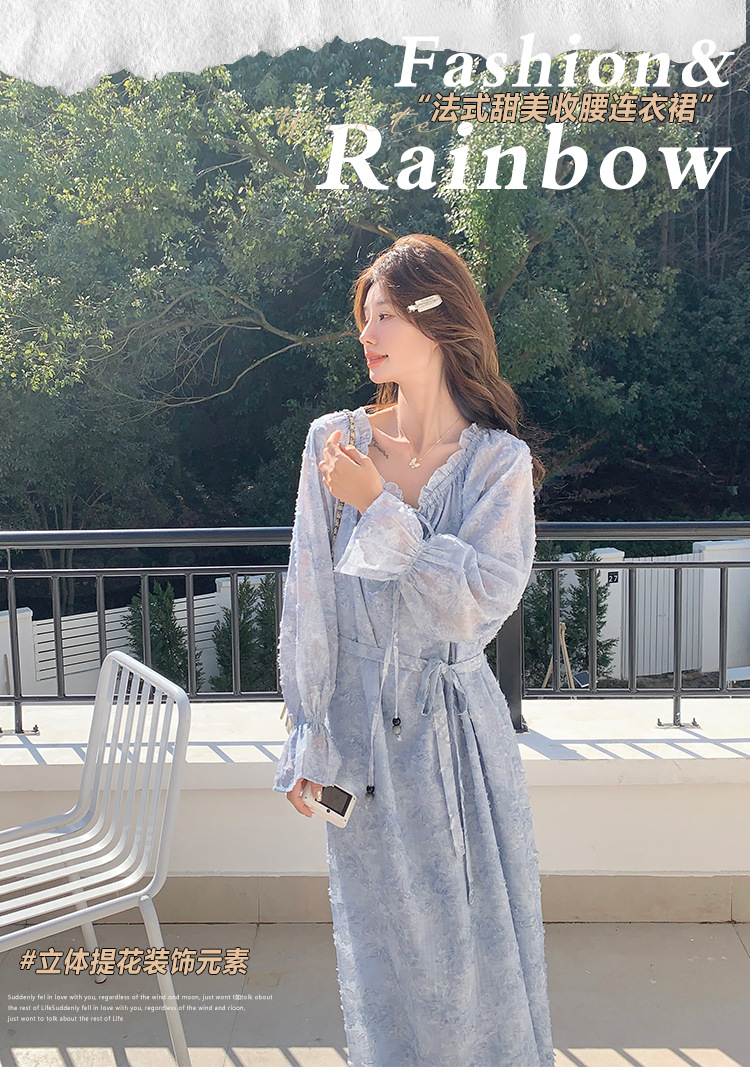 프랑스 레트로 블루 원피스 여성의 2025 봄 새로운 모리 스타일 인쇄 우아한 웨이스트 슬리밍 긴 소매 스커트스토어 가기