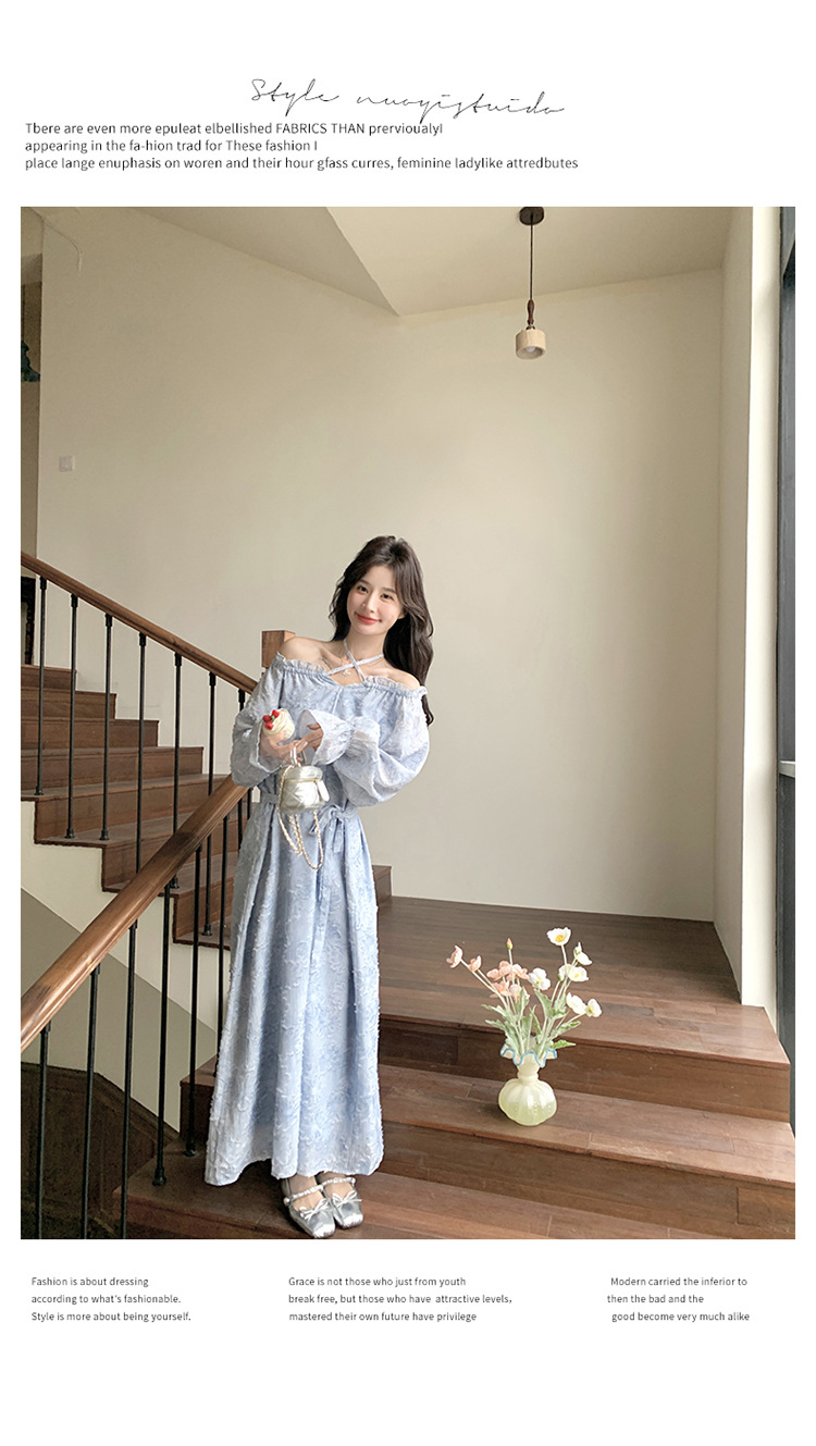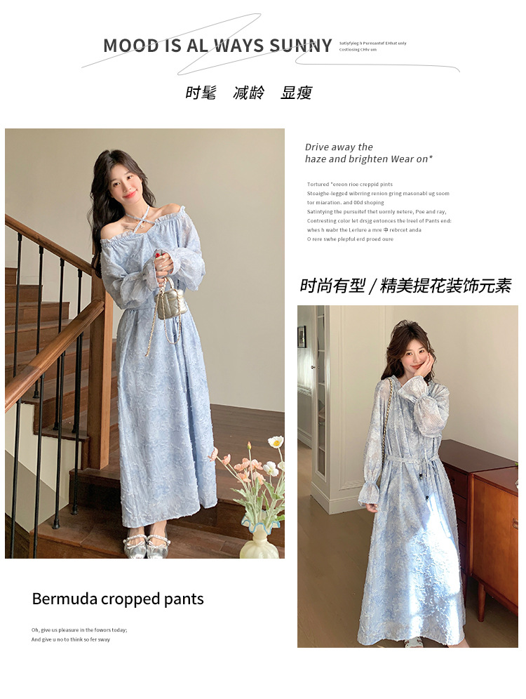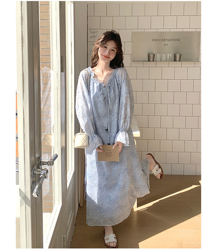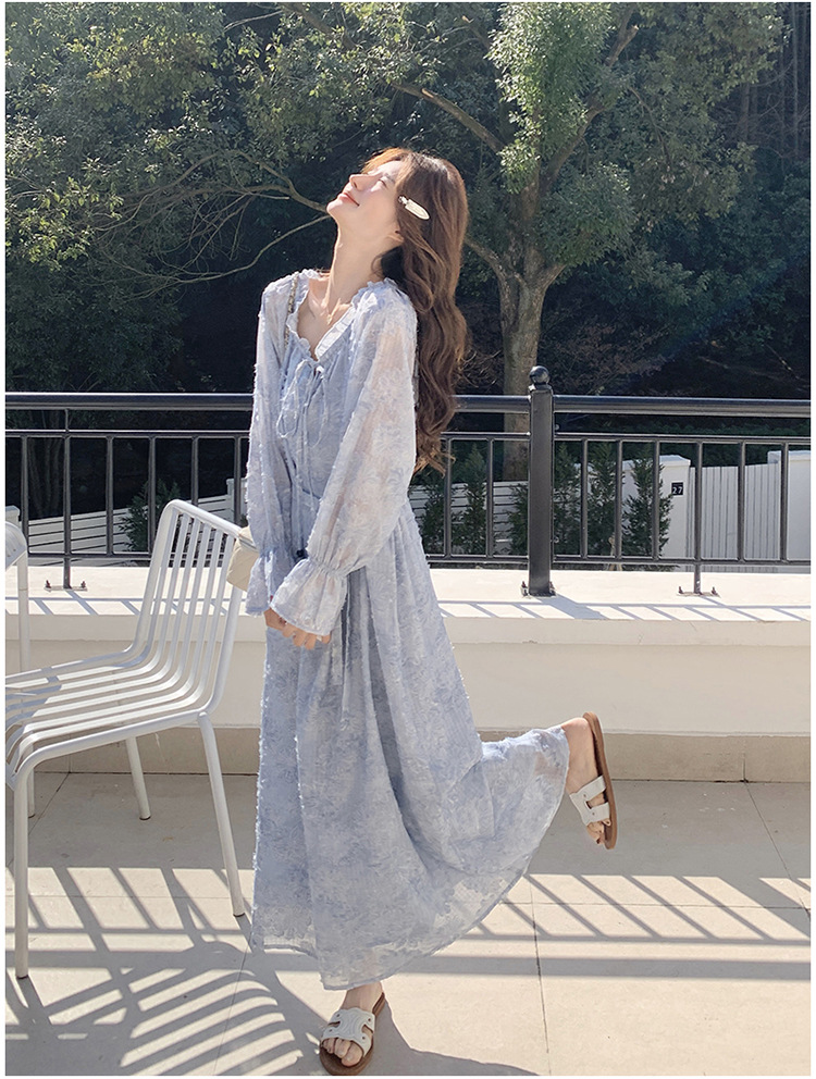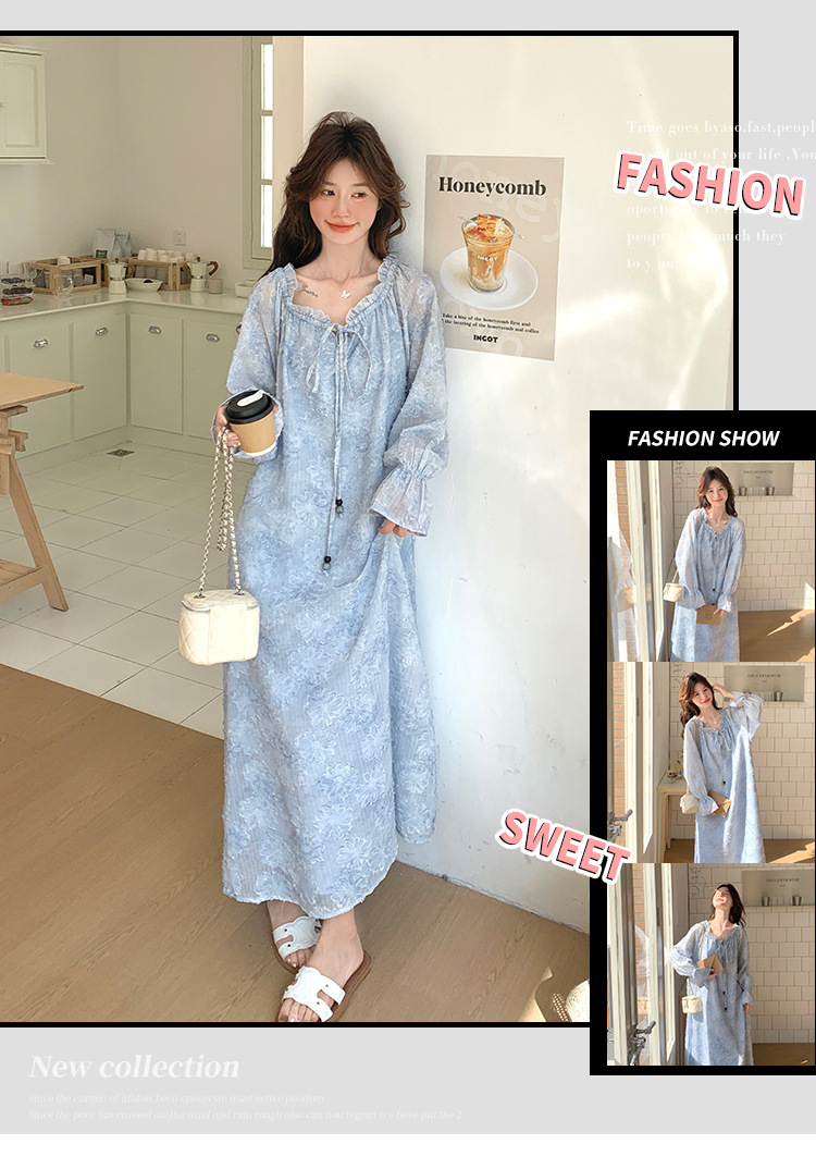 프랑스 레트로 블루 원피스 여성의 2025 봄 새로운 모리 스타일 인쇄 우아한 웨이스트 슬리밍 긴 소매 스커트스토어 가기