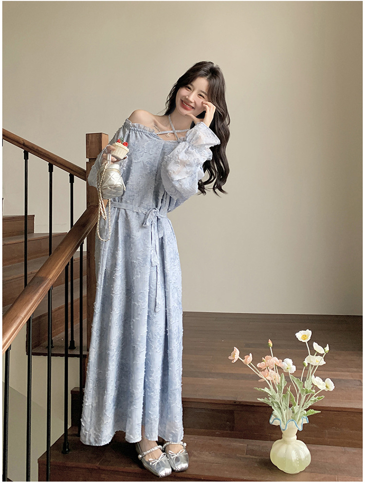 프랑스 레트로 블루 원피스 여성의 2025 봄 새로운 모리 스타일 인쇄 우아한 웨이스트 슬리밍 긴 소매 스커트