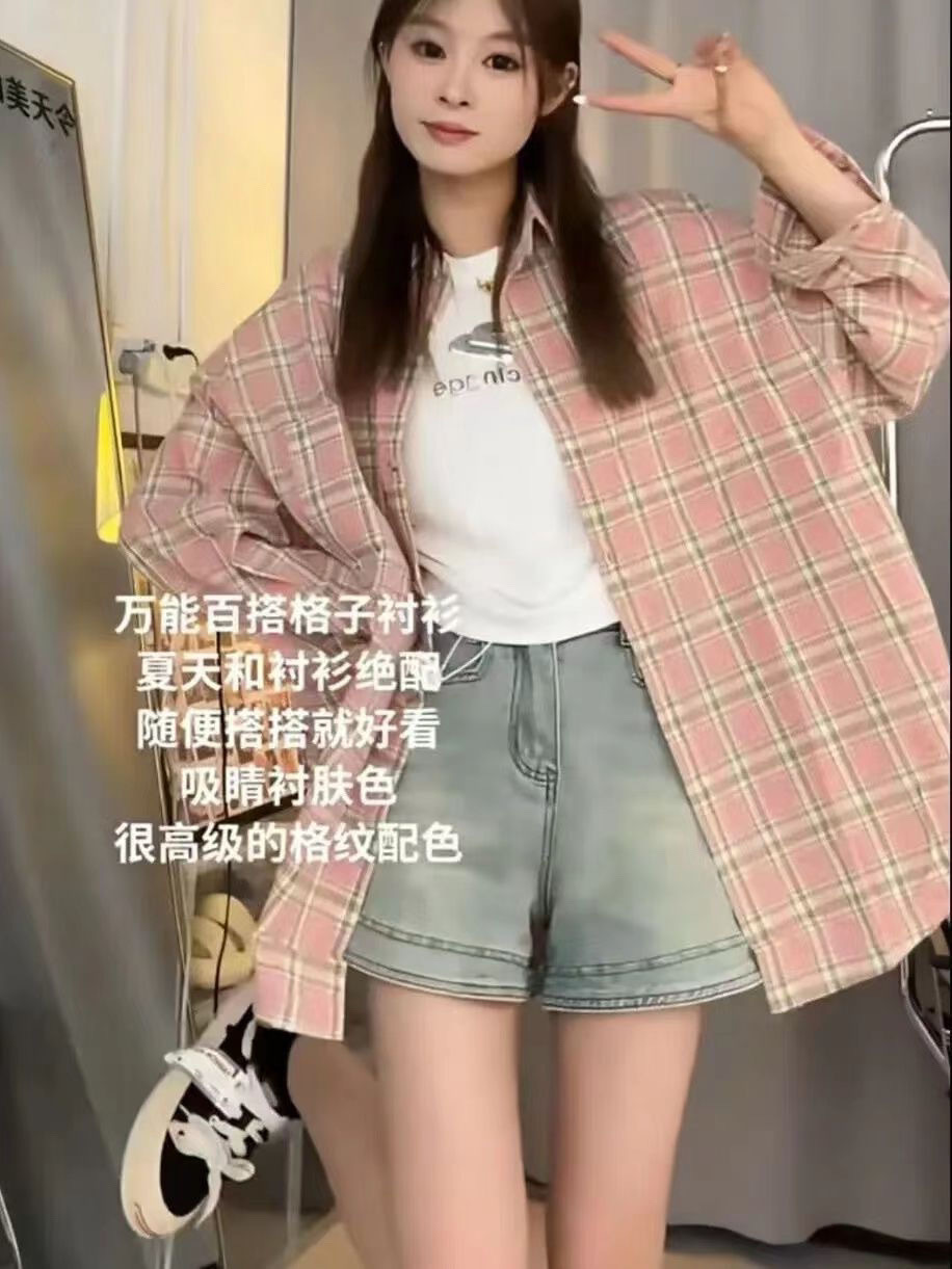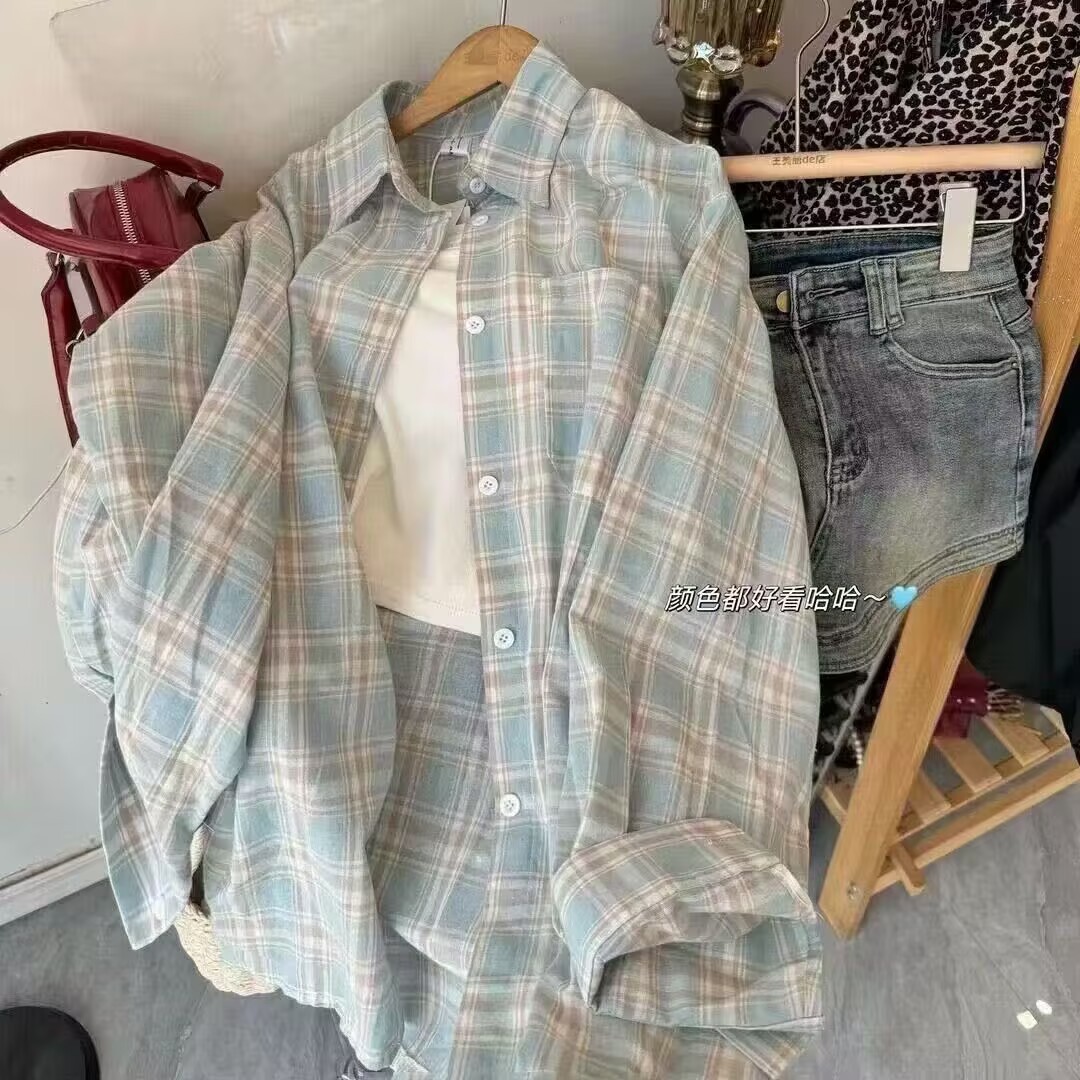 [재고] 미국 격자 무늬 느슨한 셔츠 게으른 캐주얼 느슨한 긴 셔츠 긴 소매 코트 탑
