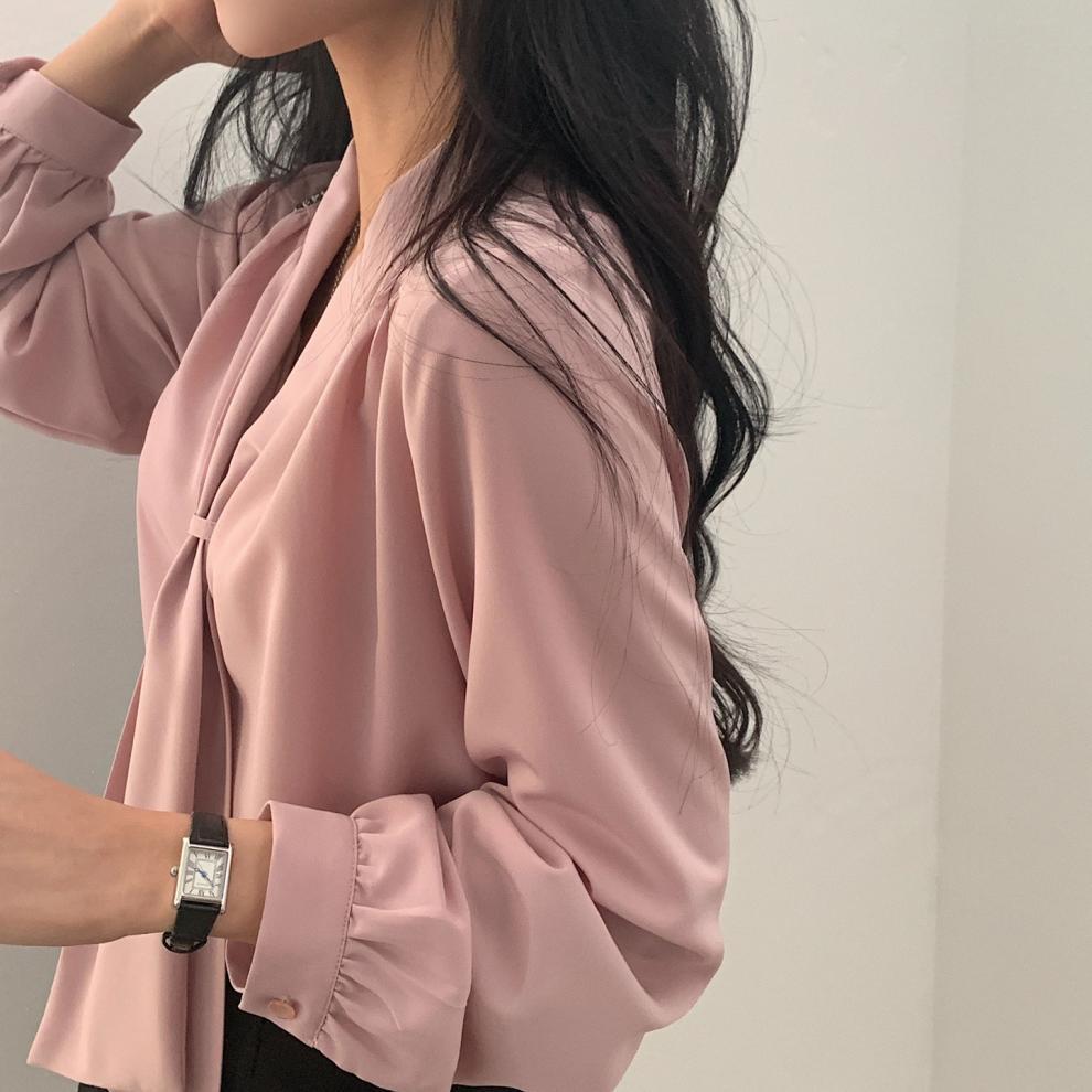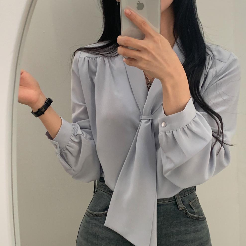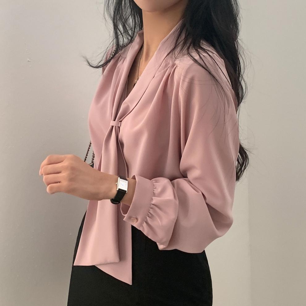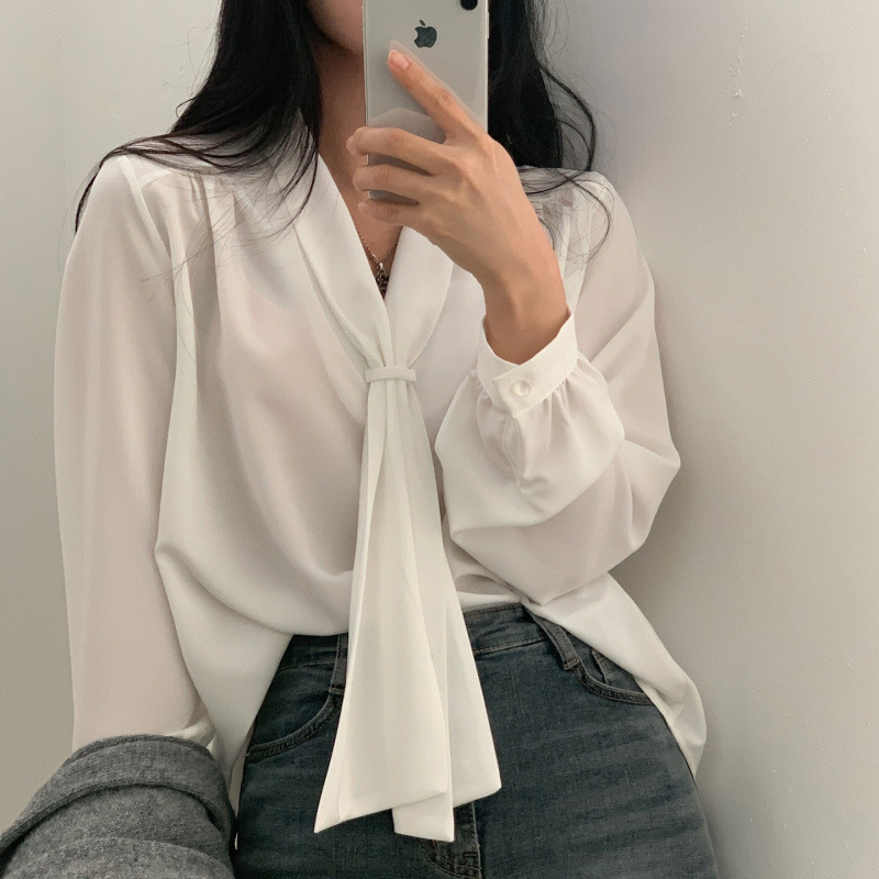 한국 인 봄 프랑스 틈새 디자인 넥타이 V-Neck 느슨한 풀오버 긴팔베이스 쉬폰 셔츠 탑스토어 가기
