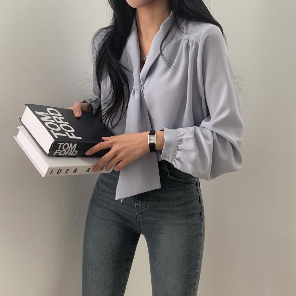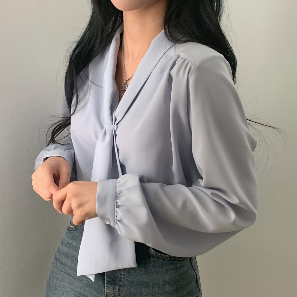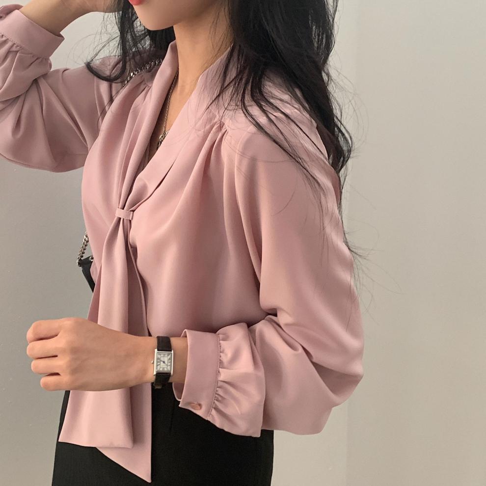 한국 인 봄 프랑스 틈새 디자인 넥타이 V-Neck 느슨한 풀오버 긴팔베이스 쉬폰 셔츠 탑스토어 가기