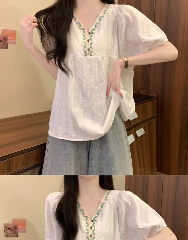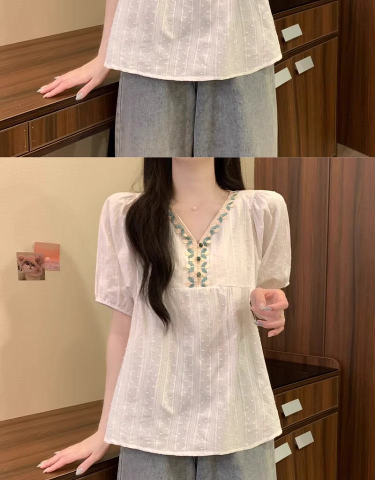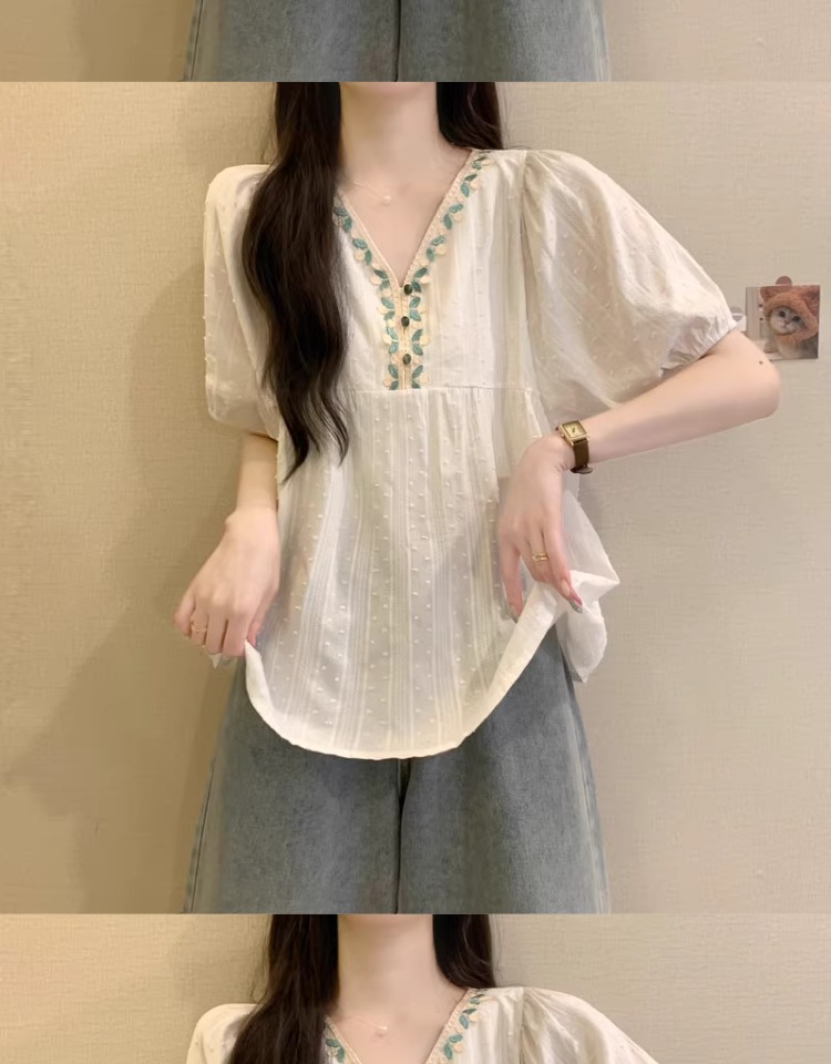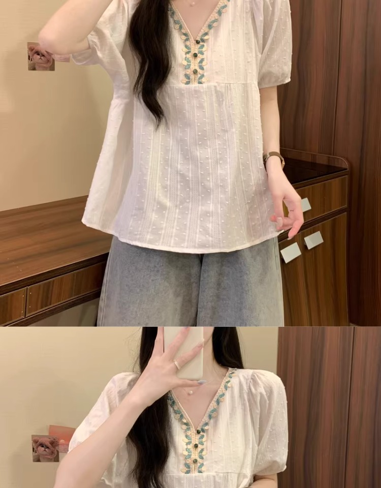 여름 신작 플러스 사이즈 뚱뚱한 mm 여성을 위한 프렌치 브이넥 쉬폰 반팔 셔츠 배를 커버하고 슬림한 베이비돌 셔츠 퍼프 슬리브 탑