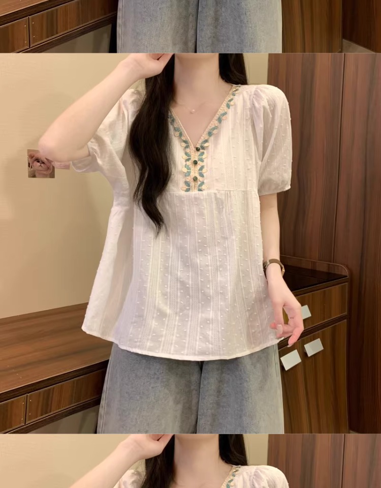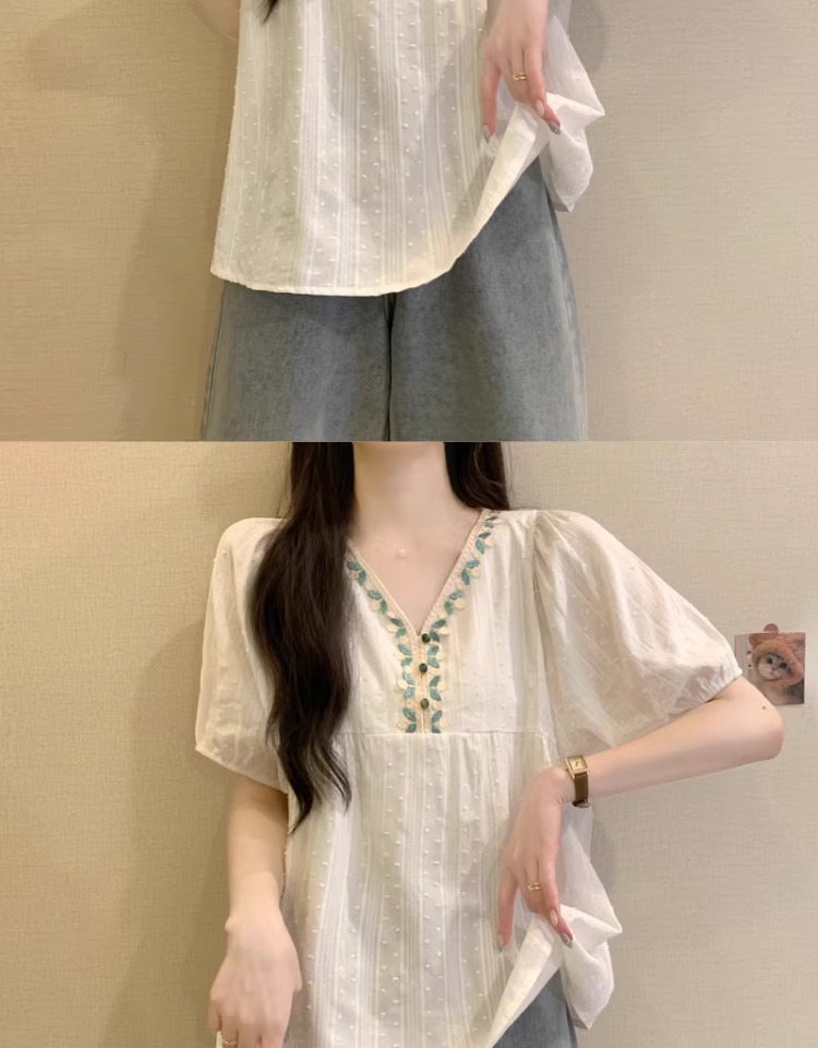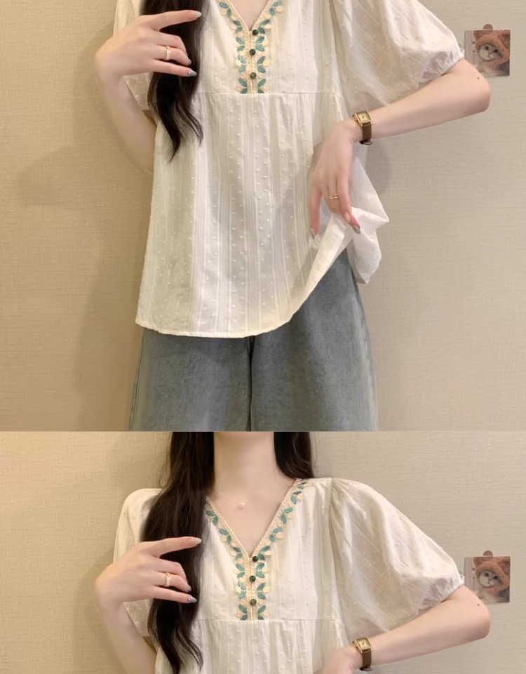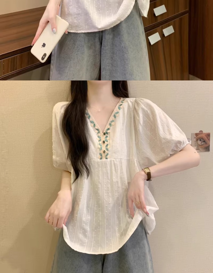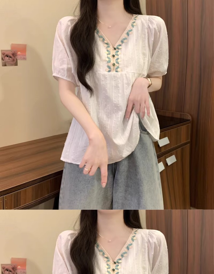 여름 신작 플러스 사이즈 뚱뚱한 mm 여성을 위한 프렌치 브이넥 쉬폰 반팔 셔츠 배를 커버하고 슬림한 베이비돌 셔츠 퍼프 슬리브 탑