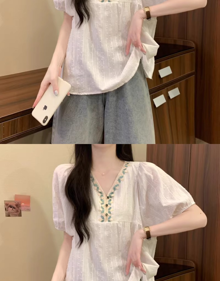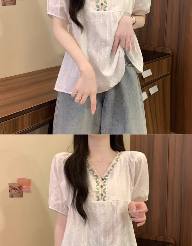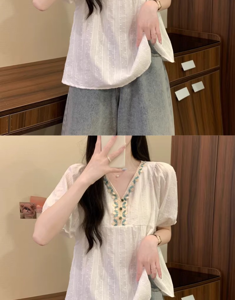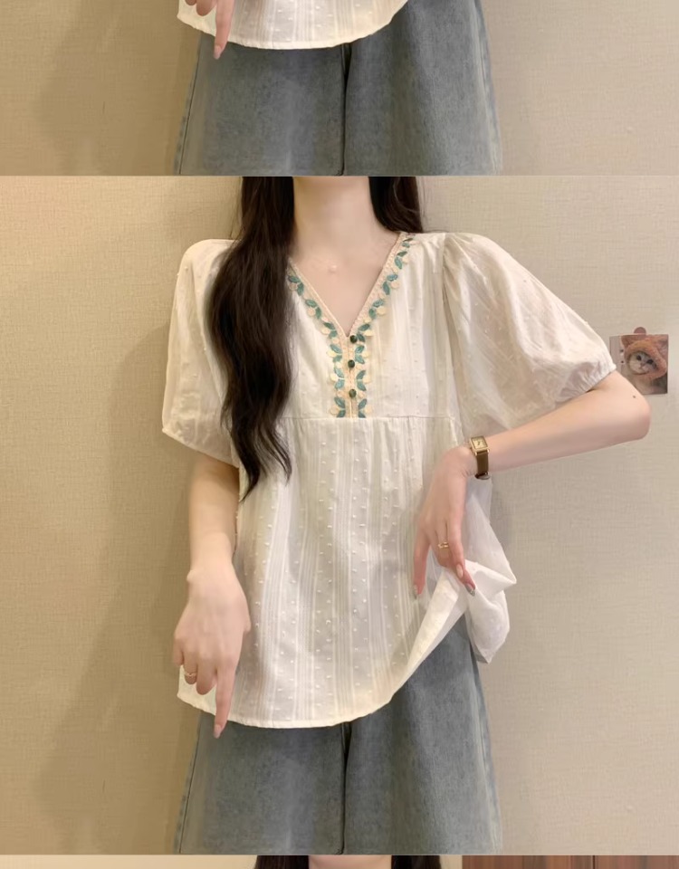 여름 신작 플러스 사이즈 뚱뚱한 mm 여성을 위한 프렌치 브이넥 쉬폰 반팔 셔츠 배를 커버하고 슬림한 베이비돌 셔츠 퍼프 슬리브 탑스토어 가기