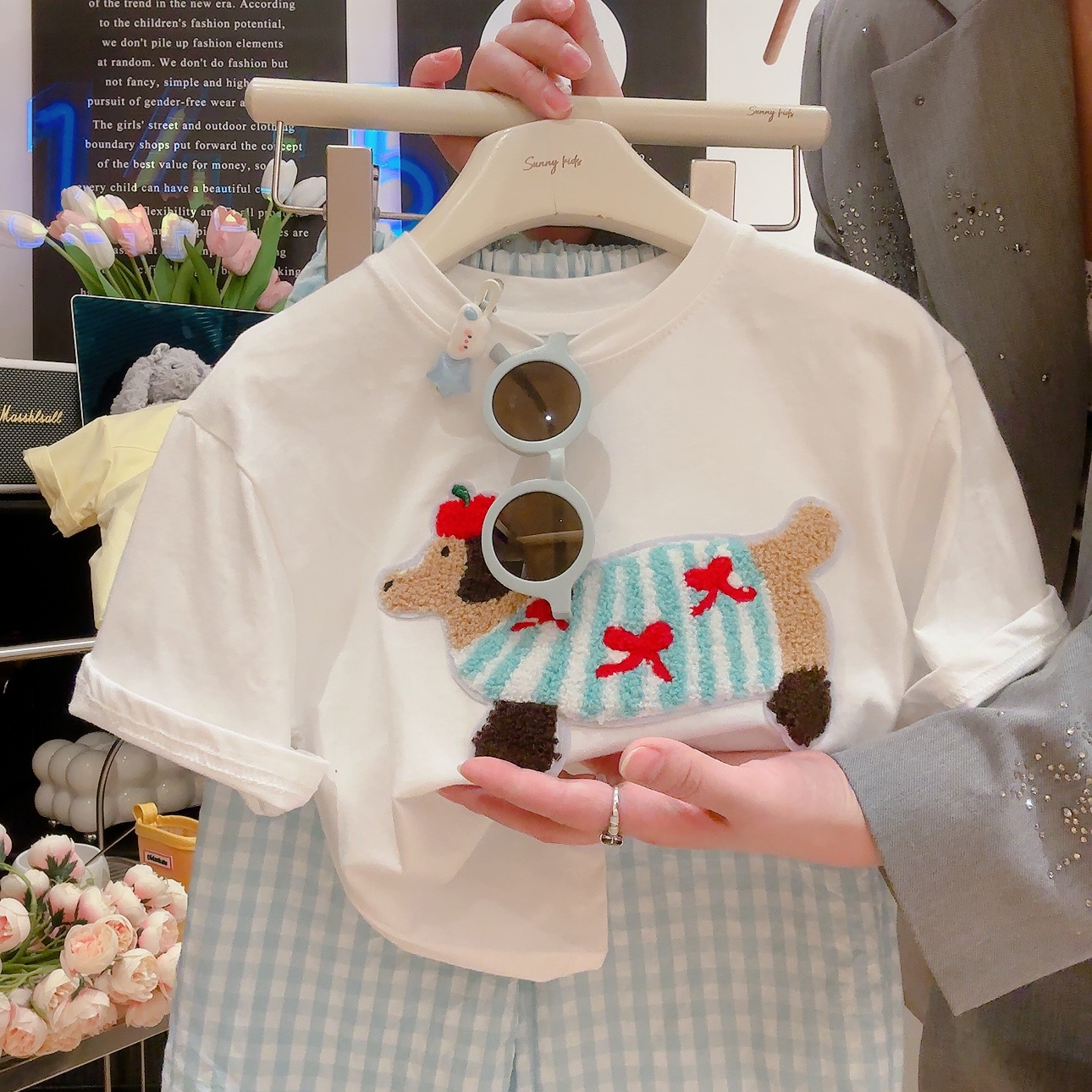 반팔 티셔츠 닥스 훈트 격자 무늬 바지 세트 여름 캐주얼 미국 인쇄 2025 여름 새로운 투피스 세트스토어 가기