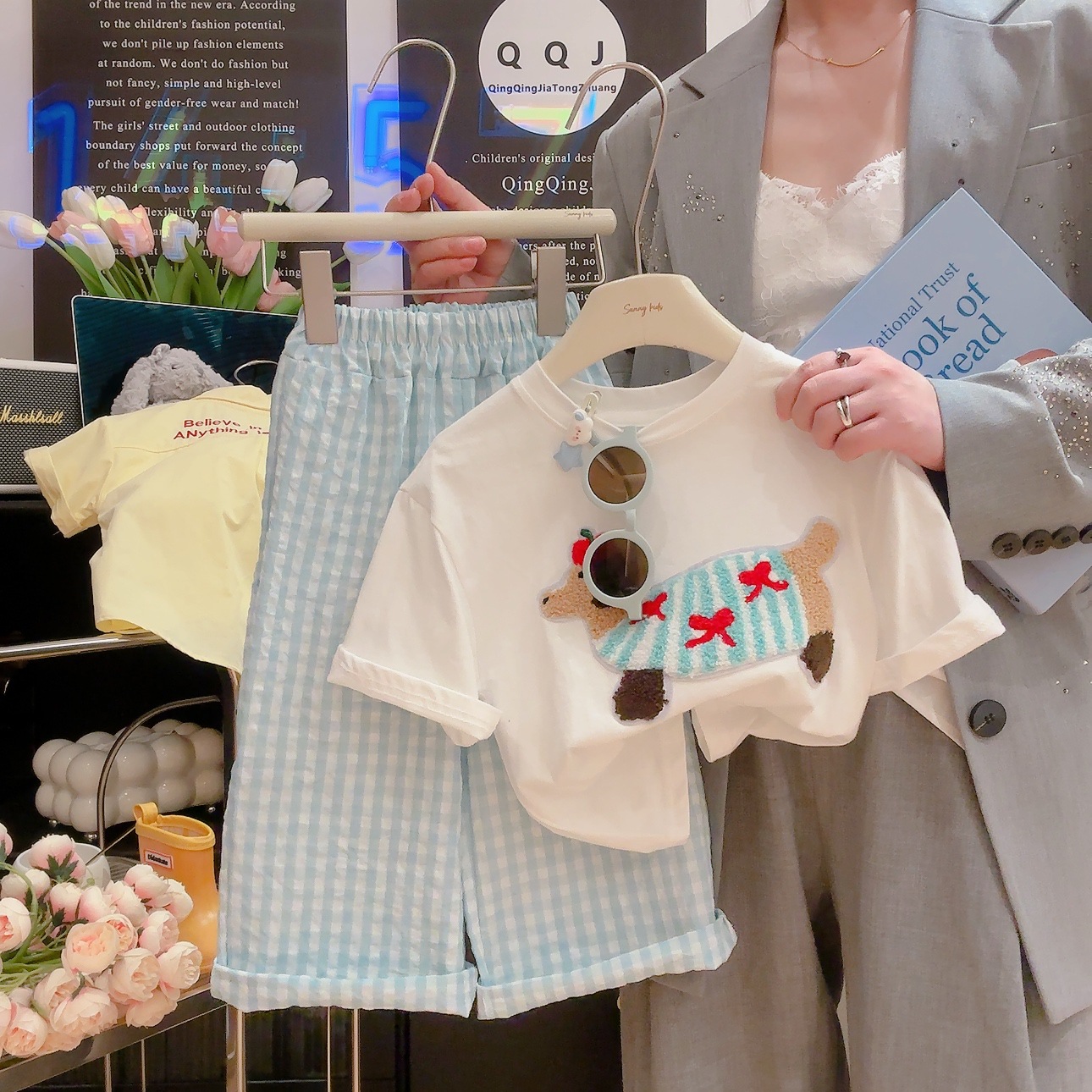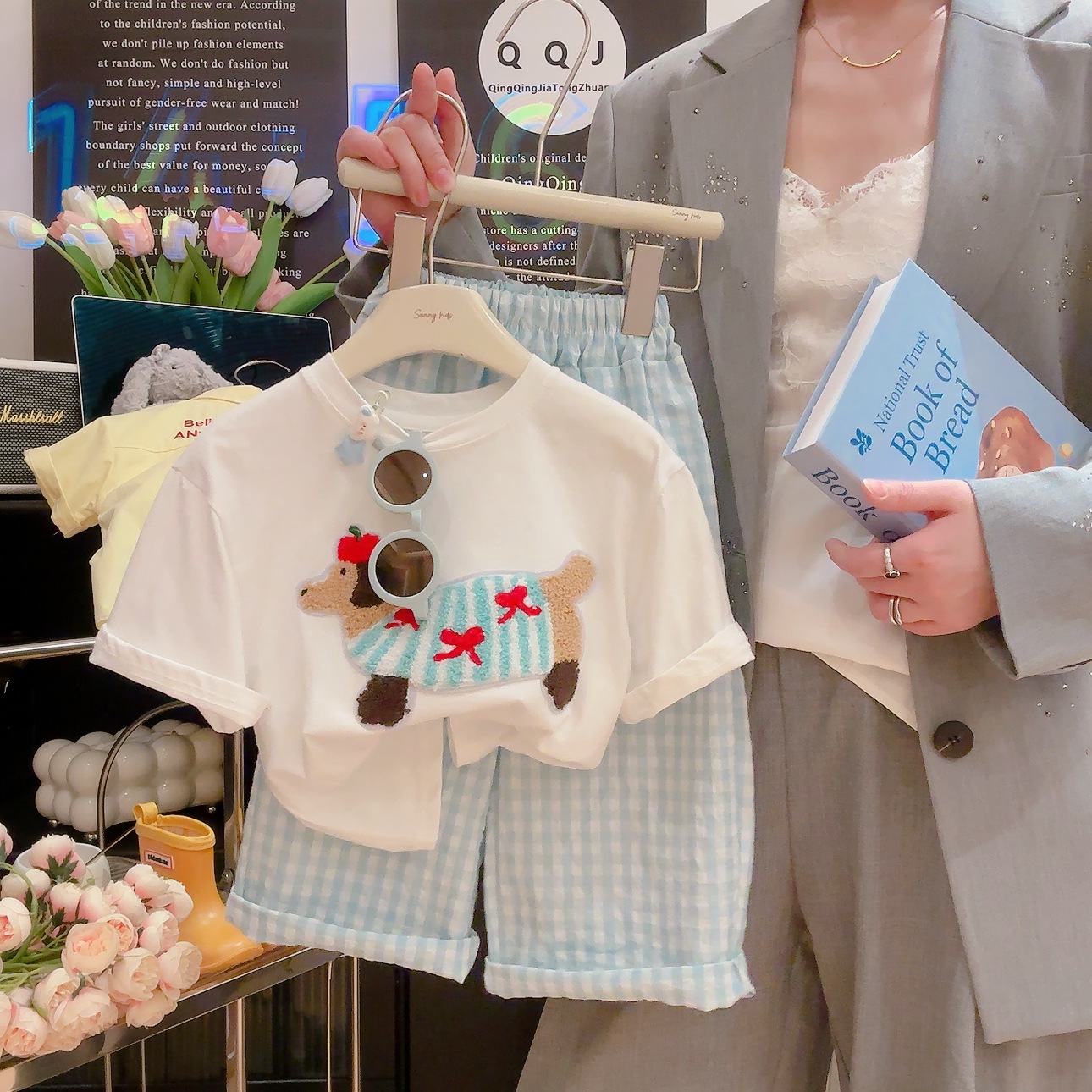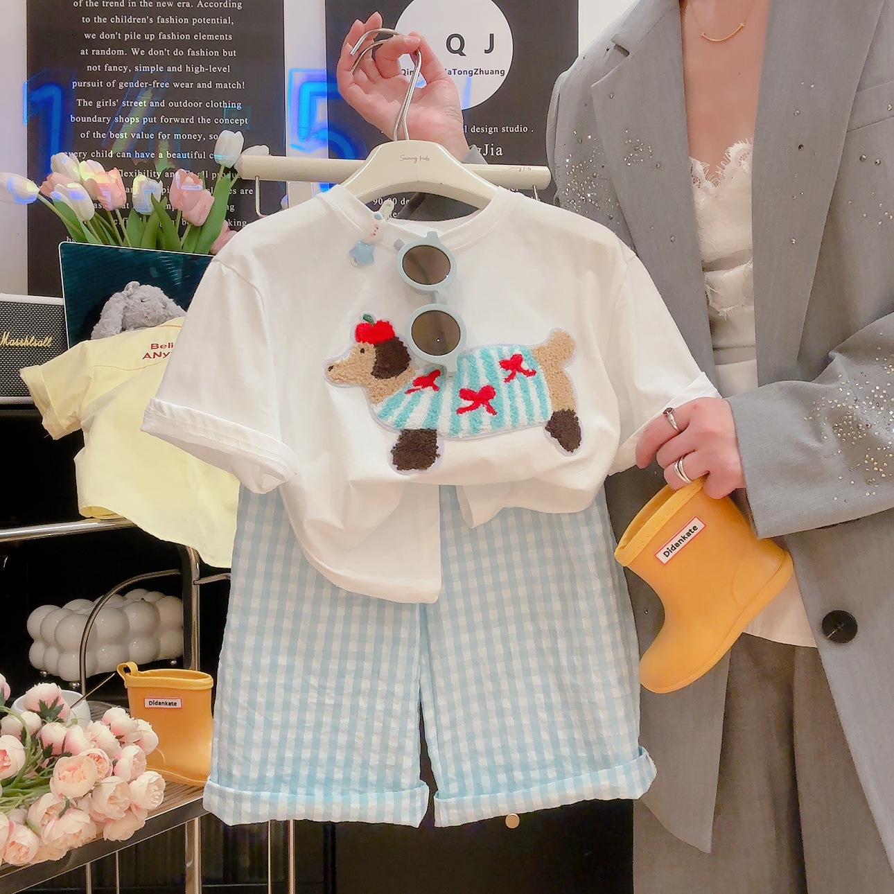 반팔 티셔츠 닥스 훈트 격자 무늬 바지 세트 여름 캐주얼 미국 인쇄 2025 여름 새로운 투피스 세트