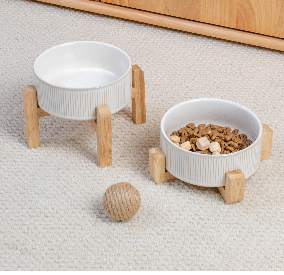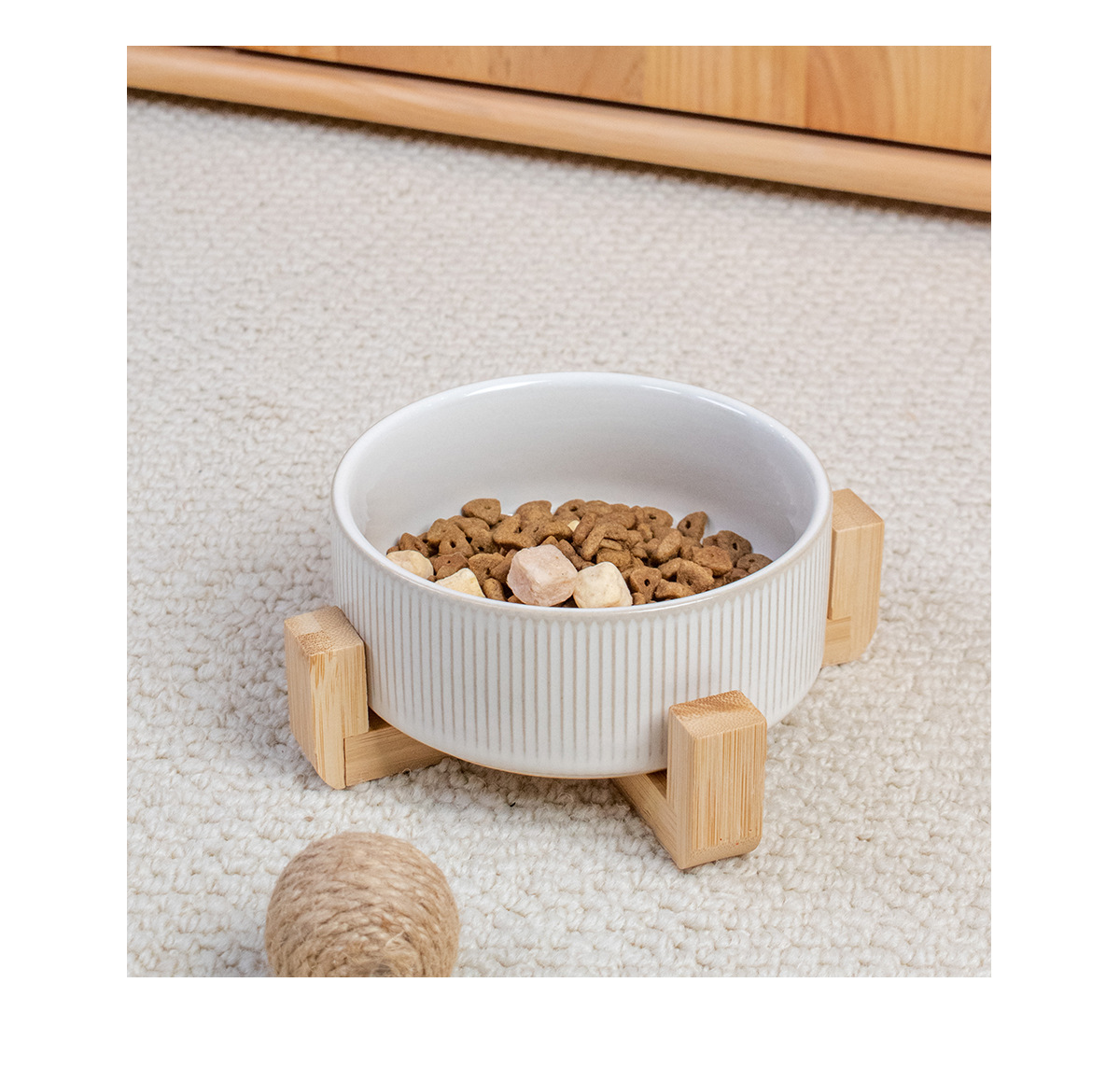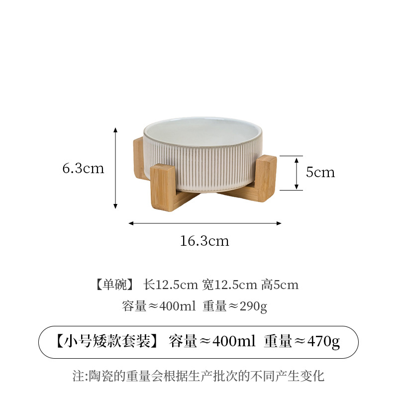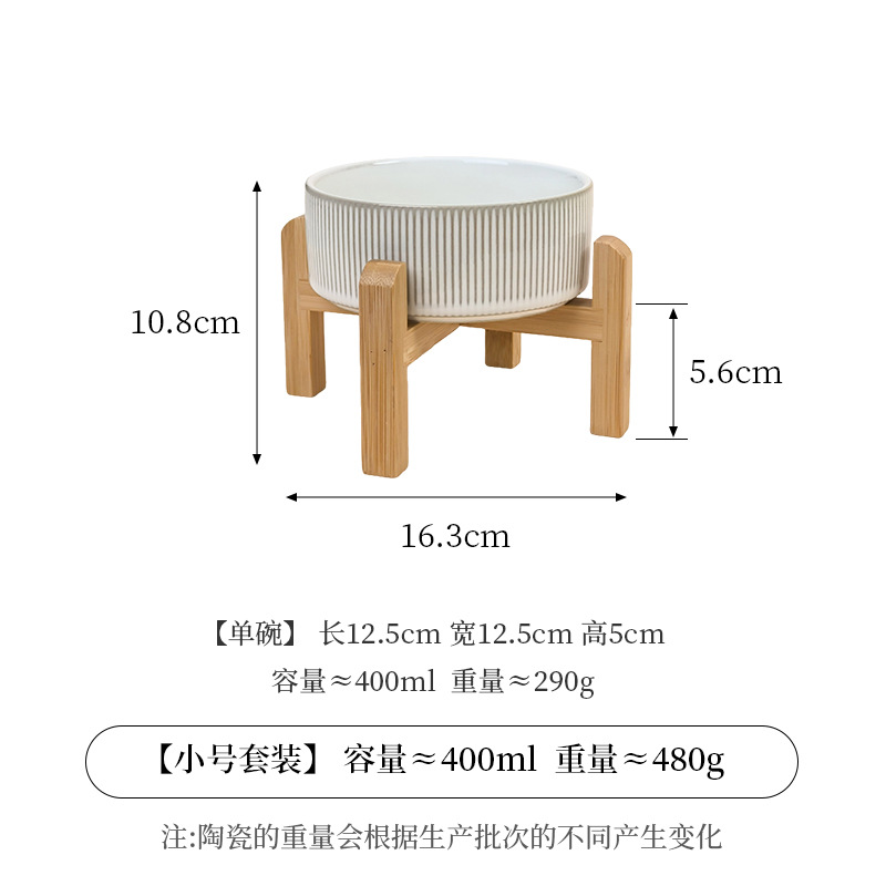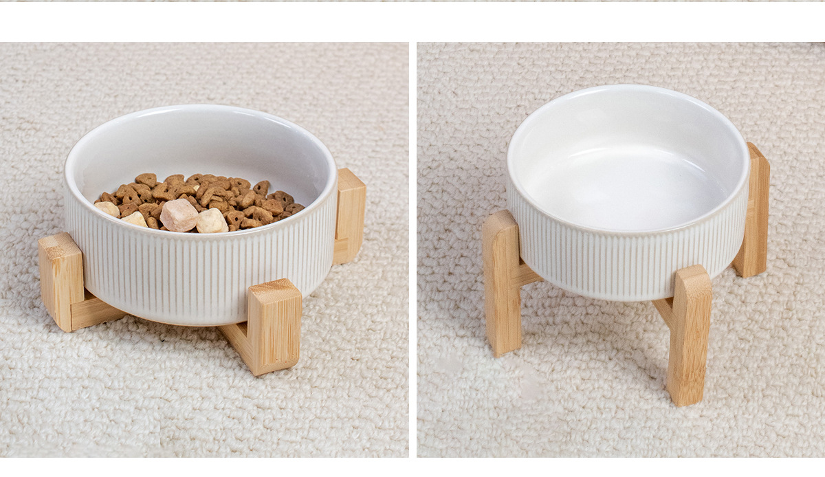 흰색 유약 수직 패턴 직선 그릇 대나무 프레임 빈티지 세라믹 애완 동물 그릇 반대로 뒤집는 고양이 그릇 개 그릇 마시는 분지스토어 가기