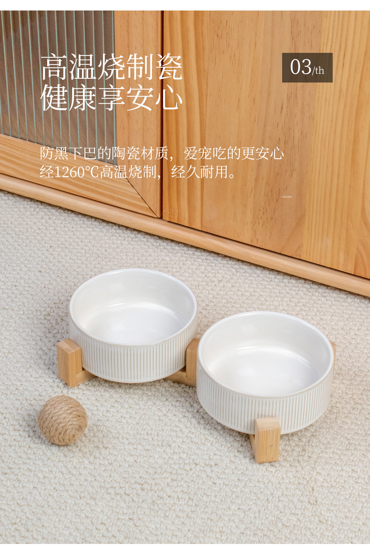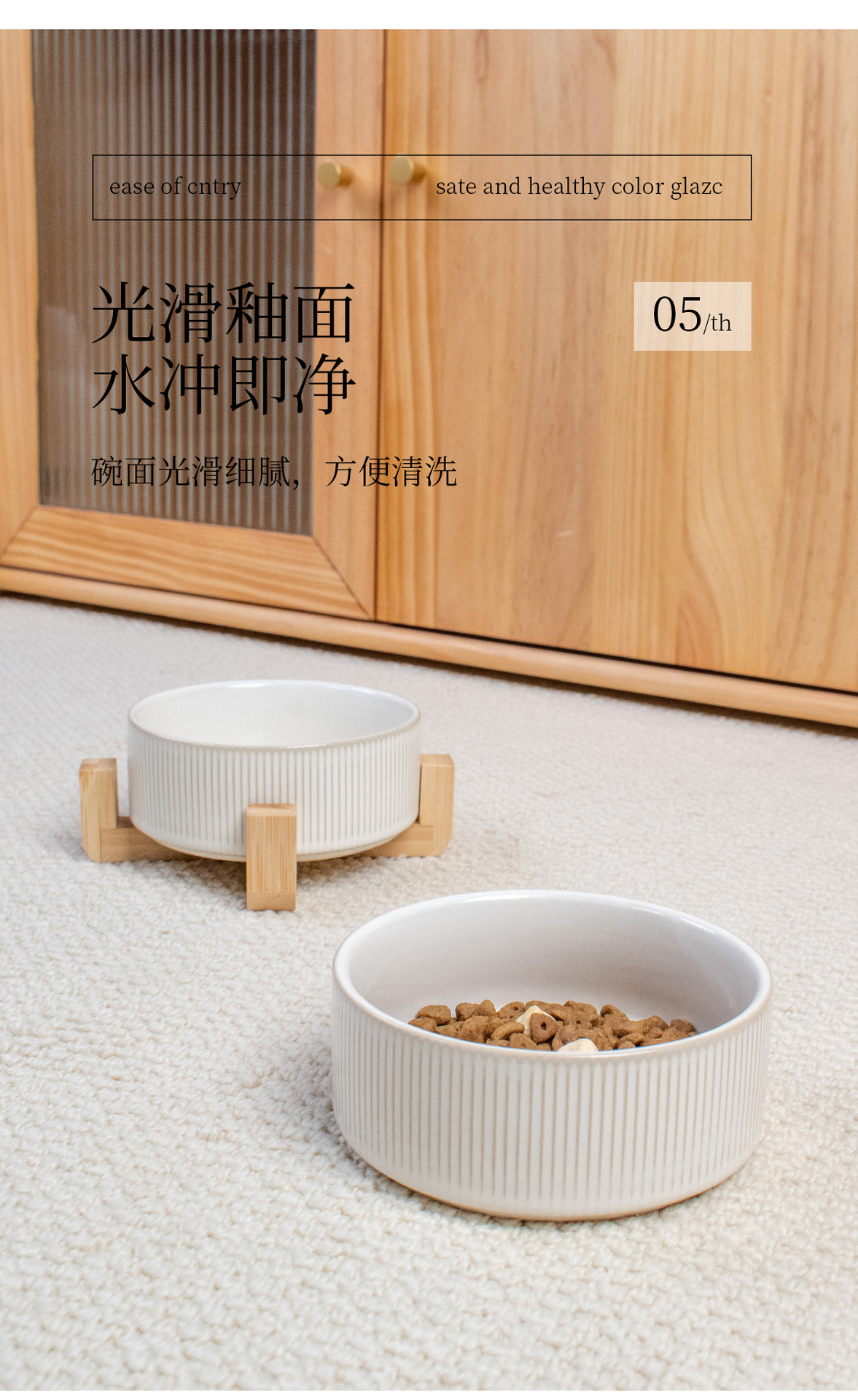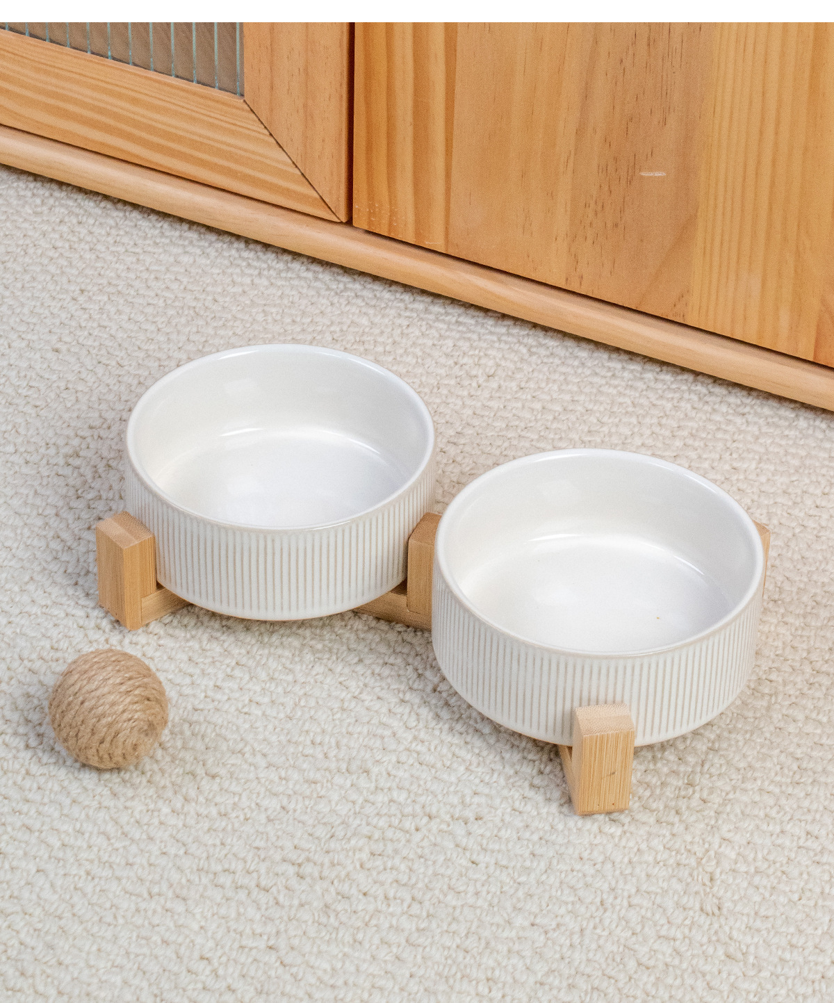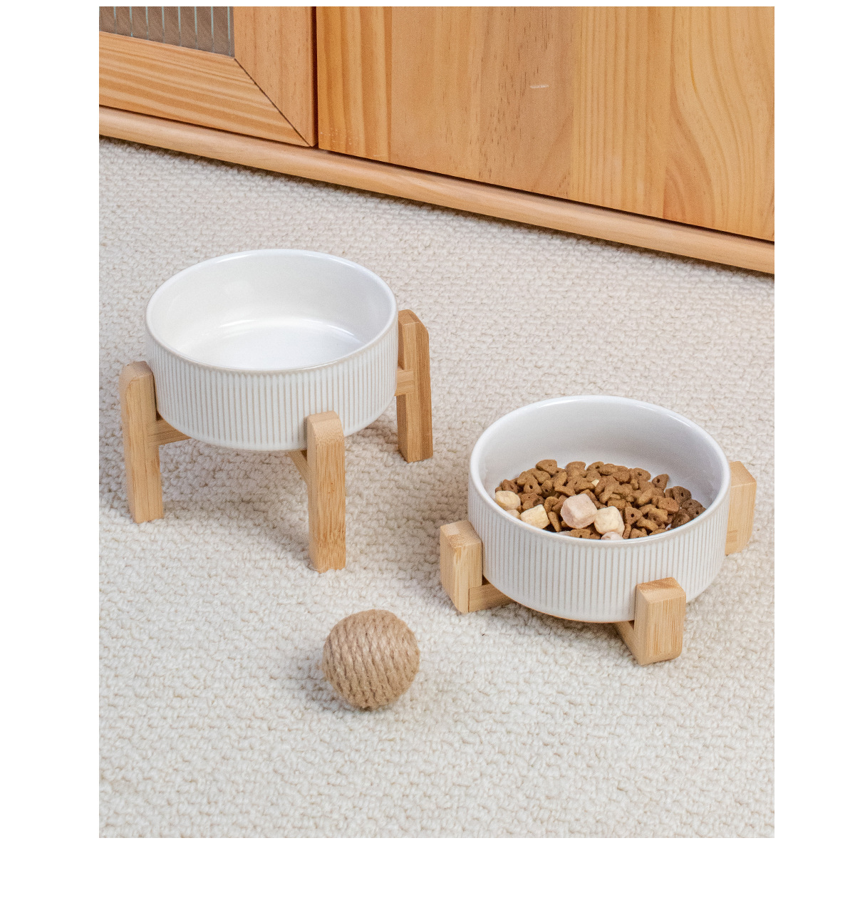 흰색 유약 수직 패턴 직선 그릇 대나무 프레임 빈티지 세라믹 애완 동물 그릇 반대로 뒤집는 고양이 그릇 개 그릇 마시는 분지스토어 가기