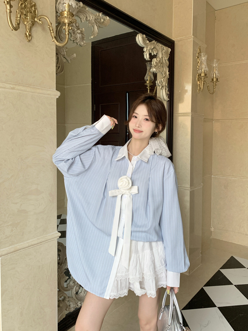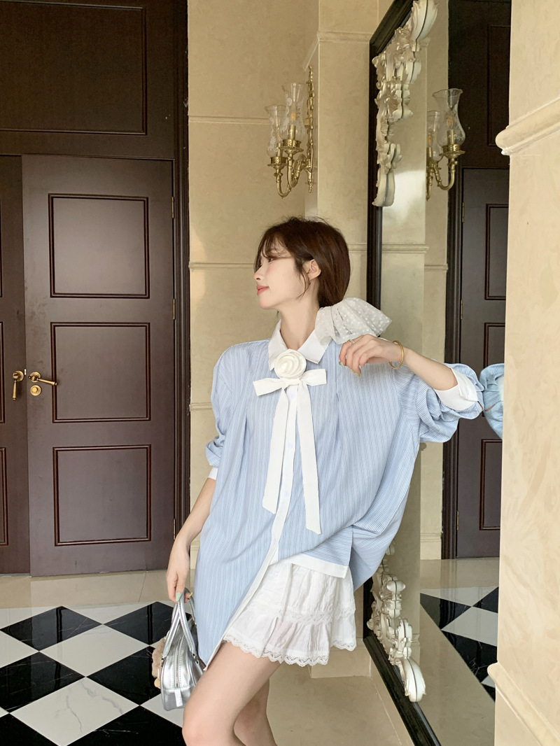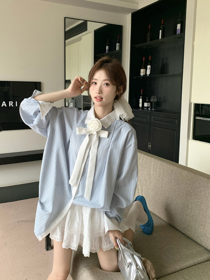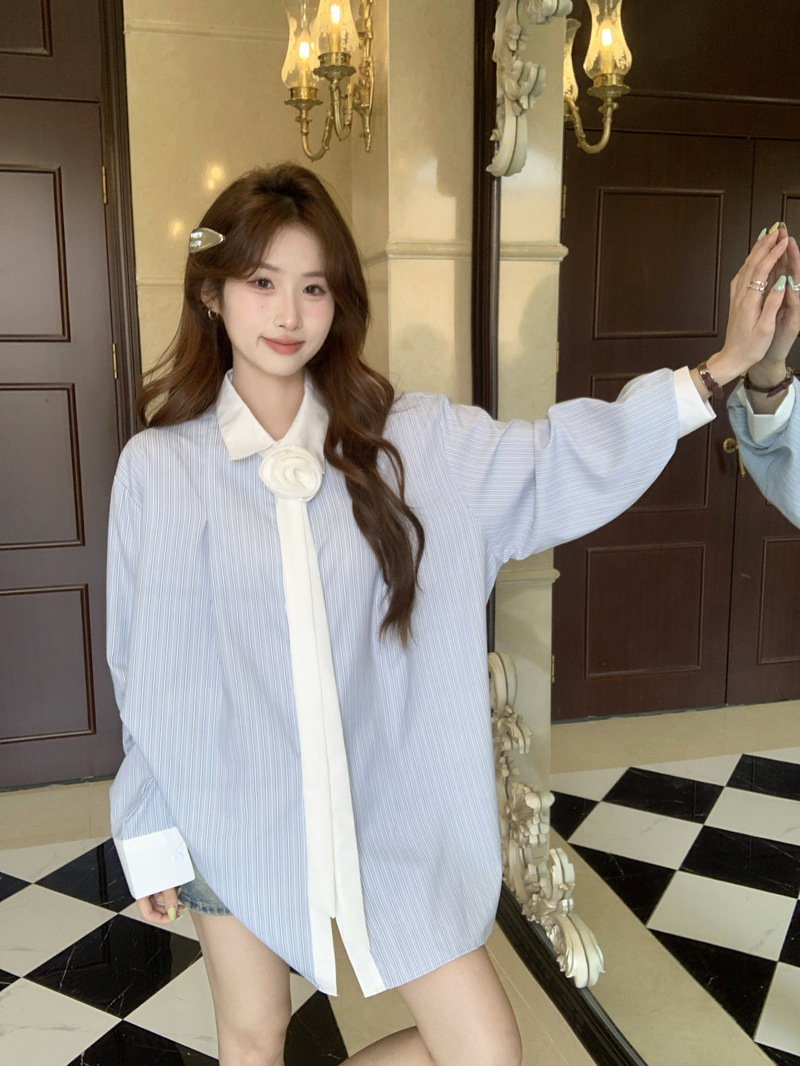 푸른 줄무늬 셔츠 여성의 봄과 여름 바느질 느슨한 슬림 셔츠 선스크린 코트 홍콩 스타일 빈티지 세련된 탑