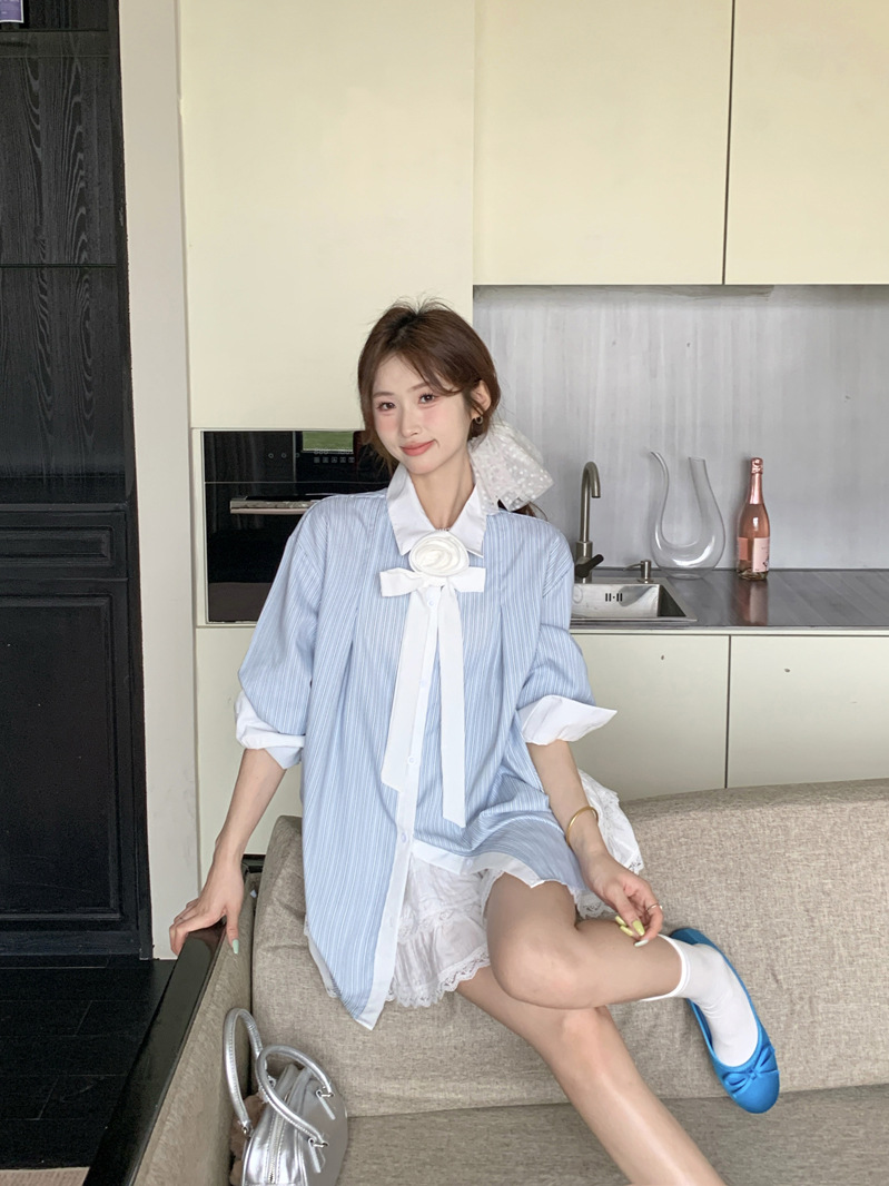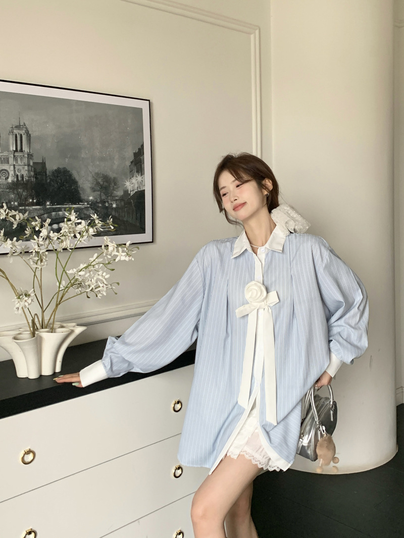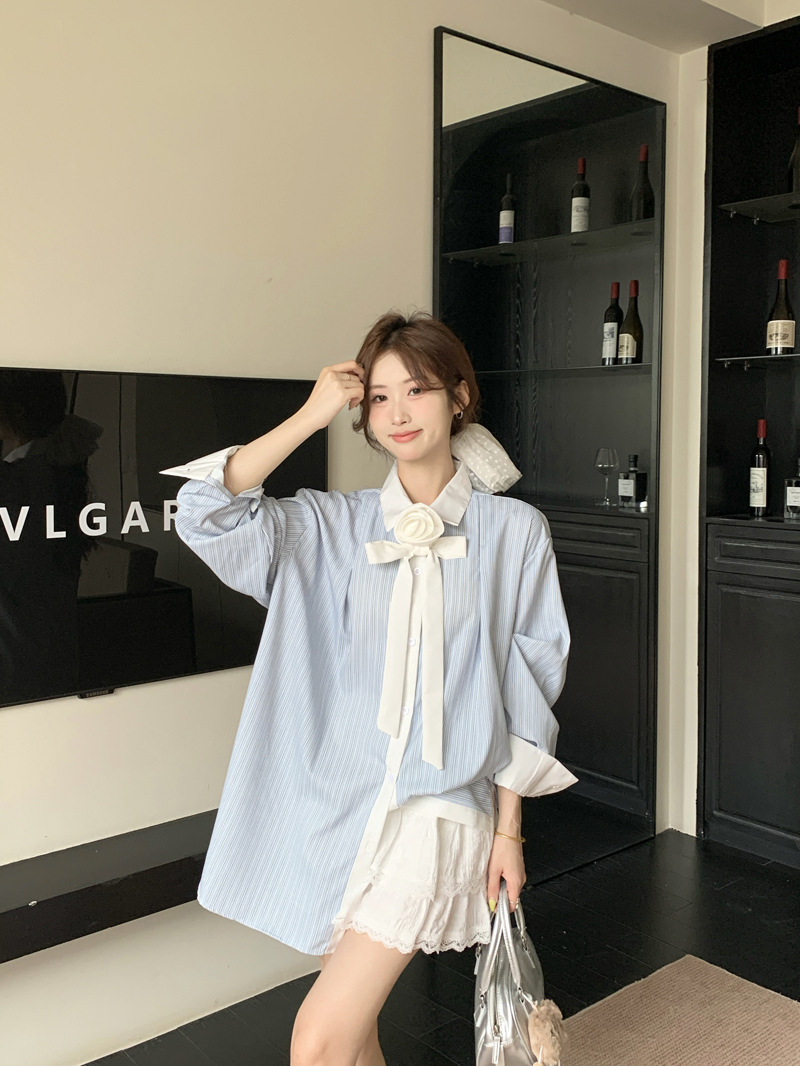 푸른 줄무늬 셔츠 여성의 봄과 여름 바느질 느슨한 슬림 셔츠 선스크린 코트 홍콩 스타일 빈티지 세련된 탑스토어 가기
