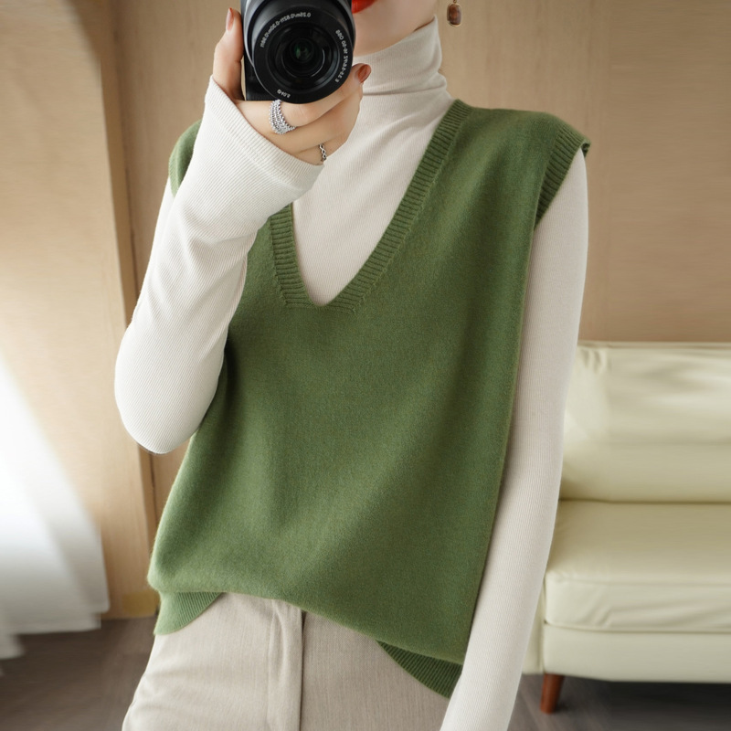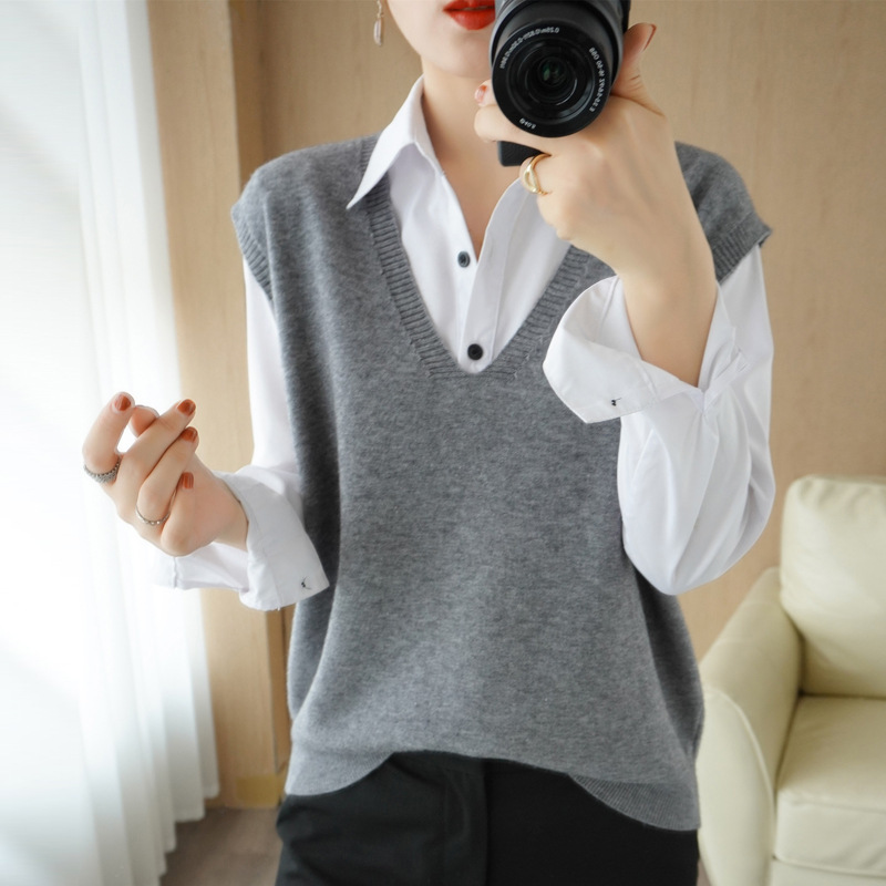 초가을 느슨한 대형 v 넥 울 니트 민소매 조끼 한국 스타일 솔리드 컬러 연령 감소 캐주얼 여성 조끼 탑