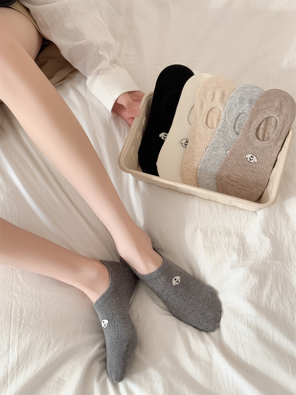 봄과 여름 단색 귀여운 만화 강아지 자수 떨어지지 않는 얇은 미끄럼 방지 실리콘 얕은 양말 여성 양말 보이지 않는 양말스토어 가기