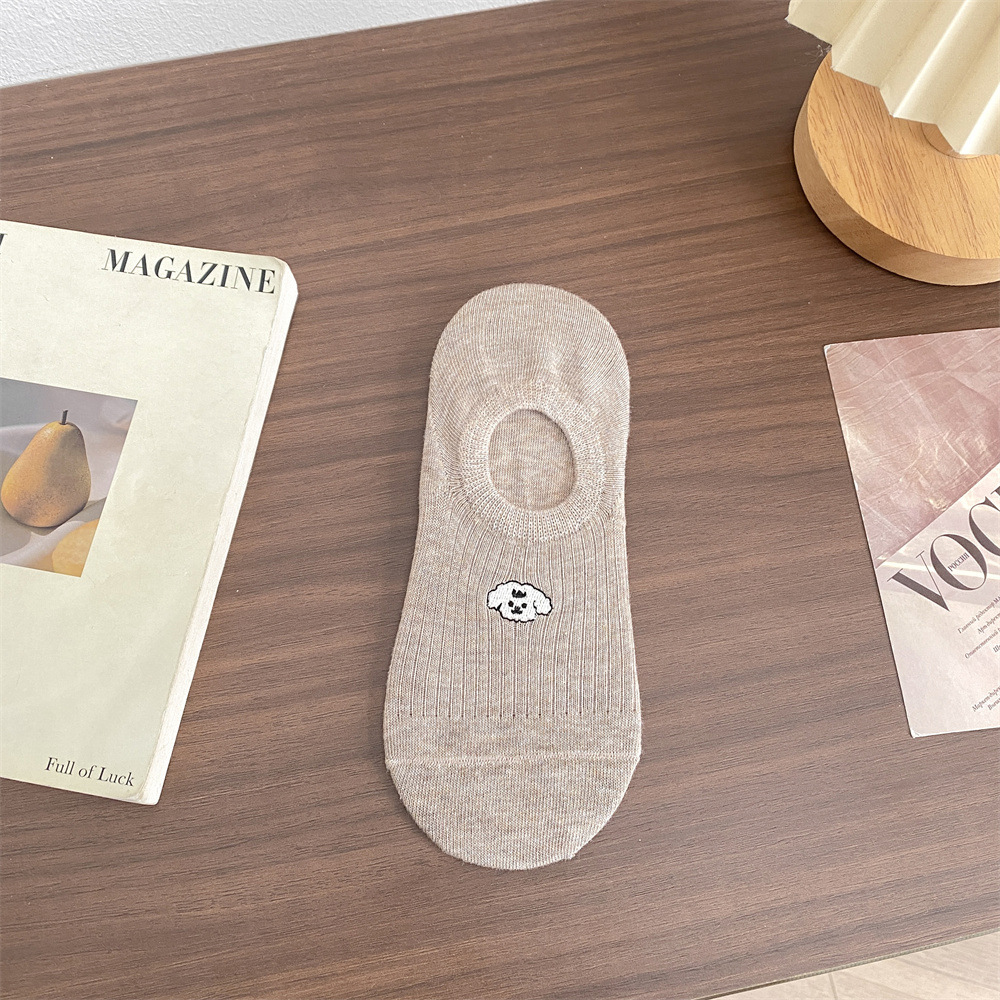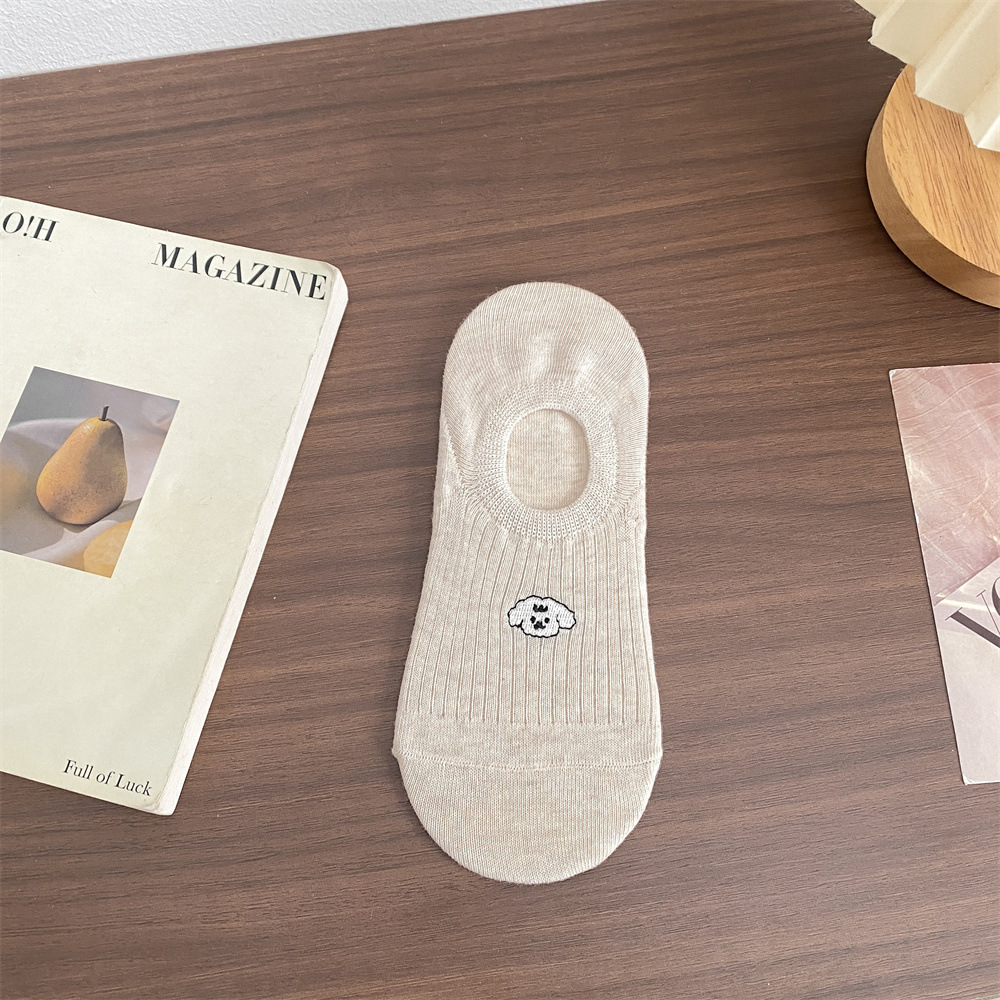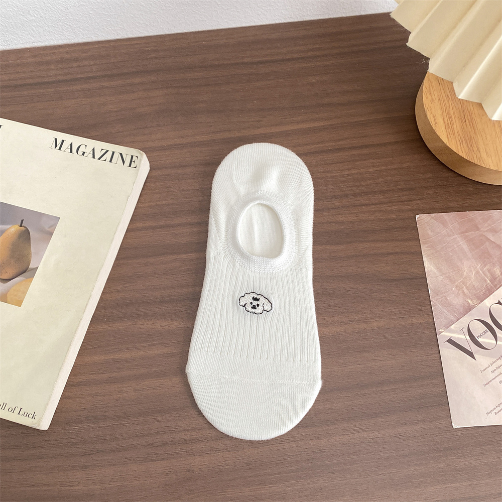 봄과 여름 단색 귀여운 만화 강아지 자수 떨어지지 않는 얇은 미끄럼 방지 실리콘 얕은 양말 여성 양말 보이지 않는 양말
