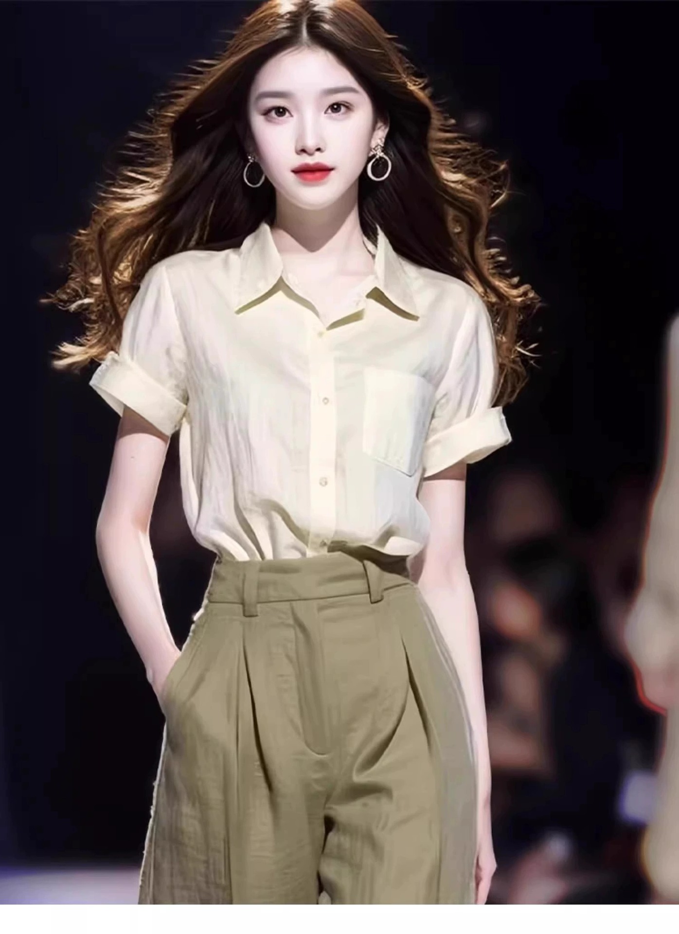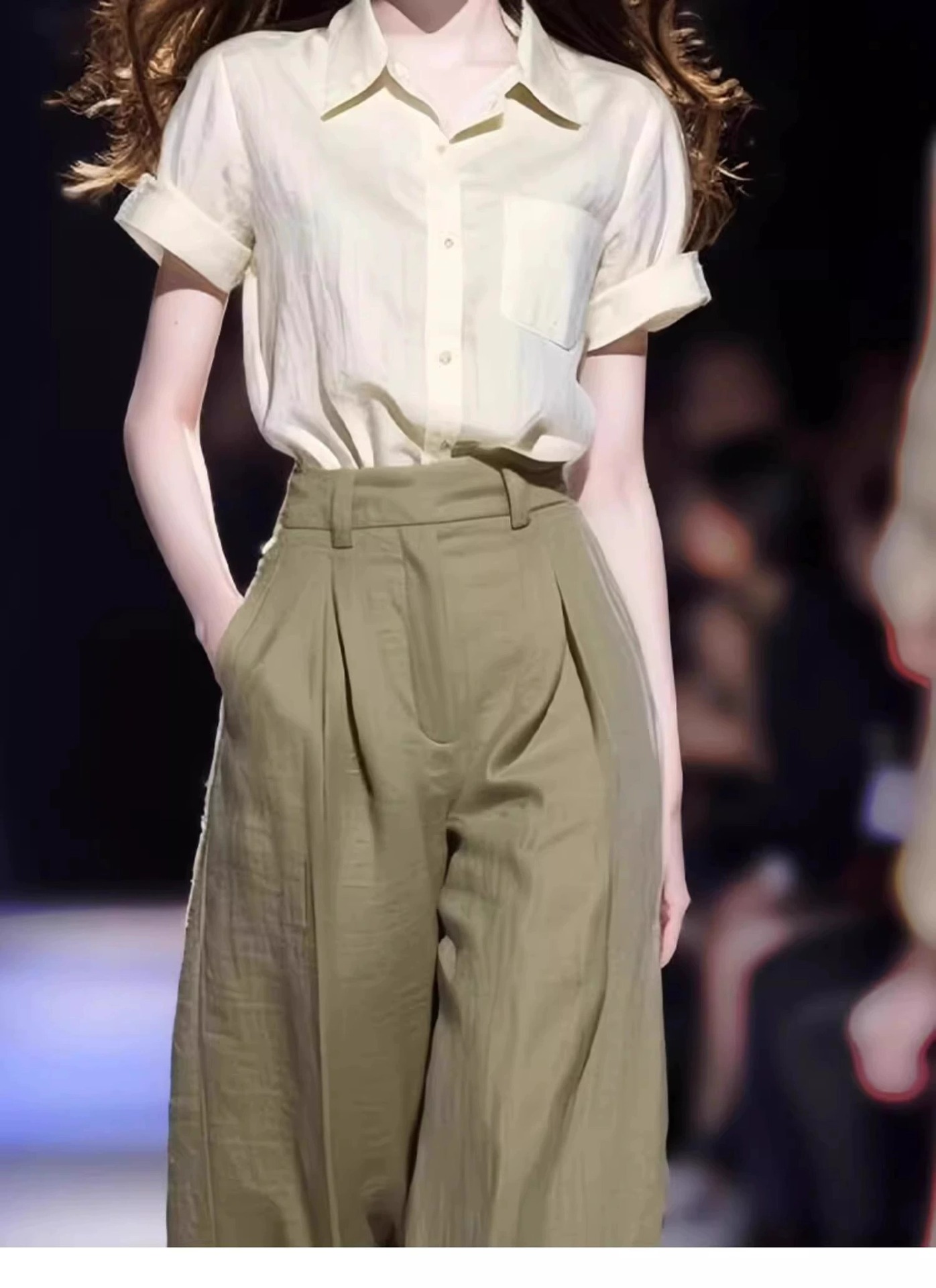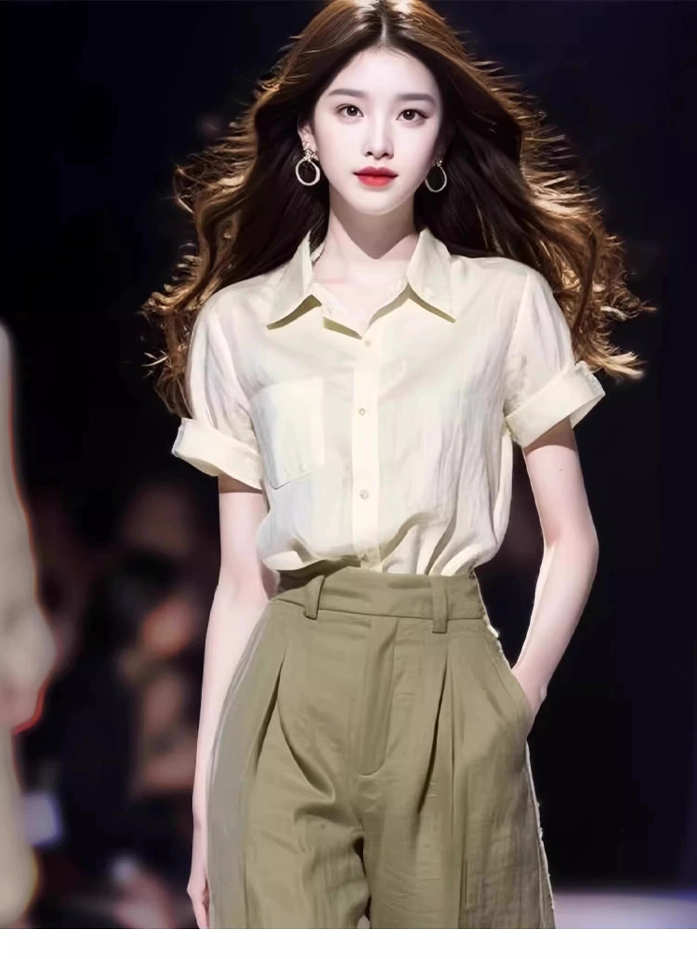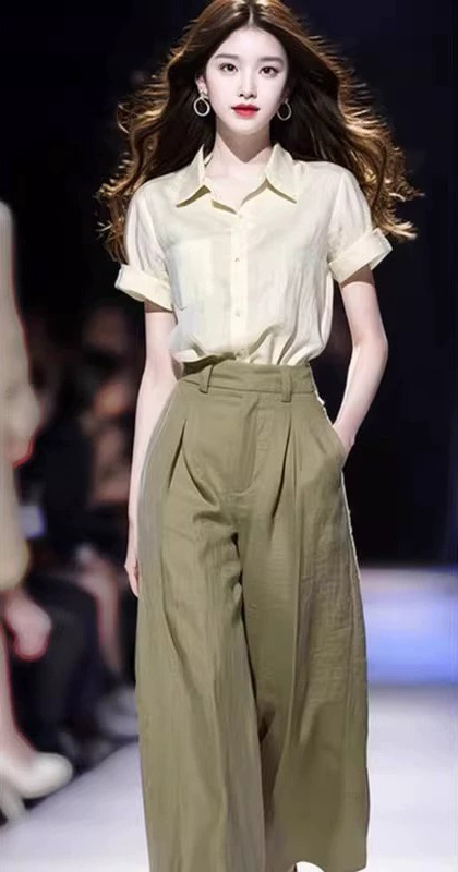 편안한 느낌의 세트와 함께 여름 원피스 슬림 짧은 소매 셔츠 넓은 다리 바지 튀긴 거리 나이 감소 패션 세트 여성