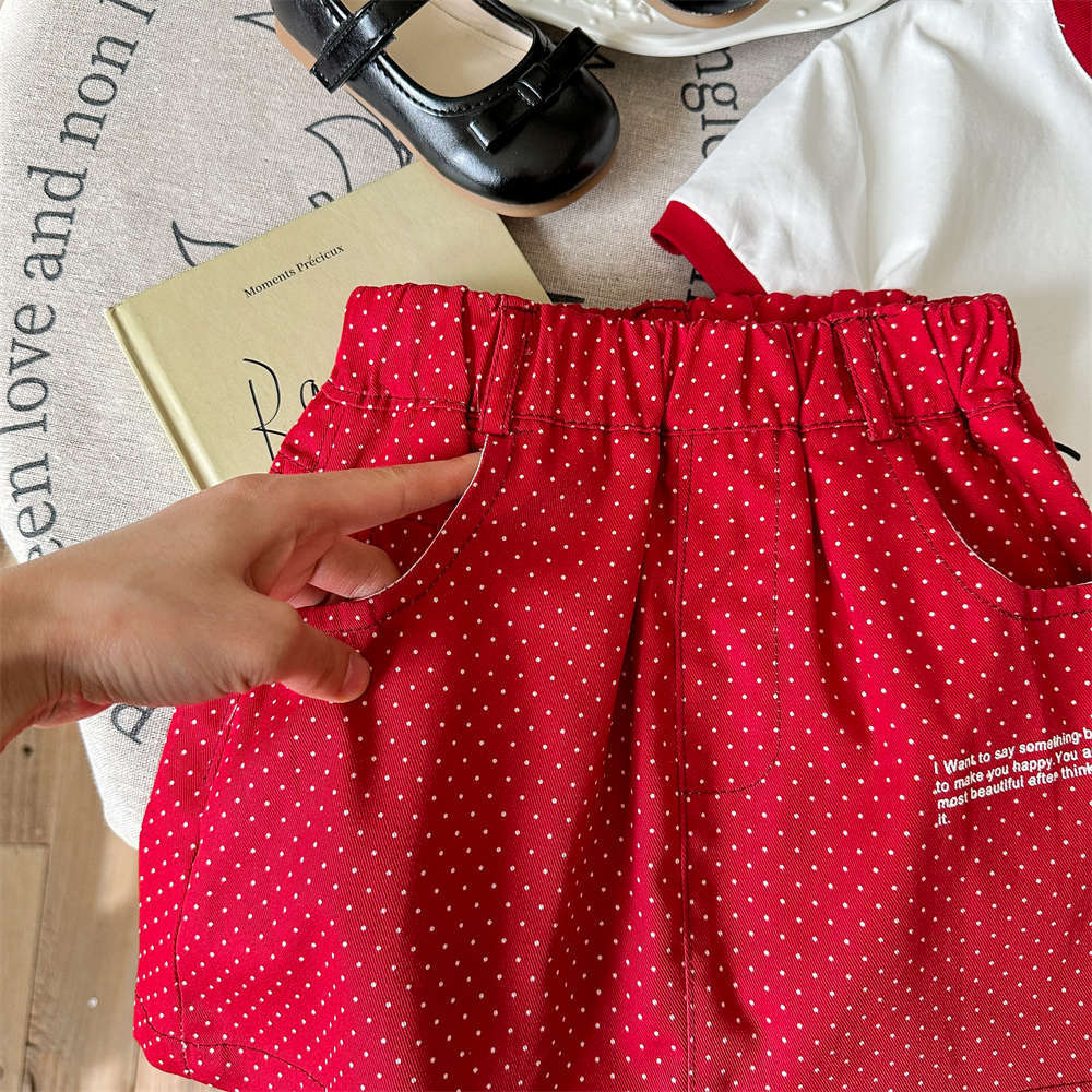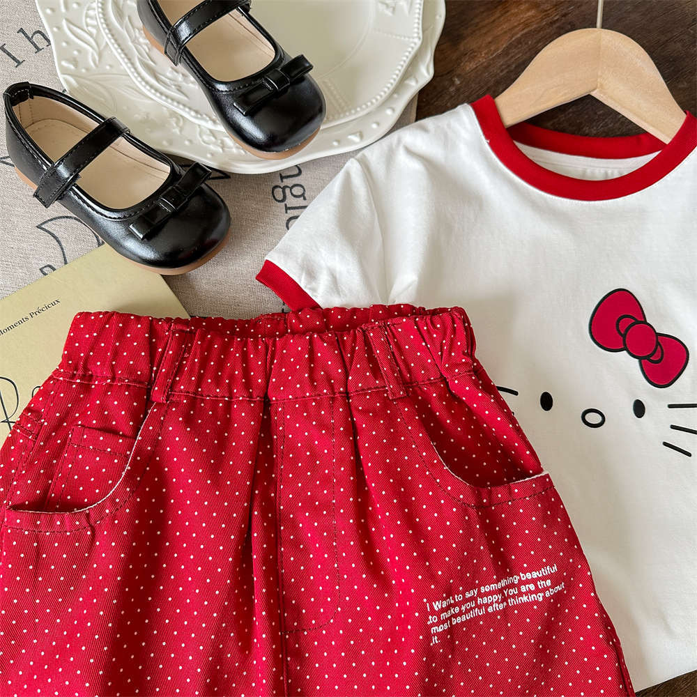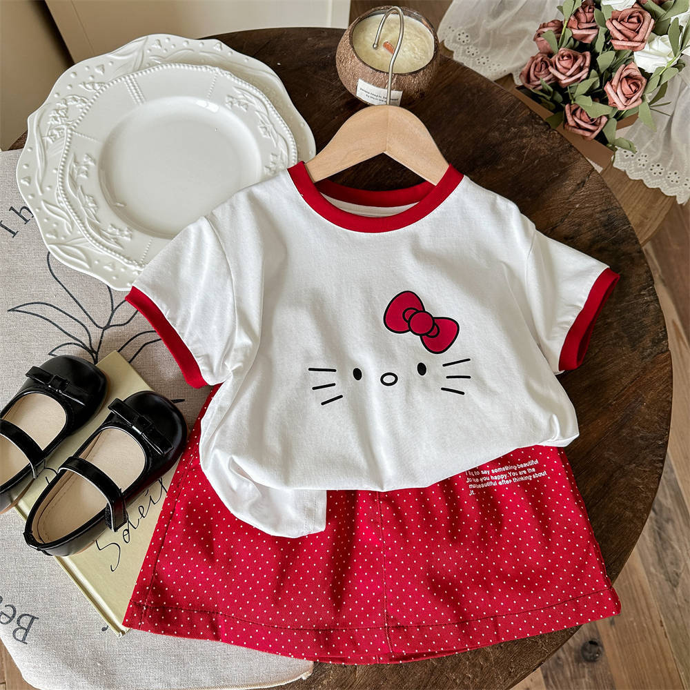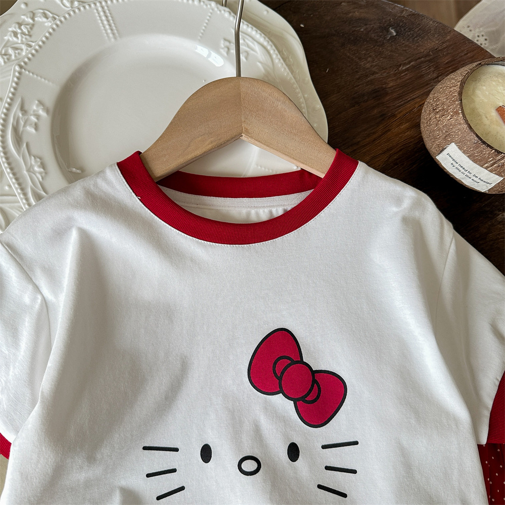 닝리 아동복 여름 새 소녀 한국 만화 귀여운 새끼 고양이 반팔 티셔츠 솜털 무늬 오버스커트 세트