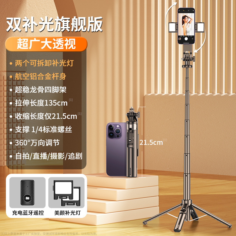 • 듀얼 램프 모델 - 1.35m - 쿼드포드 - 안정적인 셀카봉 - 블랙 충전 블루투스 리모컨