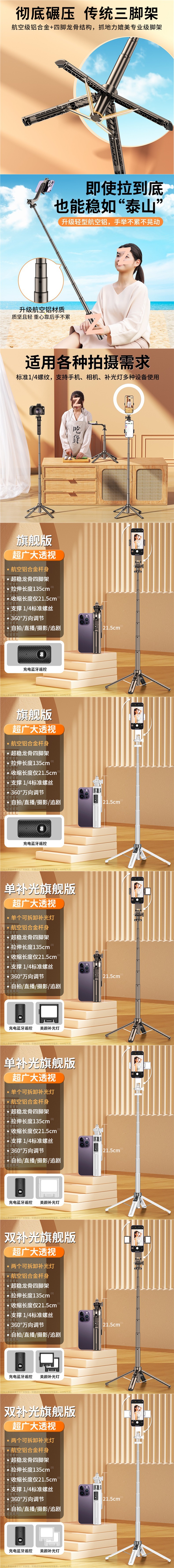 2025 새로운 알루미늄 합금 셀카 스틱 쿼드 포드 플로어 투 플로어 트레몰로 라이브 카메라 휴대 전화 도매