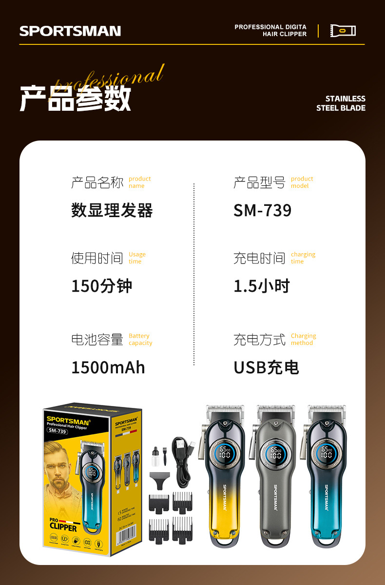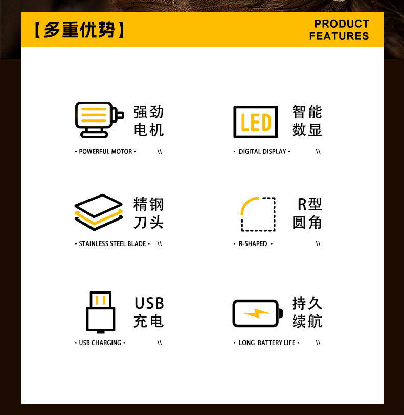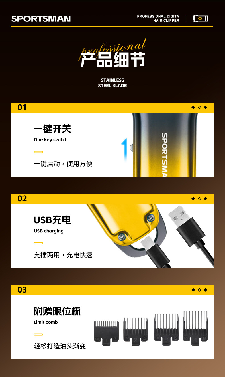 套装内含:理发器主机一个,限位梳X4(3MM,6MM,10MM,13MM),USB充电线,清洁刷,润滑油,英文说明书