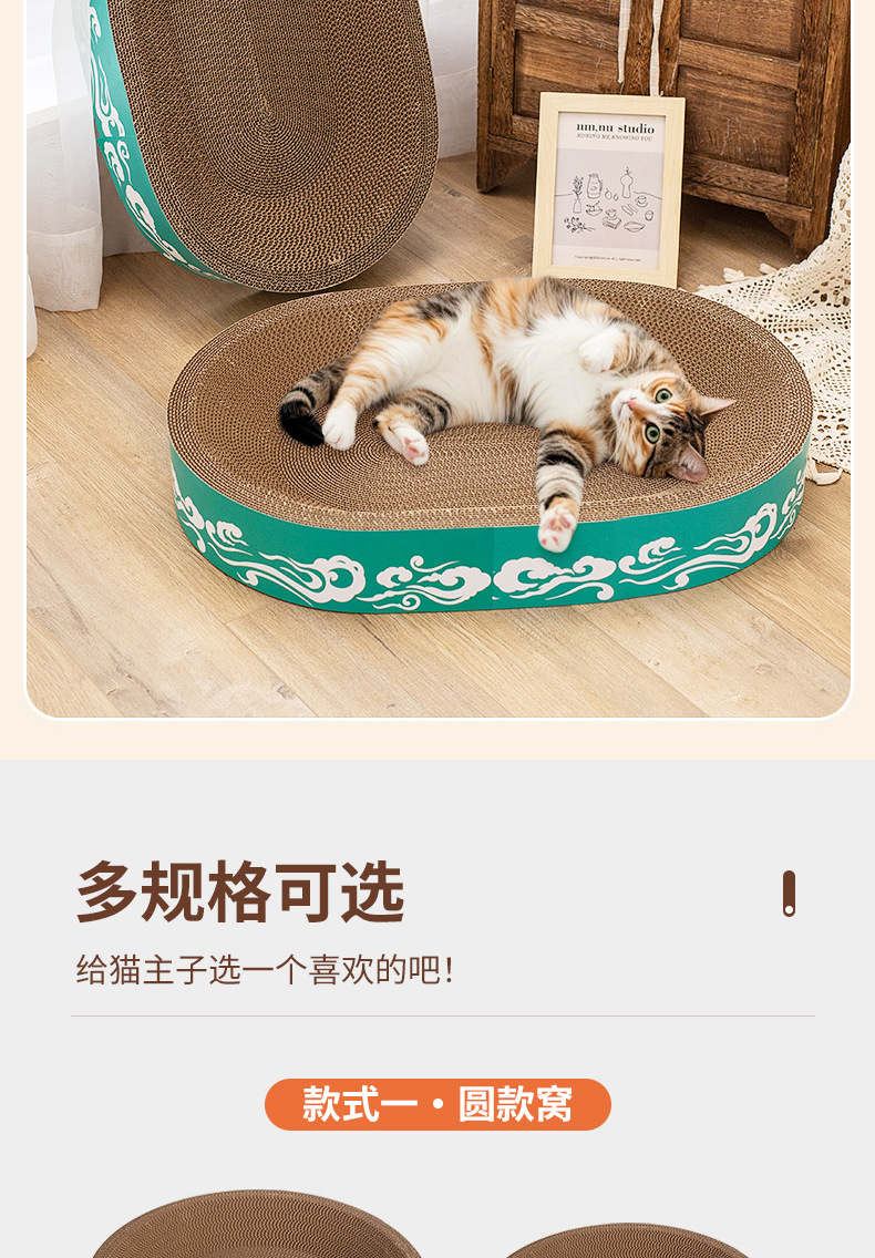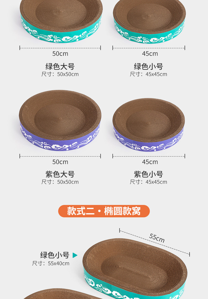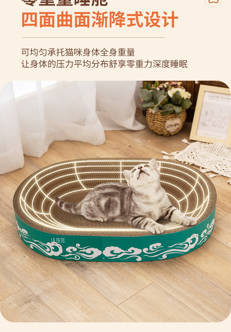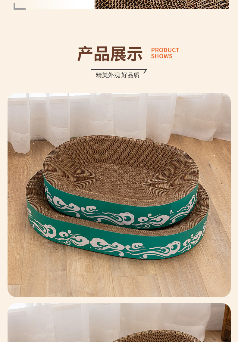 도매 고양이 장난감, 두꺼운 골판지, 부스러기 없는 내구성 있는 고양이 긁는판, 고양이 둥지, 타원형 대형 고양이 긁는판스토어 가기