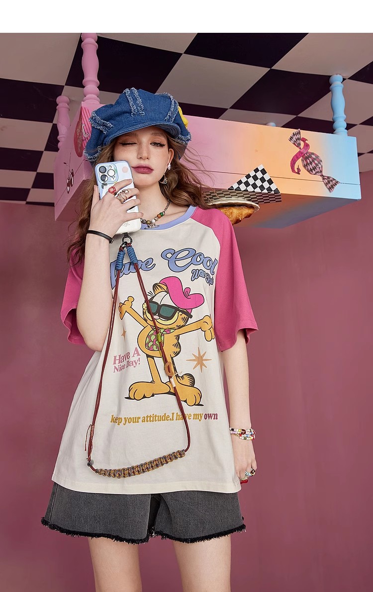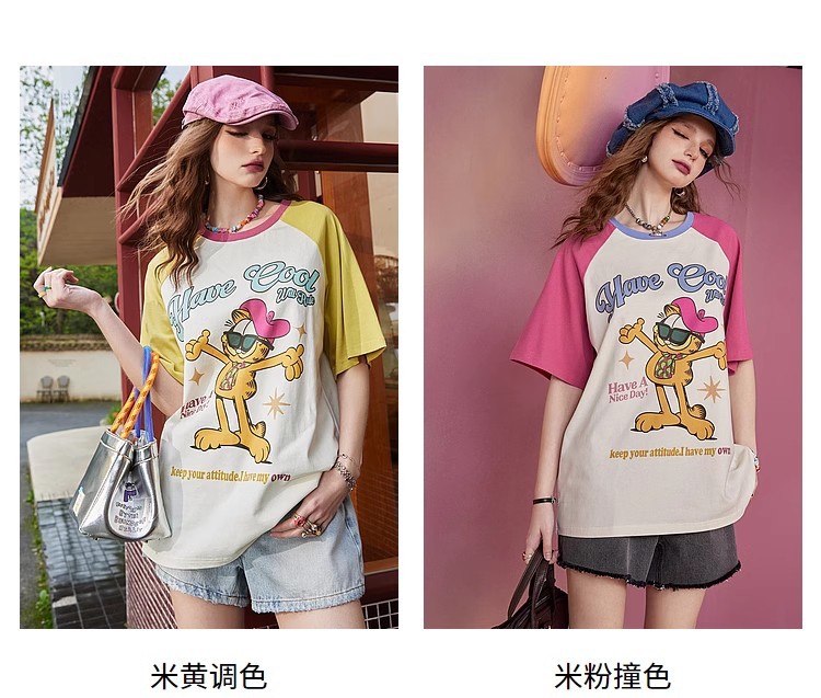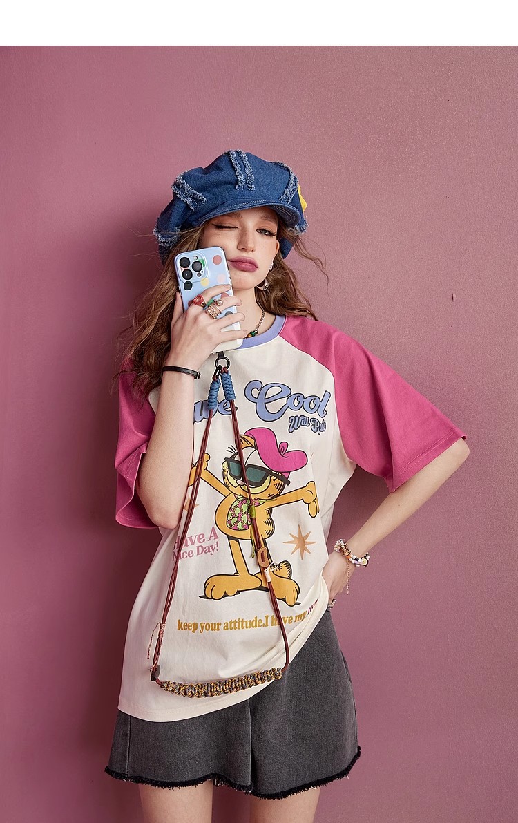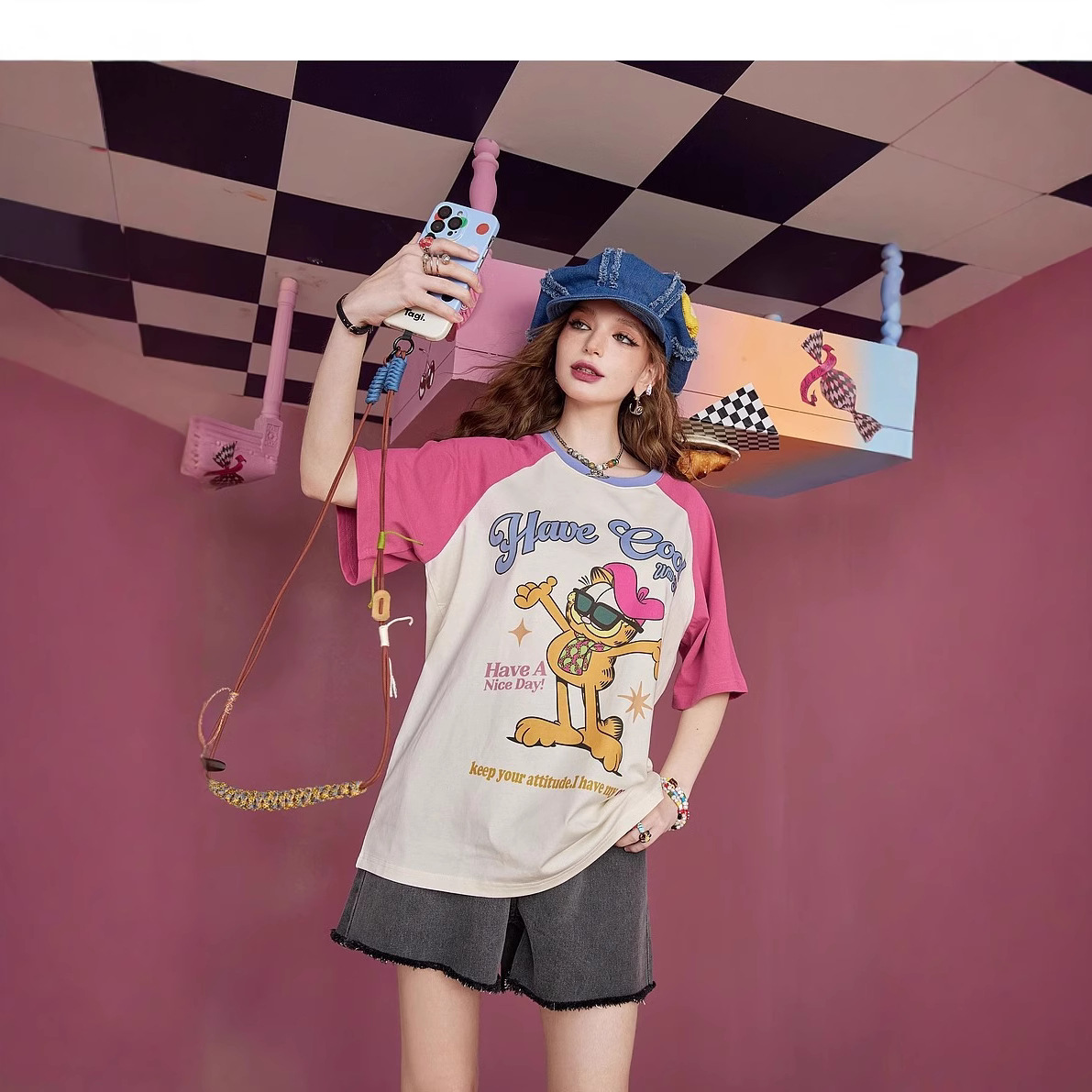 [가필드] 고블린 포켓 어깨 대조 느슨한 반팔 티셔츠 여성용 2025 년 여름 새 슬림탑