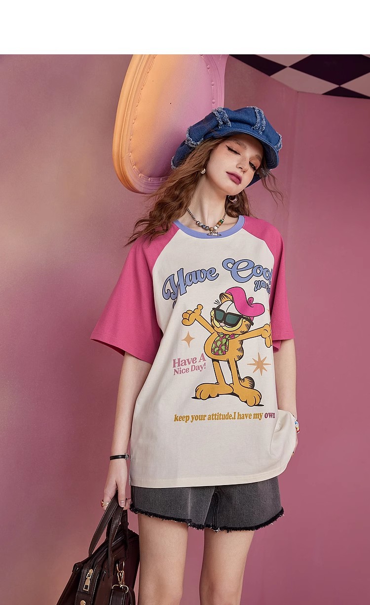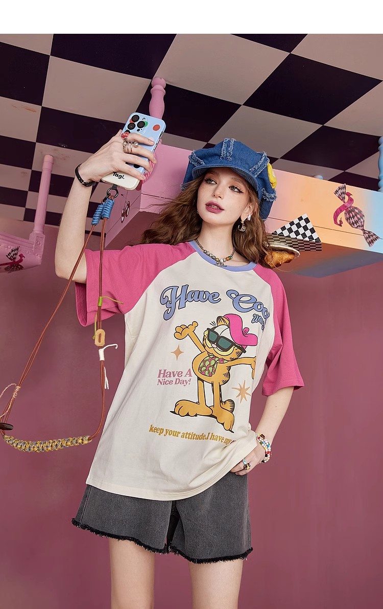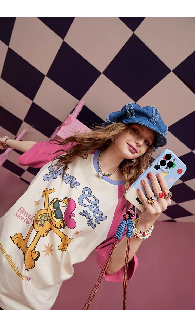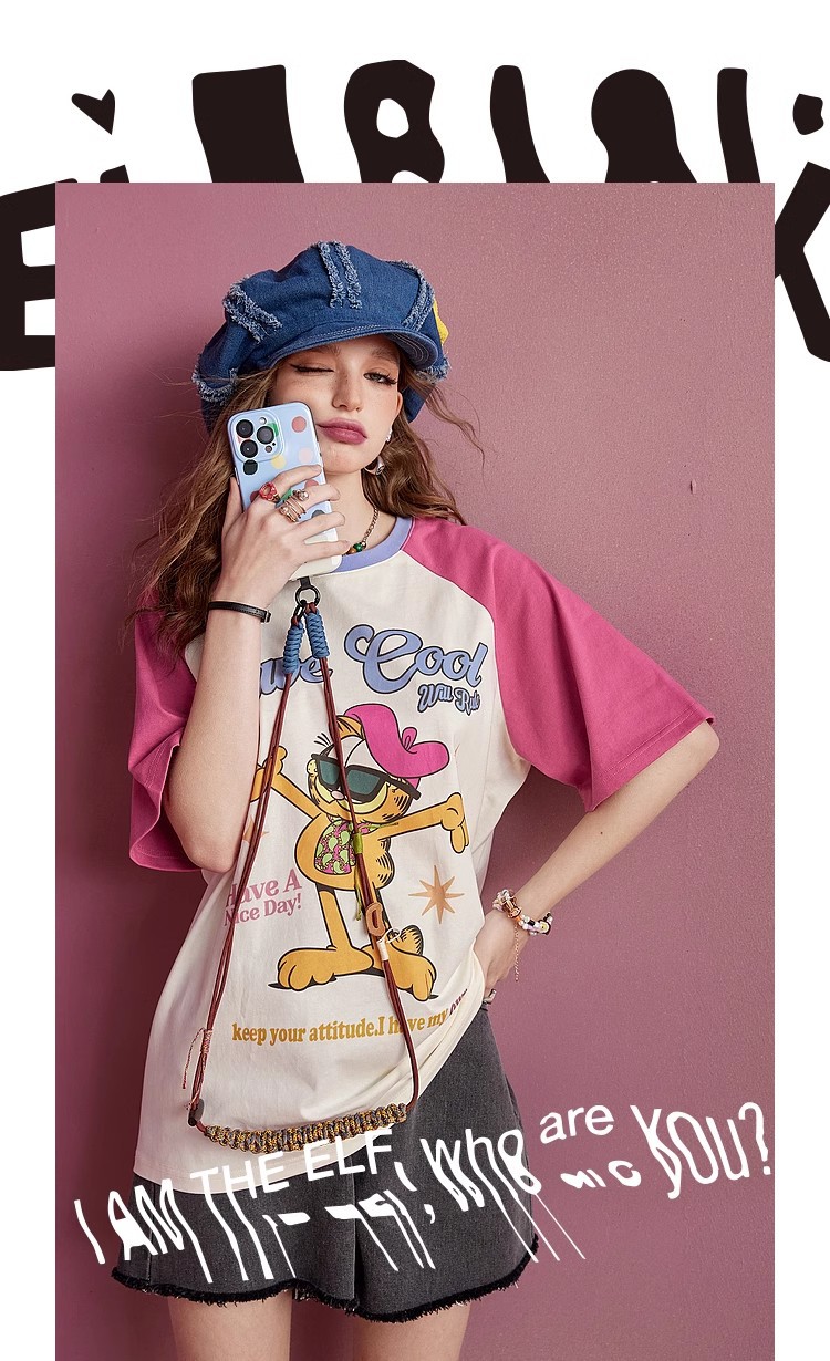 [가필드] 고블린 포켓 어깨 대조 느슨한 반팔 티셔츠 여성용 2025 년 여름 새 슬림탑
