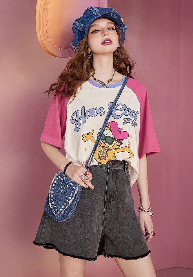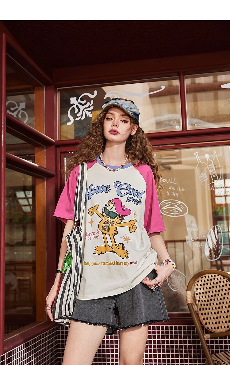 [가필드] 고블린 포켓 어깨 대조 느슨한 반팔 티셔츠 여성용 2025 년 여름 새 슬림탑스토어 가기