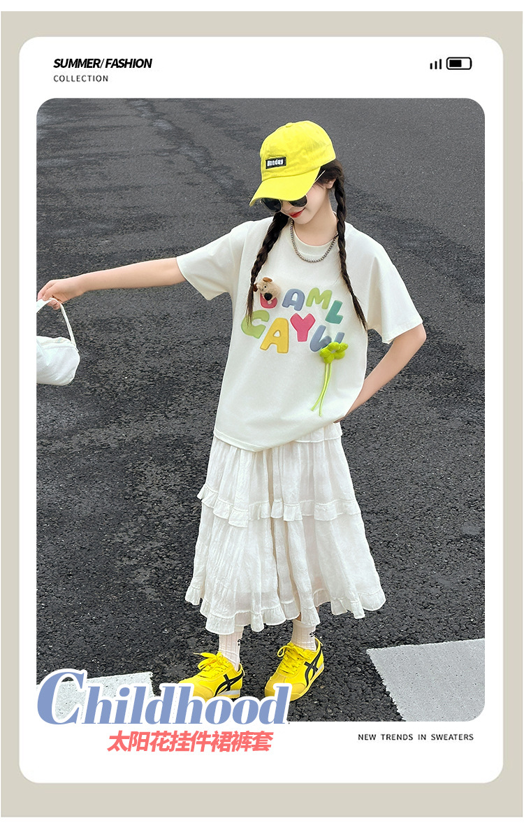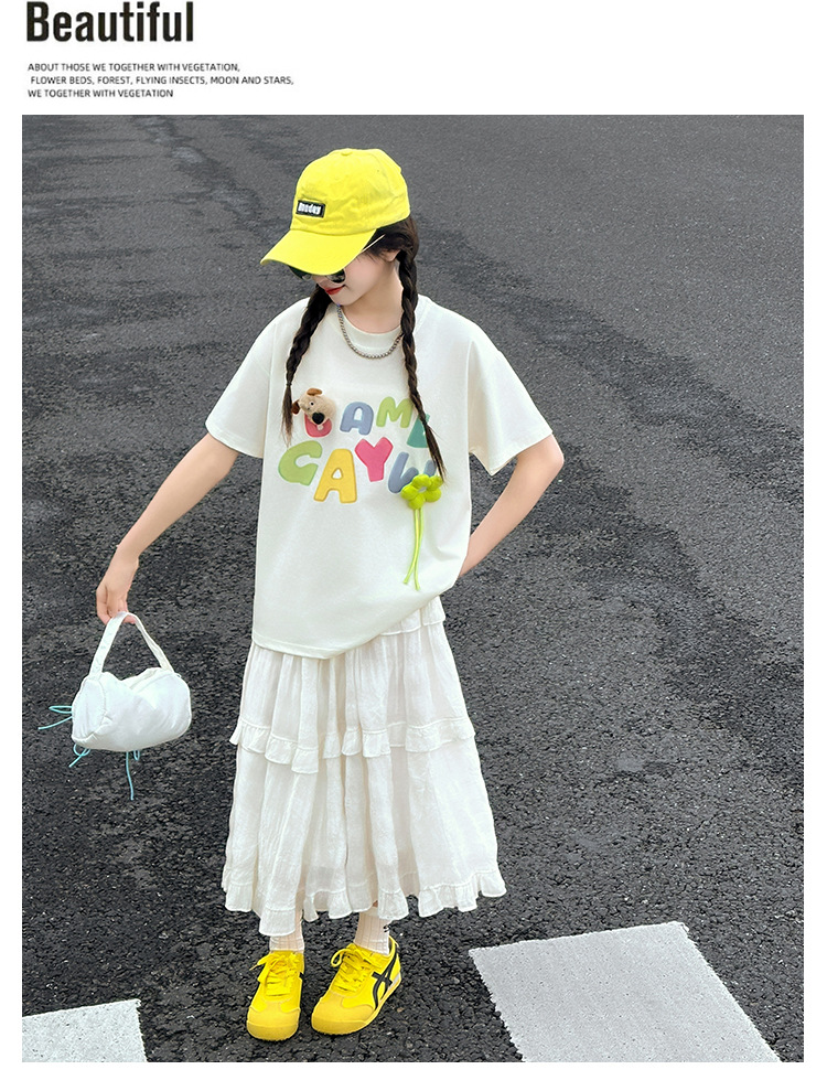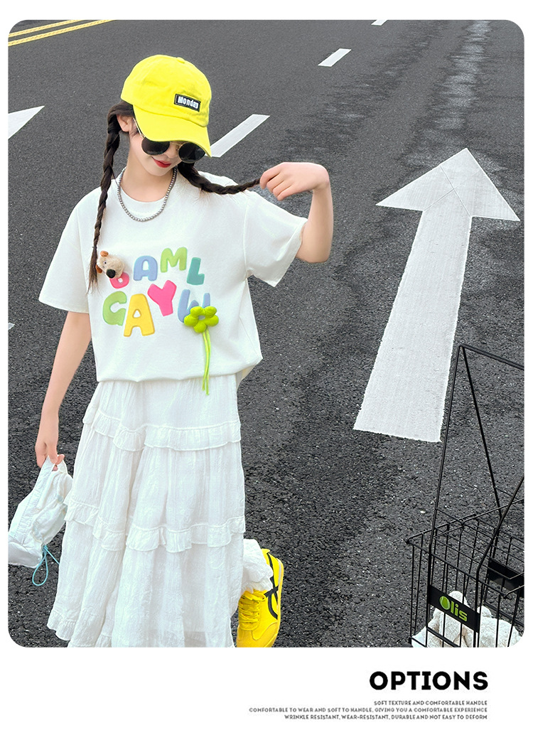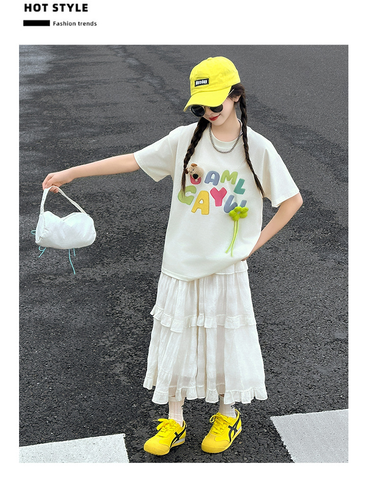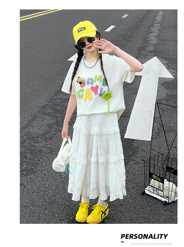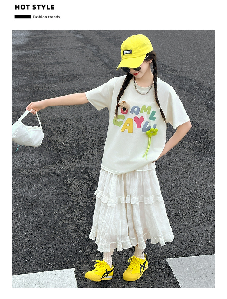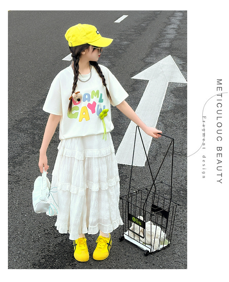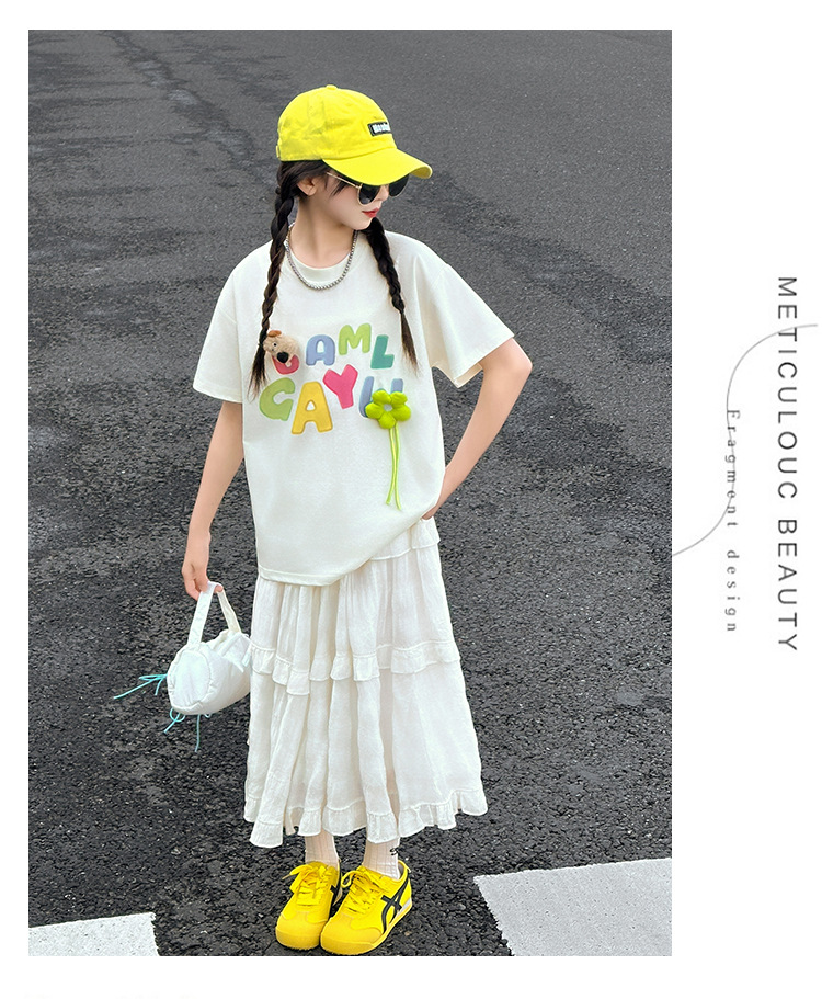 소녀 만화 편지 반팔 티셔츠 세트 2025 새로운 어린 소녀 달콤한 3 차원 인형 탑 스커트스토어 가기