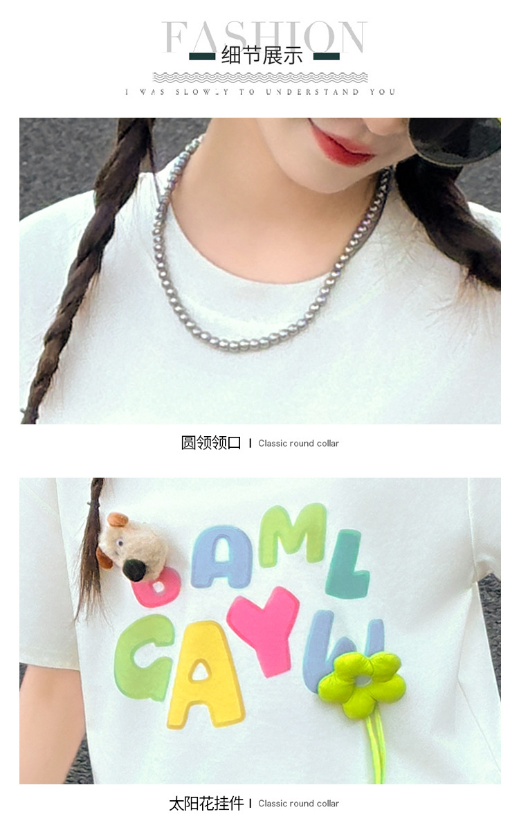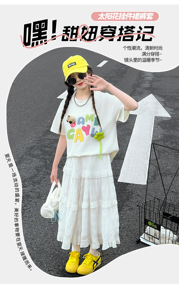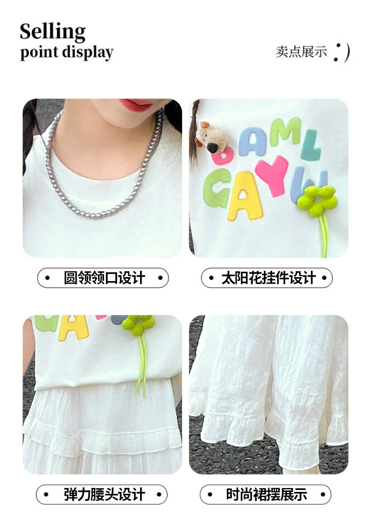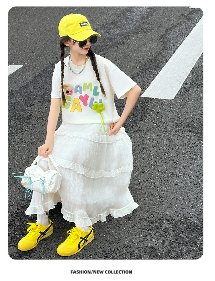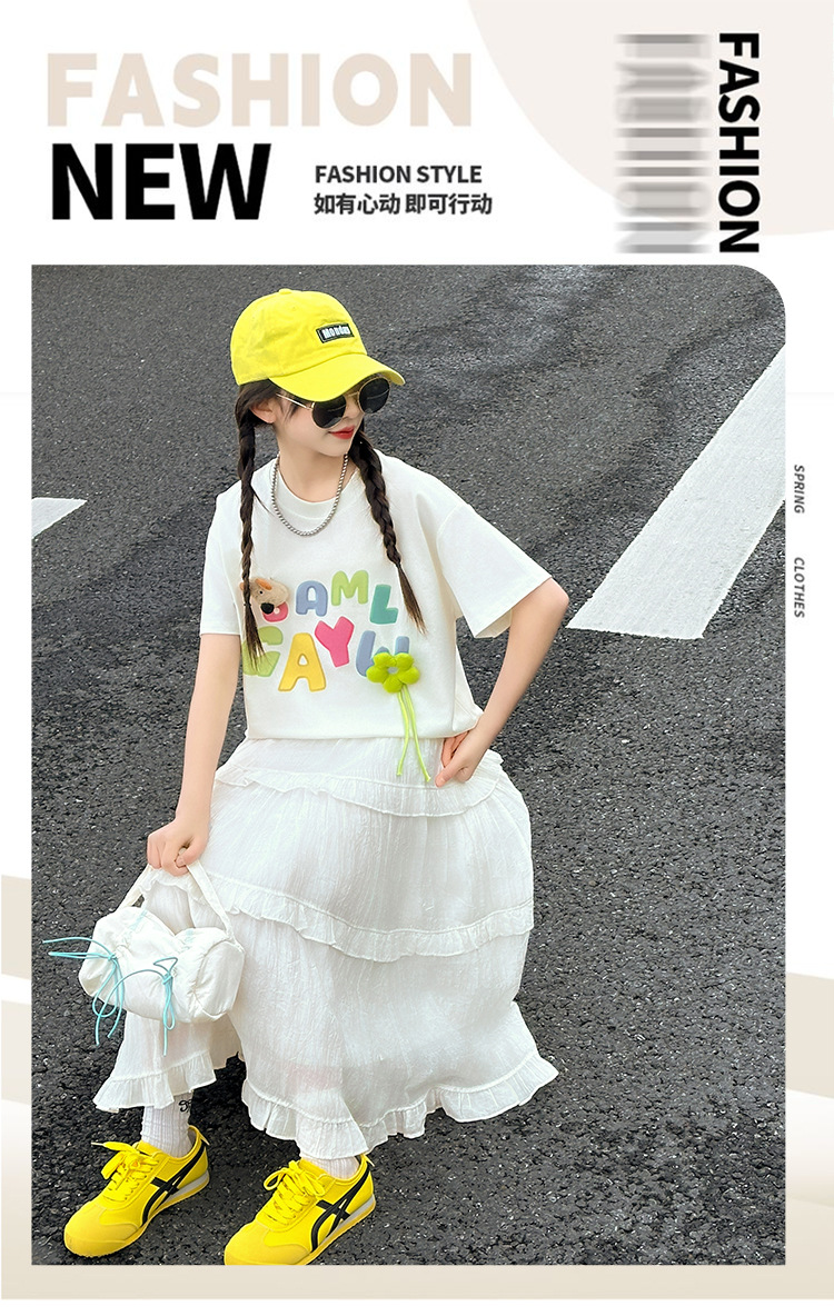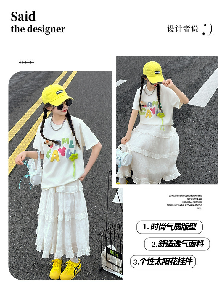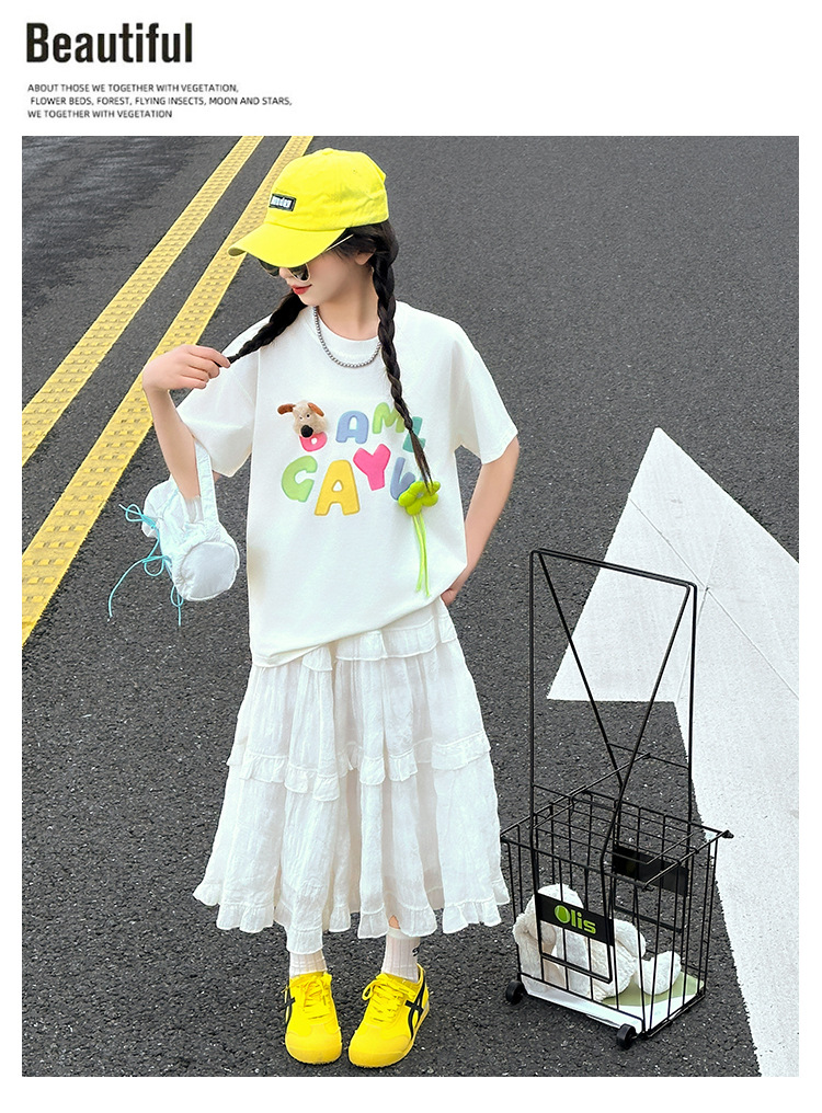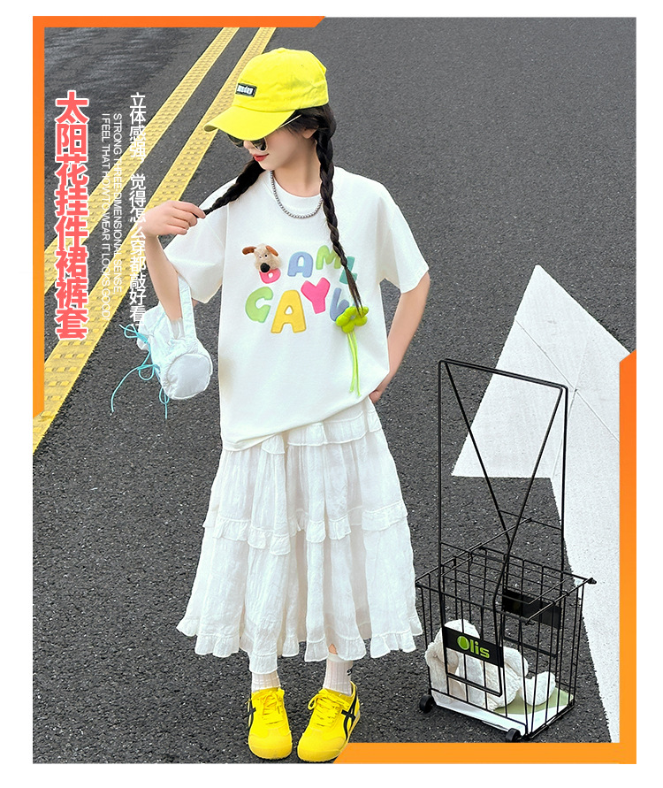 소녀 만화 편지 반팔 티셔츠 세트 2025 새로운 어린 소녀 달콤한 3 차원 인형 탑 스커트스토어 가기