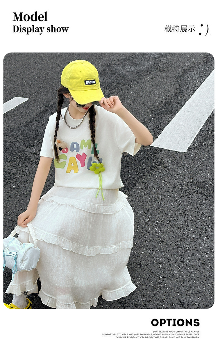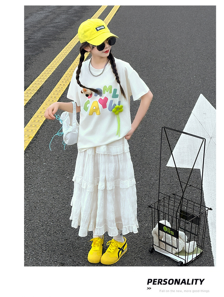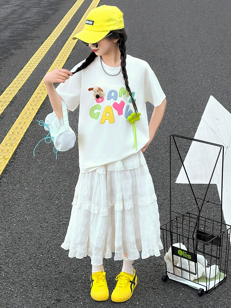 소녀 만화 편지 반팔 티셔츠 세트 2025 새로운 어린 소녀 달콤한 3 차원 인형 탑 스커트