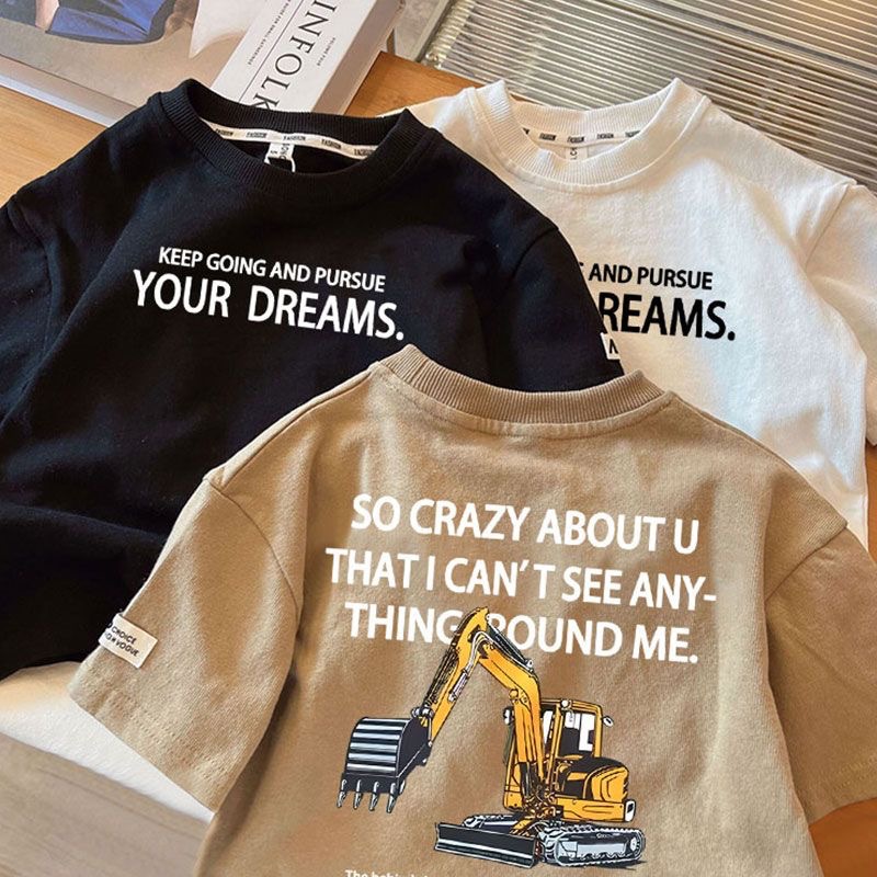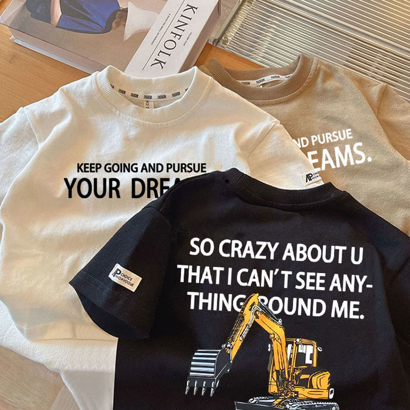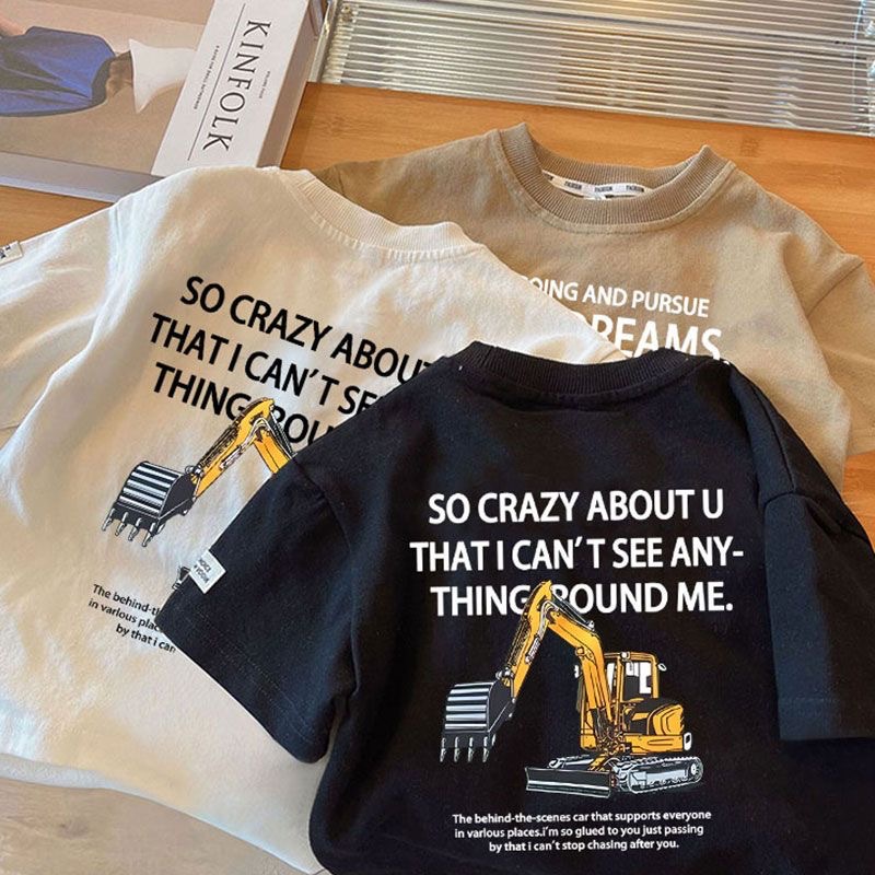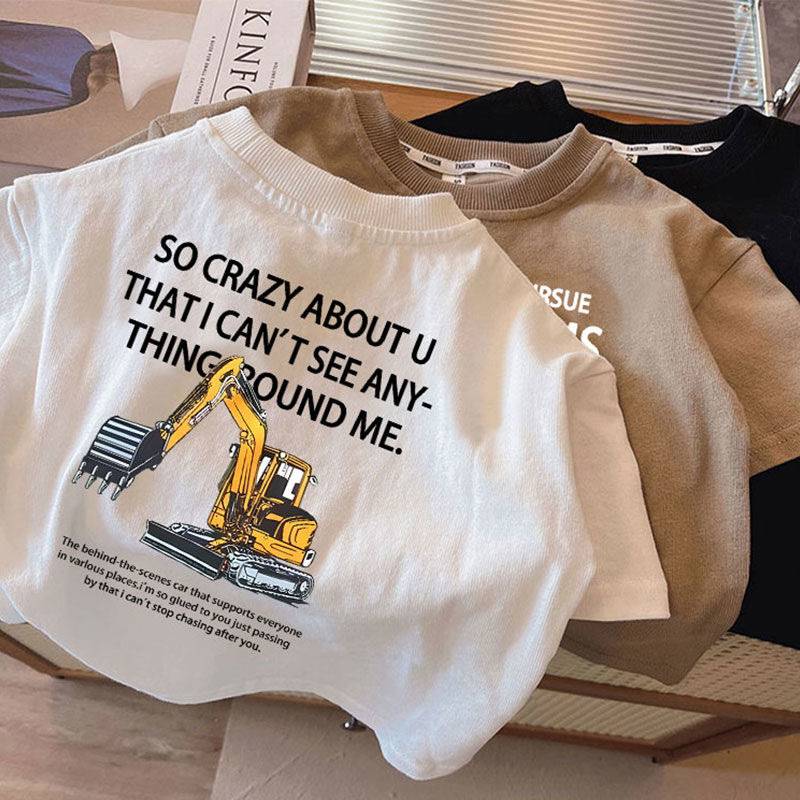 남아용 굴착기 반팔 티셔츠 2025 여름 어린이 공사차량 패턴 상의 아기 순면 반팔 티셔츠 만화스토어 가기