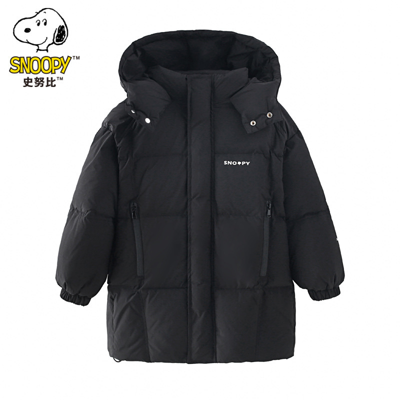 스누피 아동용 다운 재킷 두꺼운 2024 새로운 한국식 중간 길이 중대형 아동용 겨울 후드 따뜻한 재킷