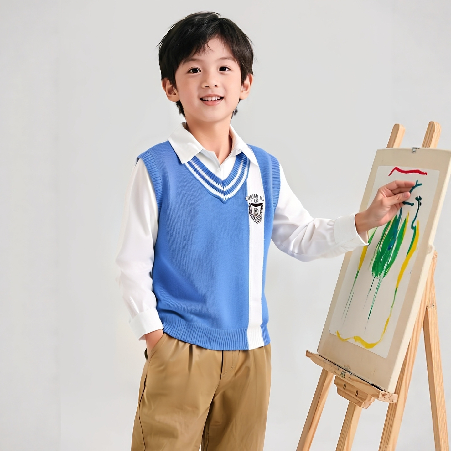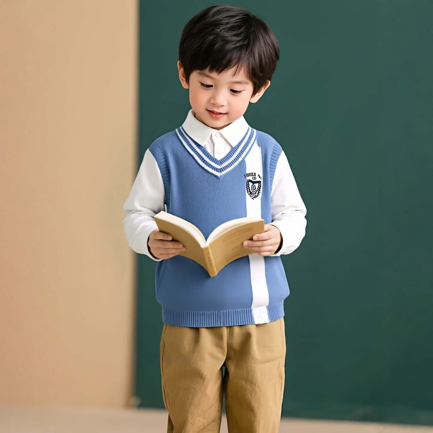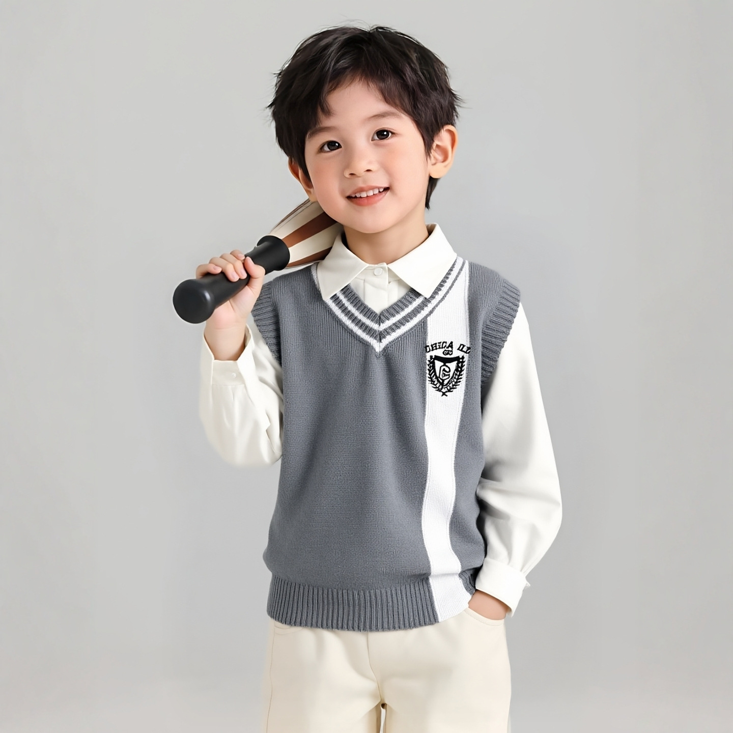2025 봄 가을 배색 컬리지 스타일 남아 순면 니트 조끼 중대형 아동용 조끼 영국 스타일스토어 가기