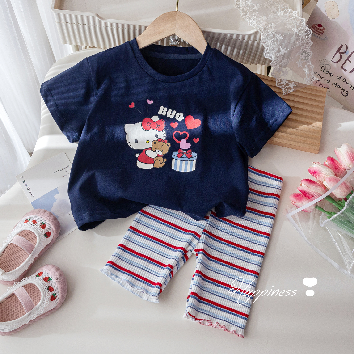 소녀 여름 한국식 세트 세련된 귀여운 만화 인쇄 반팔 티셔츠 유행 줄무늬 바지 투피스 세트