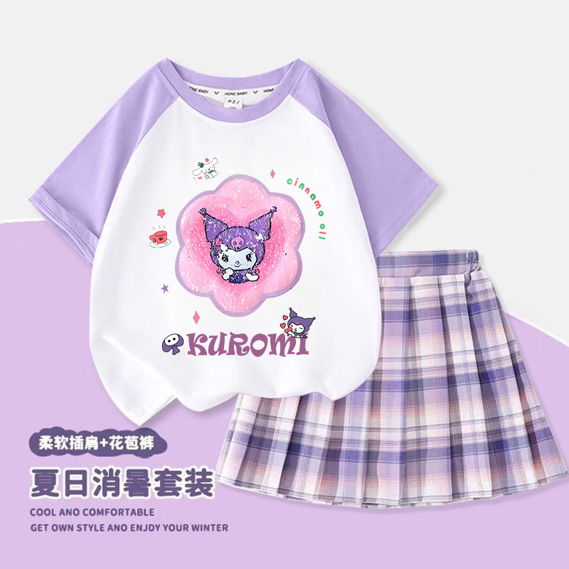 • (보라색과 흰색 투피스 세트) 상의 + 체크무늬 스커트