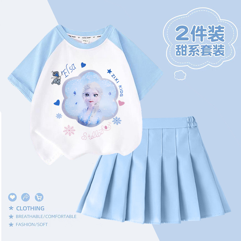 • (파란색과 흰색 투피스 세트) 상의 + 단색 스커트