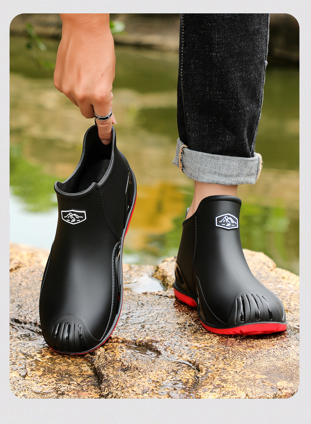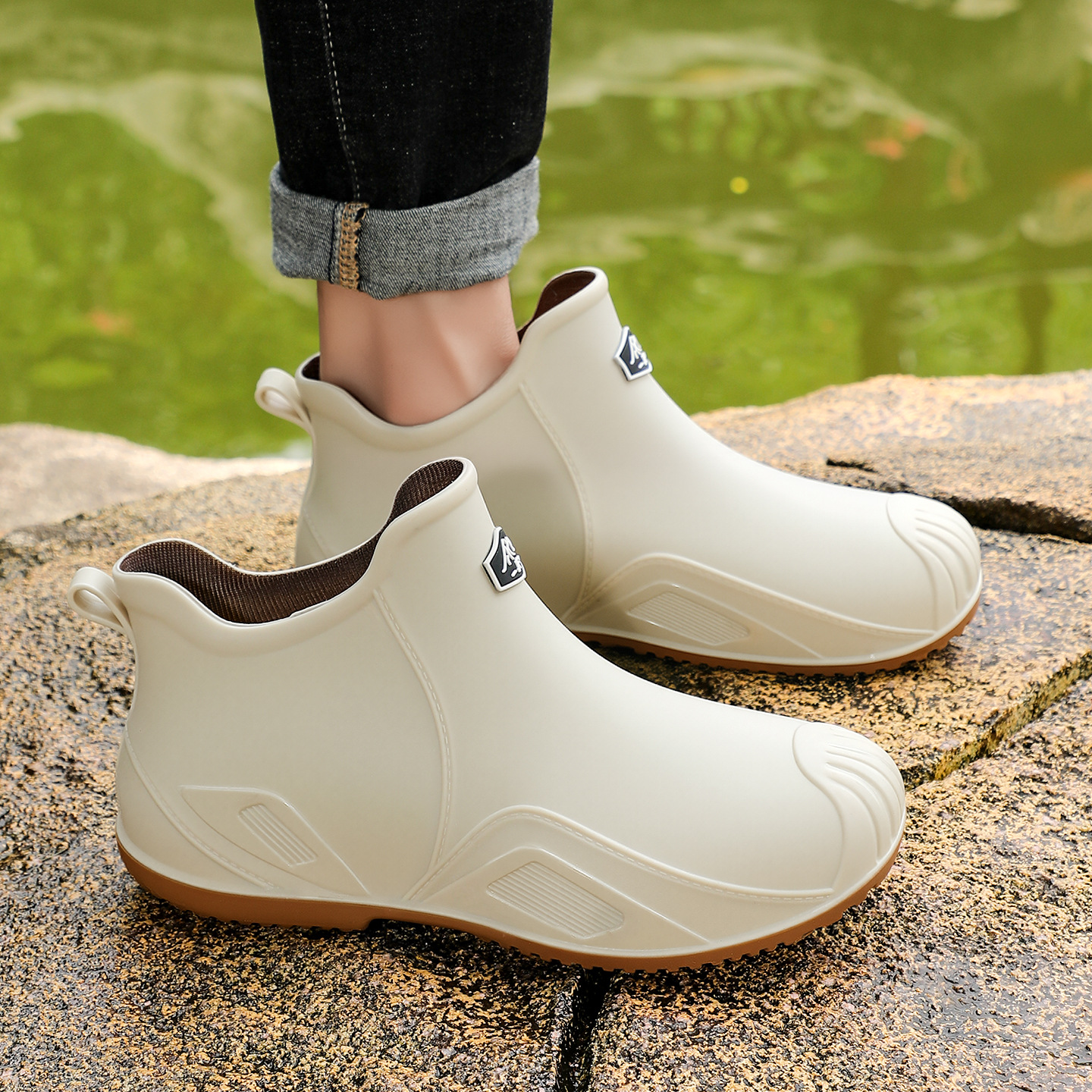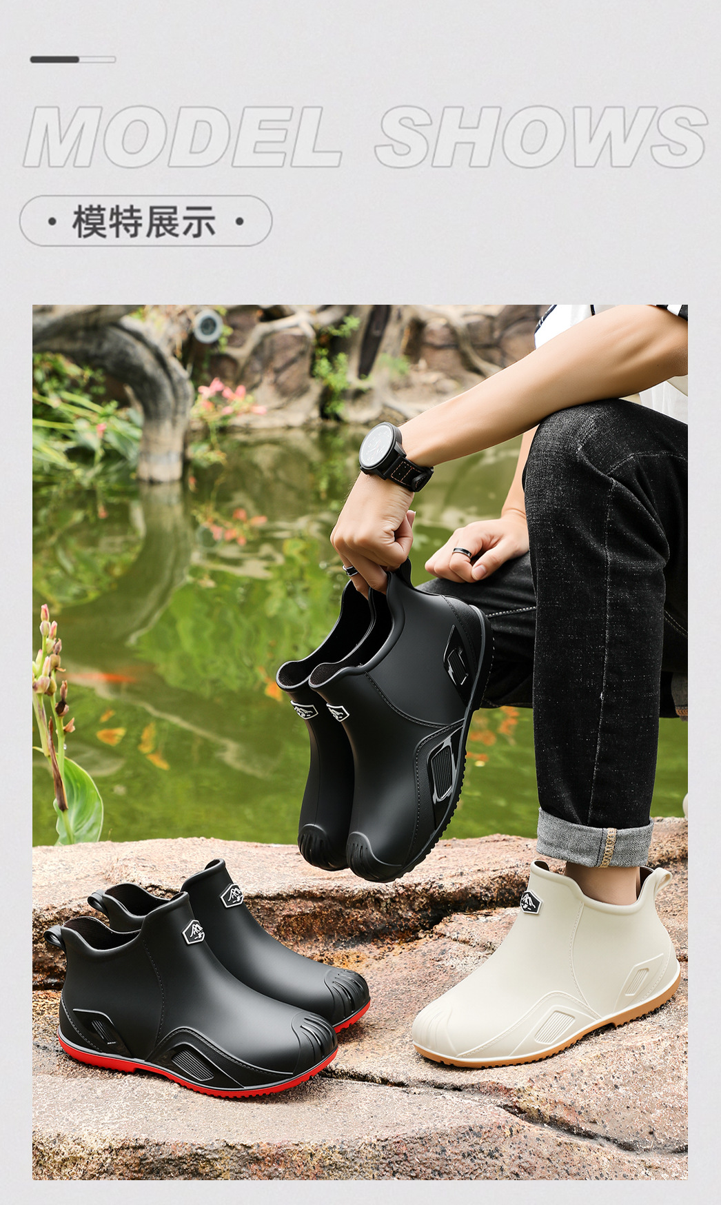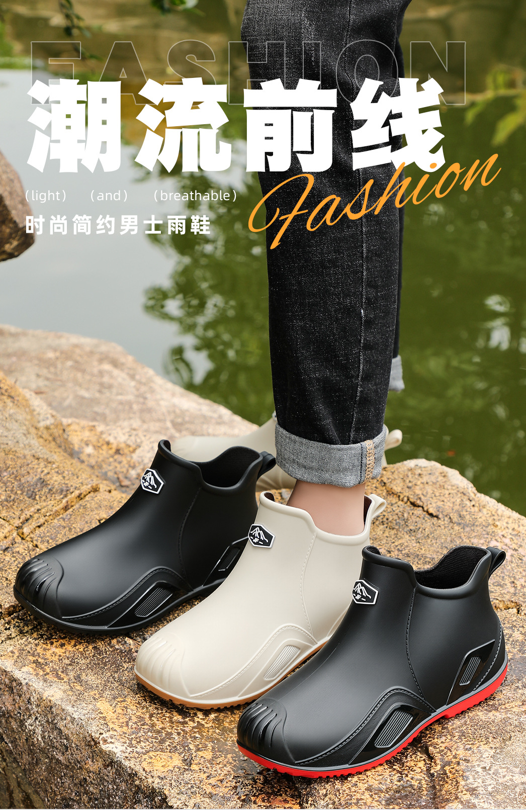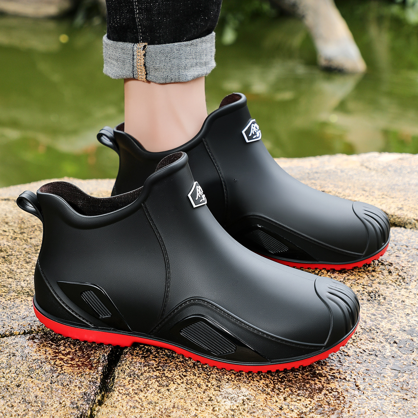 무료 배송 수출용 캐주얼 내구성 패션 짧은 남성용 레인슈즈 두꺼운 주방용 미끄럼 방지 방수 낚시 신발스토어 가기