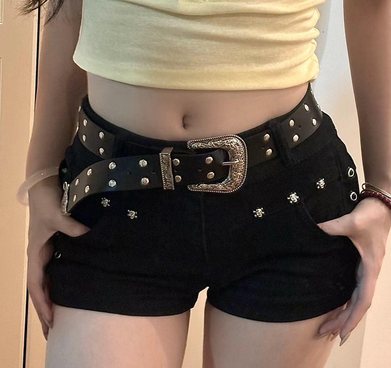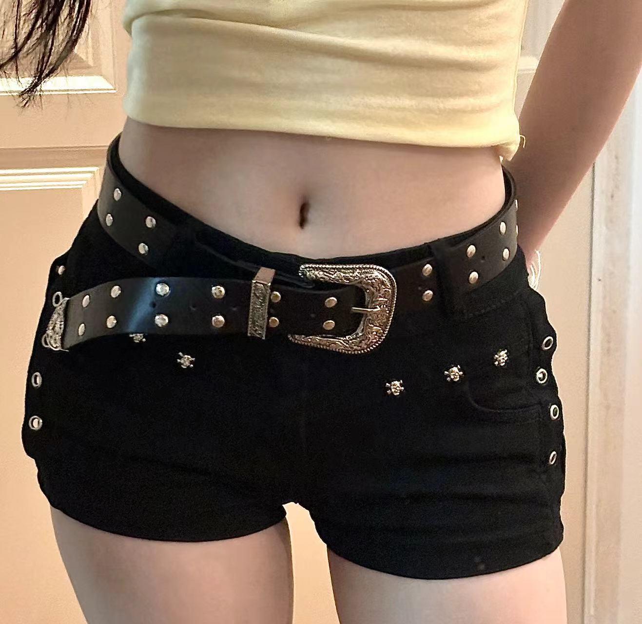 봄과 가을 여성용 아메리칸 핫걸 블랙 울트라 쇼트 청바지 리벳 로우 웨이스트 슬리밍 디자인 힙 커버 핫팬츠 여름스토어 가기