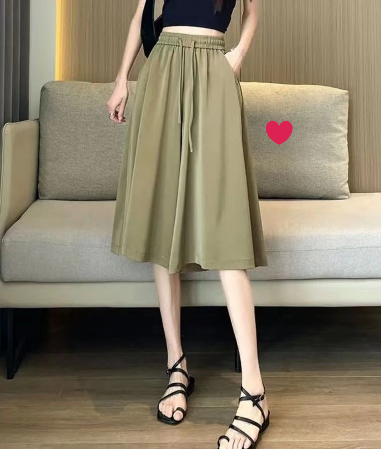 아이스 실크 카프리 바지 여자 2025 년 여름 신작 한국 스타일 높은 허리 얇은 슬리밍 넓은 다리 바지 느슨한 캐주얼 사이즈 바지