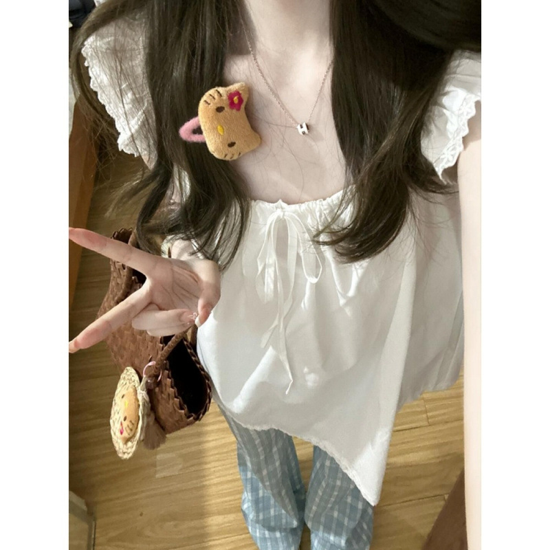 부드러운 달콤한 활 플라잉 슬리브 셔츠 여성용 여름 쁘띠 디자인 센스 니쉬 인형 셔츠 탑