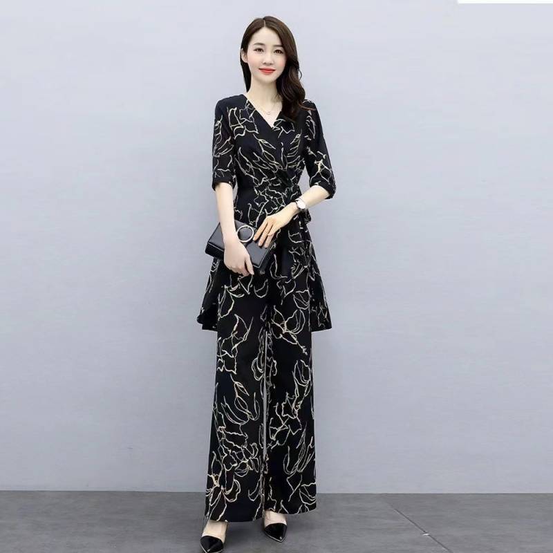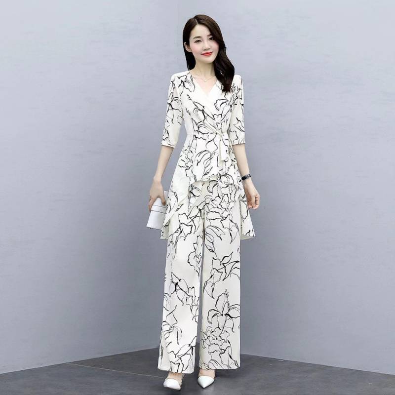 우아한 세트 여름 2025 플러스 사이즈 새로운 도착 와이드 레그 바지 세련된 패션 쉬폰 셔츠 느슨한 허리 투피스 세트 트렌디스토어 가기