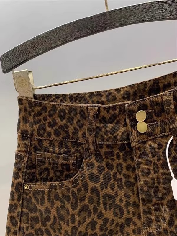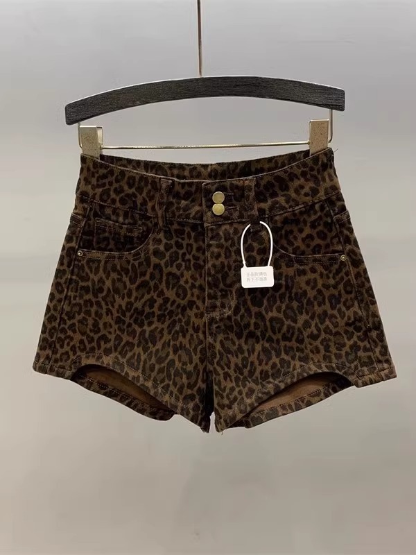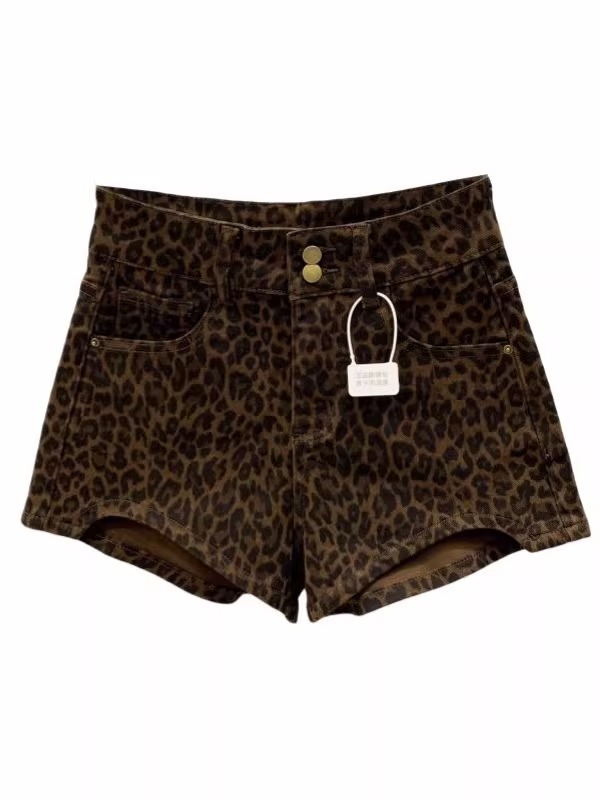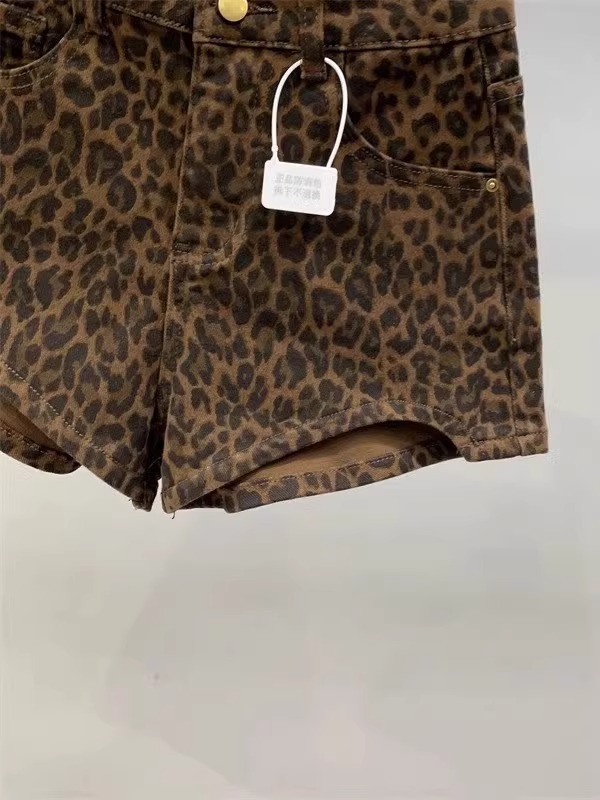 아메리칸 스타일 레오파드 무늬 스파이스 걸스 데님 반바지 여성 여름 새로운 하이 웨이스트 슬림 핏 슬리밍 A 라인 힙합 가방 핫 바지스토어 가기