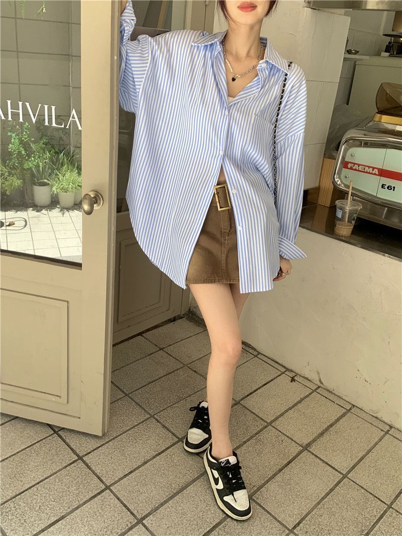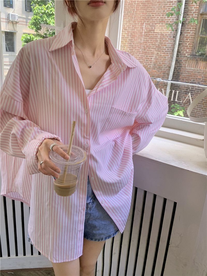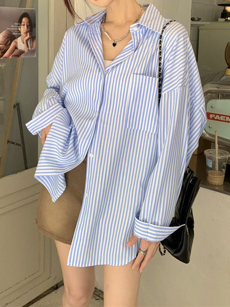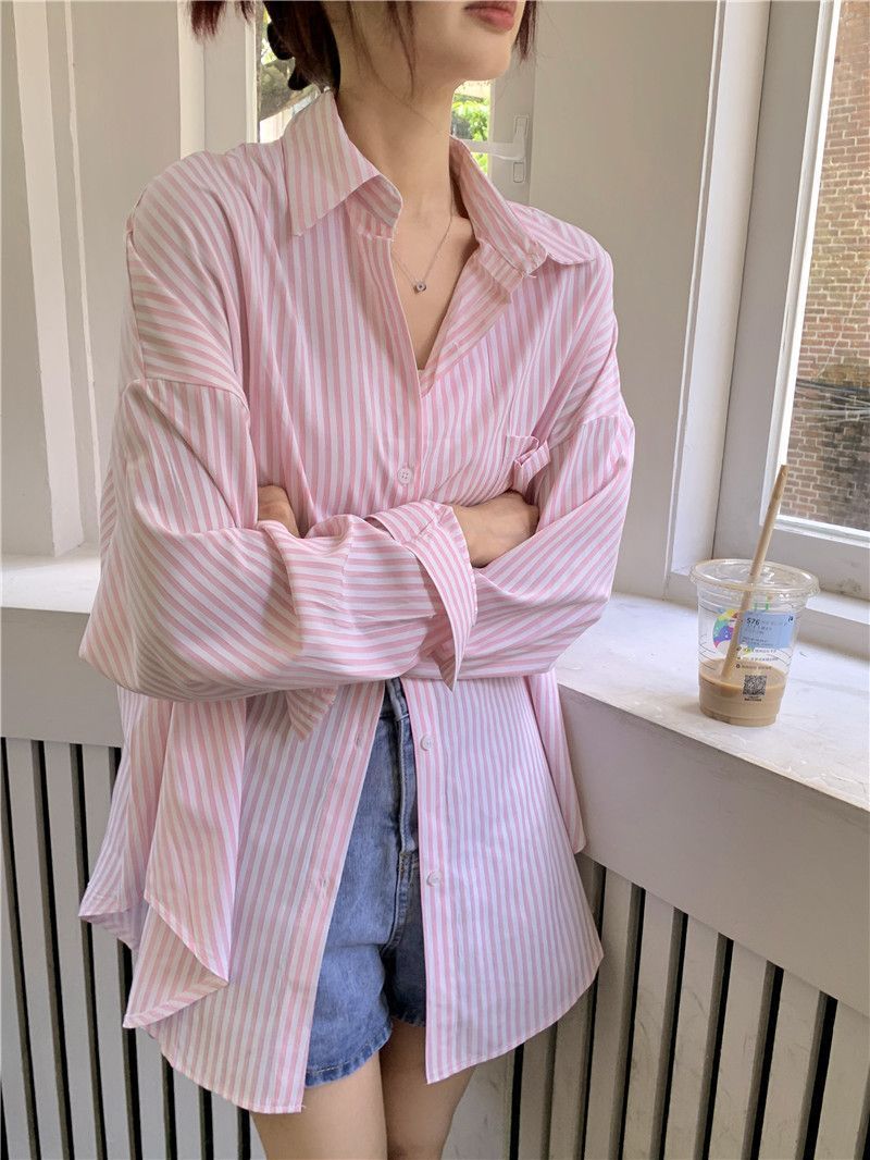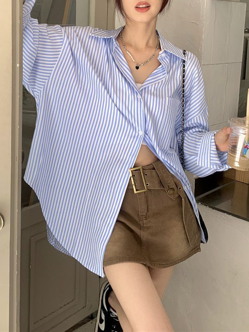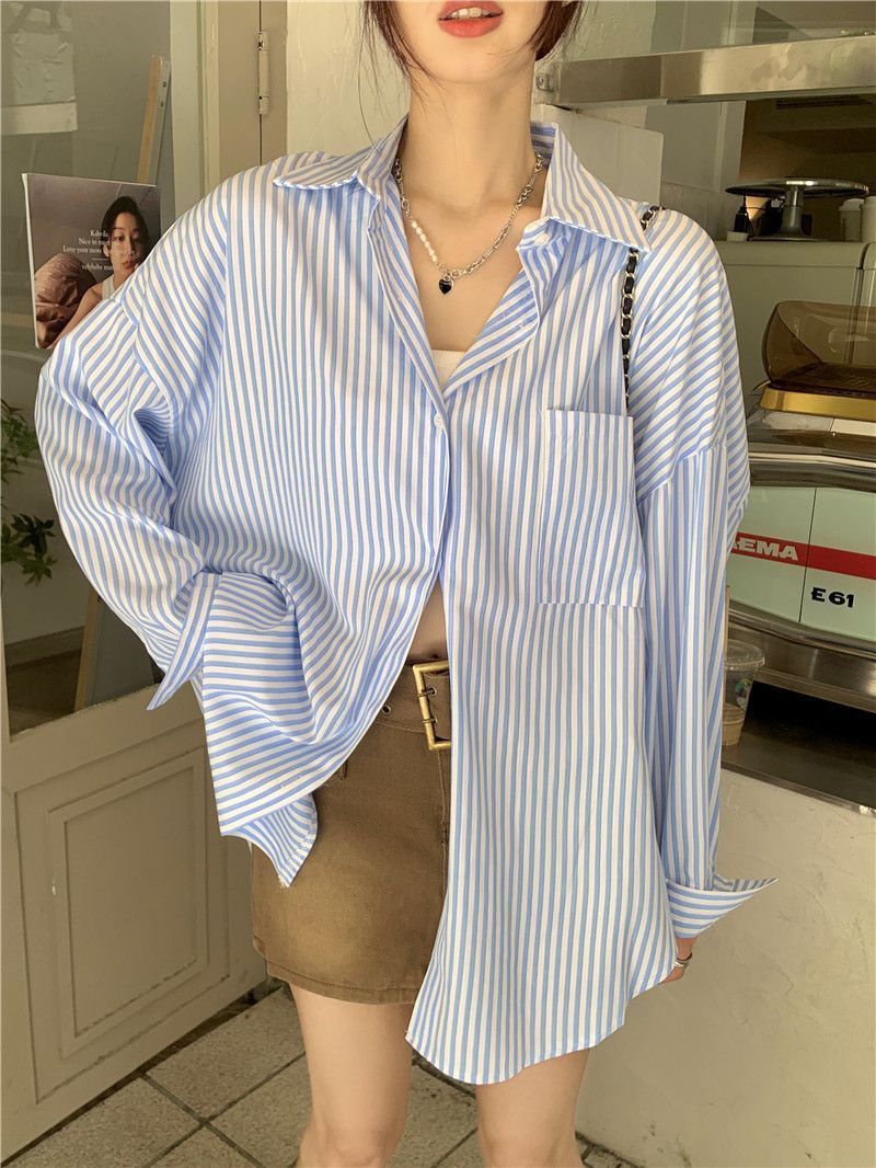 한국 스타일 게으른 스타일 줄무늬 셔츠 여성의 2025 새로운 봄과 여름 달콤한 디자인 센스 캐주얼 루즈 셔츠 재킷스토어 가기
