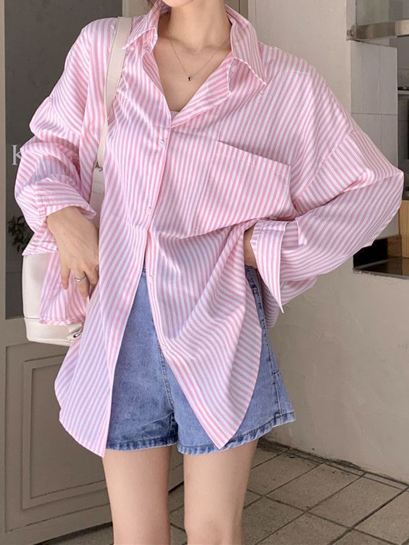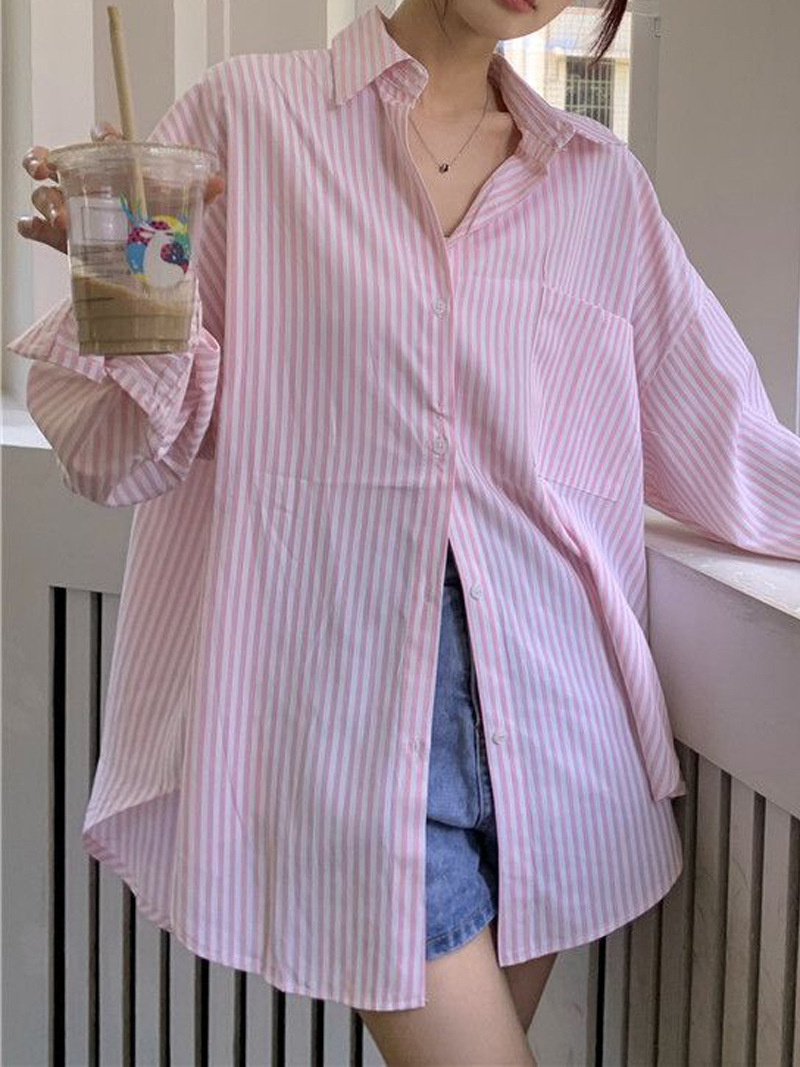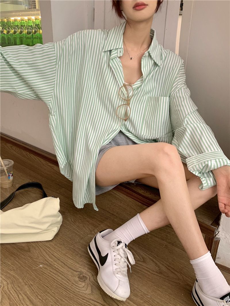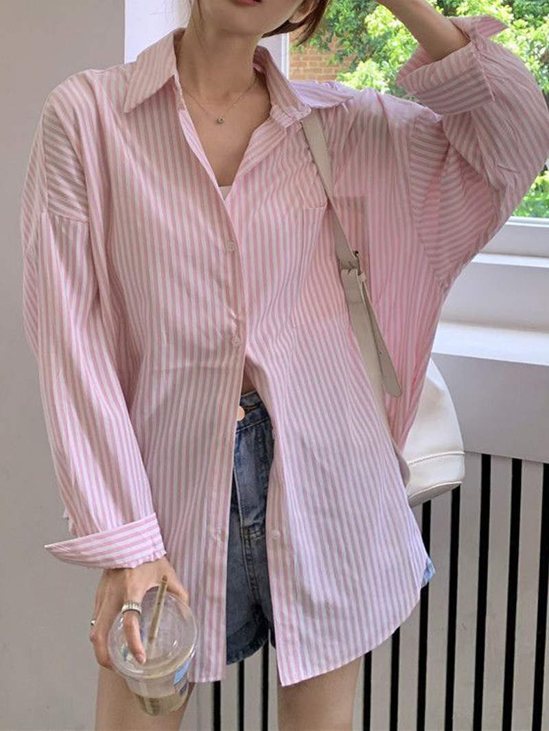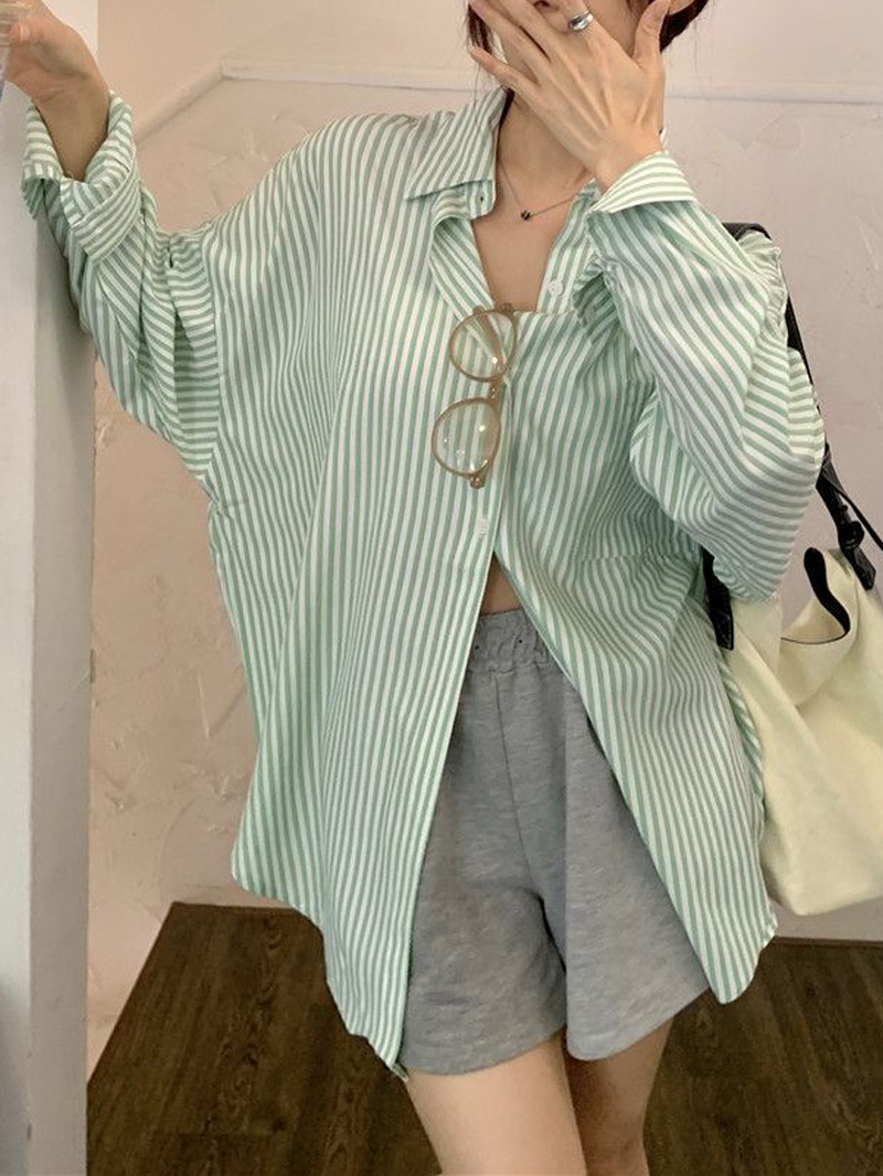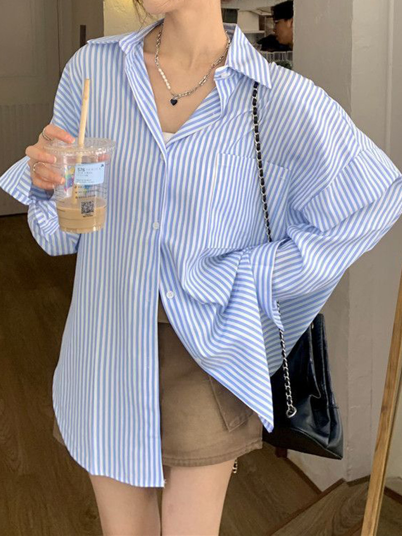 한국 스타일 게으른 스타일 줄무늬 셔츠 여성의 2025 새로운 봄과 여름 달콤한 디자인 센스 캐주얼 루즈 셔츠 재킷스토어 가기