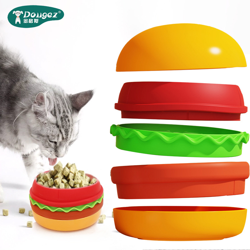 卖点:可爱汉堡造型,由碗底,慢食碗,舔食垫,底垫和上倾斜碗组成,上下碗密胺材质,中层夹心是硅胶材质